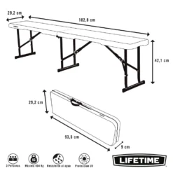 Banco plegable por la mitad LIFETIME de polietileno de alta densidad con protección UV. Estructura de acero con revestimiento en polvo antióxido. Ideal para exterior e interior, como asiento de mesa o para cualquier actividad, alta resistencia a la intemperie. Ligero (7 Kg, compacto y con asa de transporte. Medidas abierto: 183x29x42 cm, cerrado: 93,5x29x9 cm, peso máximo soportado: 454 Kg.