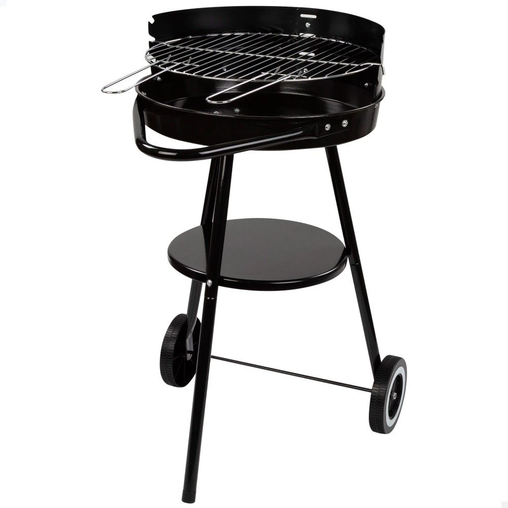 Barbacoa de carbón portátil Aktive. Fabricada en metal esmaltado en color negro de Ø42×76,5 cm. Con estructura metálica de 3 patas (1 fija y 2 ruedas y con superficie auxiliar. Incorpora parrilla con dos mangos extraíbles y la barbacoa tiene 3 alturas para colocar la parrilla más o menos cerca de las brasas. De poco peso y con asa de transporte frontal para mover cómodamente. Montaje fácil y rápido (se necesitan herramientas.