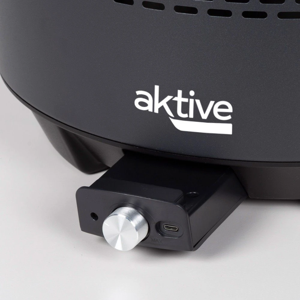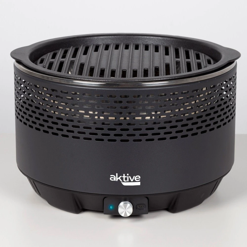 Barbacoa de sobremesa con baja emisión de humo Aktive Barbecue. Es color negro y está fabricada de acero inoxidable. Incluye parrilla extraíble de hierro, recipiente extraíble con rejilla para colocar el carbón y base extraíble para la ceniza. Cuenta con botón para regular la temperatura y con un sistema de ventilación eficiente que funciona con pilas o mediante cable USB (no incluidos para conseguir una baja emisión de humo mientras se cocinan los alimentos a la brasa. Permite cocinar los alimentos de dos formas diferentes: hornearlos en la parte interior de la barbacoa o cocinarlos a la brasa sobre la parrilla. Tiene un tamaño pequeño y manejable e incluye bolsa de transporte y almacenaje con asas para transportar con facilidad. Perfecta para hacer barbacoas en el balcón o para llevarla de picnic. Aconsejable instalar sobre una superficie nivelada, estable y resistente al calor. Muy fácil de usar y limpiar gracias a sus accesorios extraíbles.