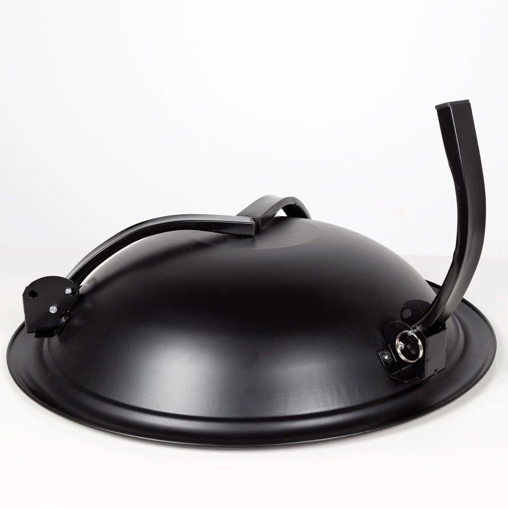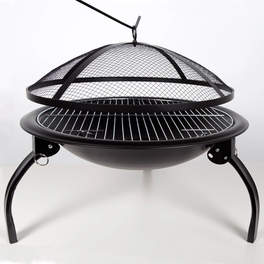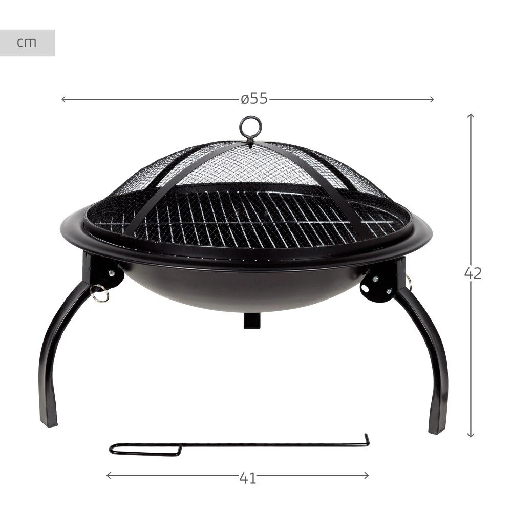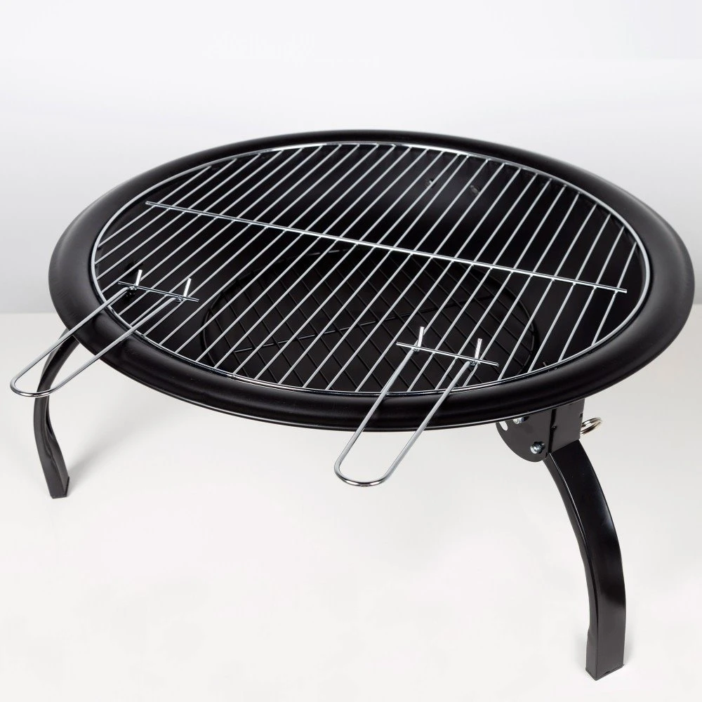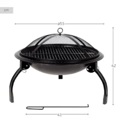 - Brasero exterior portátil Aktive Barbecue 2 en 1. Mide Ø55×42 cm, es color negro, tiene forma circular y se sostiene del suelo por tres patas plegables