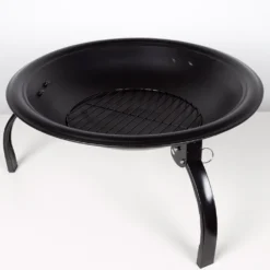 Brasero de exterior portátil Aktive Barbecue. Es color negro y está fabricado de acero. Se compone de un brasero circular sostenido por tres patas plegables (para plegarlas se debe tirar de la anilla. Incluye dos parrillas de acero cromado (una para colocar sobre ella los alimentos y otra para colocar el carbón o la leña, dos mangos extraíbles, un atizador para avivar el fuego y una rejilla antichispas. Perfecto para aprovechar al máximo las zonas exteriores, tanto como elemento decorativo como barbacoa. Se debe instalar sobre una superficie nivelada y estable.
