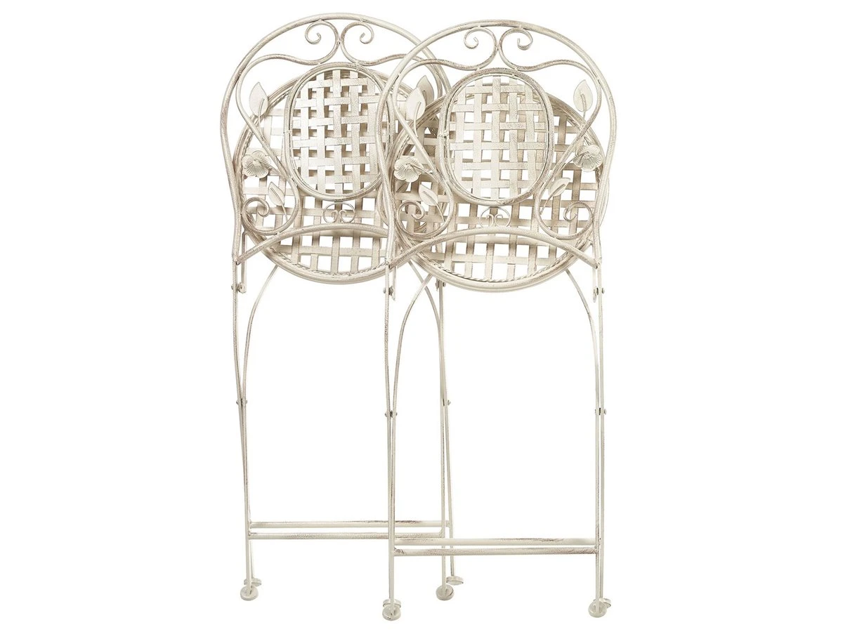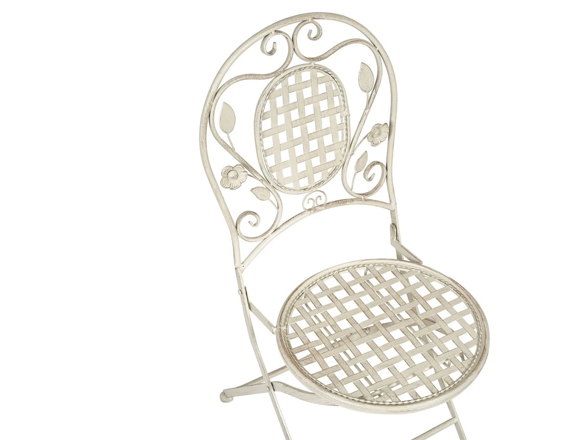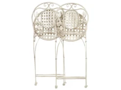 Conjunto de 2 sillas de balcón. Añade un toque de estilo provenzal a tu balcón o jardín con este conjunto de 2 sillas de balcón. Fabricadas a partir de hierro con recubrimiento en polvo, presentan un efecto envejecido y un diseño con adornos florales. Combínalas con sillas a juego y crea el lugar perfecto para el desayuno o el almuerzo al aire libre. Las sillas son plegables, por lo que puedes guardarlas con facilidad durante la temporada baja. Detalles: Tipo de Producto: Silla de jardín Estilo: Retro Color: Blanco Tonalidad: Blanco crema Tipo de material: Metal Material principal: Hierro Material de las patas: Metal Material del asiento: Metal Apoyabrazo: No Acabado: Revestimiento en polvo Plegable: Sí Apilable: No Dimensiones: Profundidad: 52 cm Altura del asiento: 42 cm Ancho: 43 cm Altura: 93 cm Superficie del asiento: 40×40 cm Peso: 5 kg Capacidad de peso: 120 kg La oferta incluye: 2 x Silla Ventajas: Estilo retro, Resistencia UV, Fabricación sólida y precisa, Plegable para un fácil almacenamiento, Compacto y perfecto para espacios limitados , Patas con tapas anti-deslizantes Información de montaje: No requiere montaje Información adicional: Abre el embalaje con cuidado, especialmente cuando utilizas herramientas afiladas o puntiagudas, ya que pueden dañar el producto, El efecto desgastado o las manchas visibles son intencionales y no se consideran un defecto. Texto de resistencia: Gracias a su resistencia al agua, puedes utilizar el producto al aire libre y dejarlo a la intemperie durante lluvias ligeras. Si no es posible guardarlo en un lugar cerrado y protegido, recomendamos utilizar una funda protectora. La exposición prolongada a la humedad puede provocar daños en el mueble. Resistencia: Agua ligera / humedad Consejos de mantenimiento: Hierro: 1.Quite las tapas protectoras con regularidad para que salga todo el líquido, déjelas secar y utilice un spray anticorrosión si es necesario 2.Limpiar con detergentes suaves 3.Los muebles de acero y sus elementos no deben exponerse al agua. De lo contrario, existe la posibilidad de que el agua oxidada salga de las tuberías del marco 4.Cuando no estén en uso, los muebles deben guardarse en el interior o bajo una cubierta protectora 5.Para aumentar la durabilidad del artículo, manténgalo seco y recuerde la limpieza regular 6.Cualquier daño a la capa de pintura exterior debe protegerse de la humedad 7.Para garantizar la protección contra la corrosión, evite los limpiadores alcalinos o ácidos. Después de limpiar, secar bien.