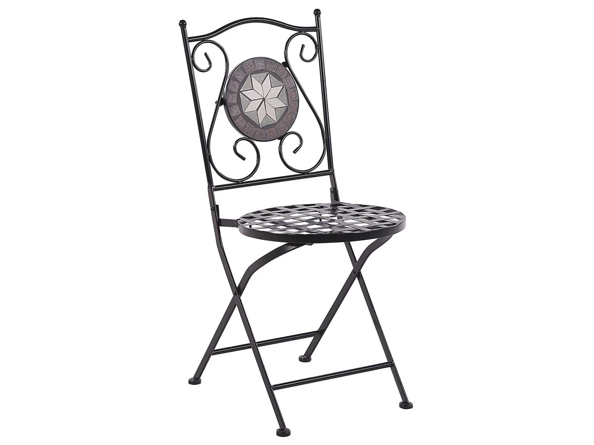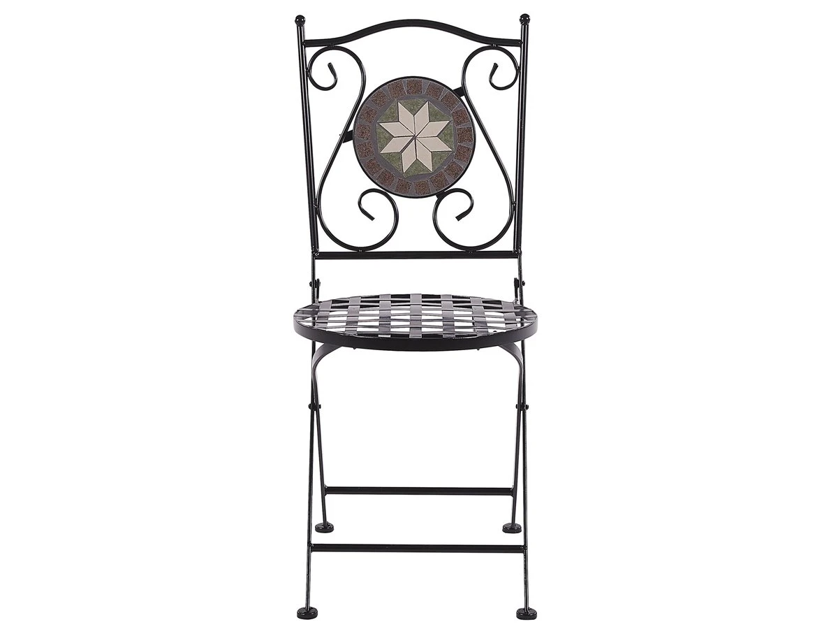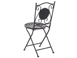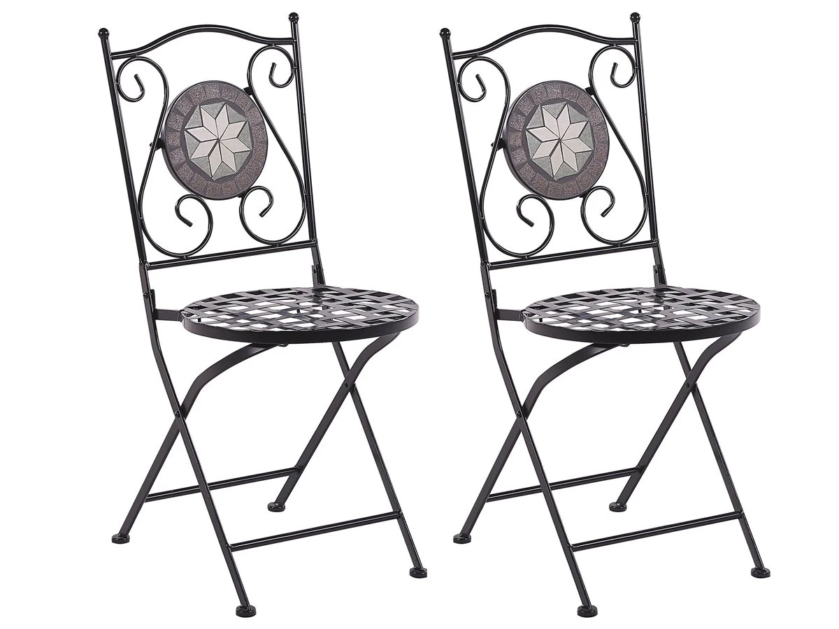 Juego de sillas. Disfruta de un momento de descanso al aire libre con este conjunto de 2 sillas de balcón. Están fabricadas de metal resistente al agua y fácil de limpiar. El respaldo tallado y el patrón de mosaico con azulejos de cerámica llaman la atención. La función plegable facilita el almacenamiento. Detalles: Tipo de Producto: Silla de jardín Estilo: Retro Color: Negro Tipo de material: Metal Material principal: Hierro Material adicional: Cerámica Material de las patas: Metal Material del asiento: Metal Apoyabrazo: No Acabado: Revestimiento en polvo Plegable: Sí Apilable: No Dimensiones: Profundidad: 45 cm Altura del asiento: 45 cm Ancho: 38 cm Altura: 89 cm Superficie del asiento: 38×38 cm Peso: 7 kg Capacidad de peso: 120 kg La oferta incluye: 2 x Silla Ventajas: Ideal para uso al aire libre, Plegable, ahorra espacio Información de montaje: Requiere montaje parcial Texto de resistencia: El producto es resistente al agua, lo que significa que no se dañará expuesto a la lluvia o en contacto con otros líquidos. Puede dejarlo al aire libre incluso durante fuertes lluvias o humedad. Durante la temporada de invierno es recomendable almacenar el producto en el interior o bajo una cubierta impermeable. Resistencia: Intemperie Consejos de mantenimiento: Hierro: 1.Quite las tapas protectoras con regularidad para que salga todo el líquido, déjelas secar y utilice un spray anticorrosión si es necesario 2.Limpiar con detergentes suaves 3.Los muebles de acero y sus elementos no deben exponerse al agua. De lo contrario, existe la posibilidad de que el agua oxidada salga de las tuberías del marco 4.Cuando no estén en uso, los muebles deben guardarse en el interior o bajo una cubierta protectora 5.Para aumentar la durabilidad del artículo, manténgalo seco y recuerde la limpieza regular 6.Cualquier daño a la capa de pintura exterior debe protegerse de la humedad 7.Para garantizar la protección contra la corrosión, evite los limpiadores alcalinos o ácidos. Después de limpiar, secar bien.