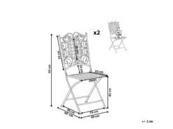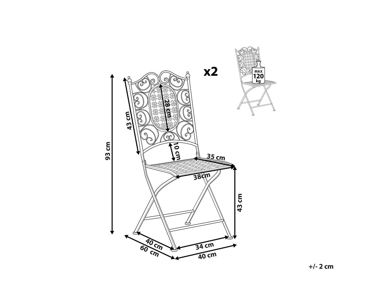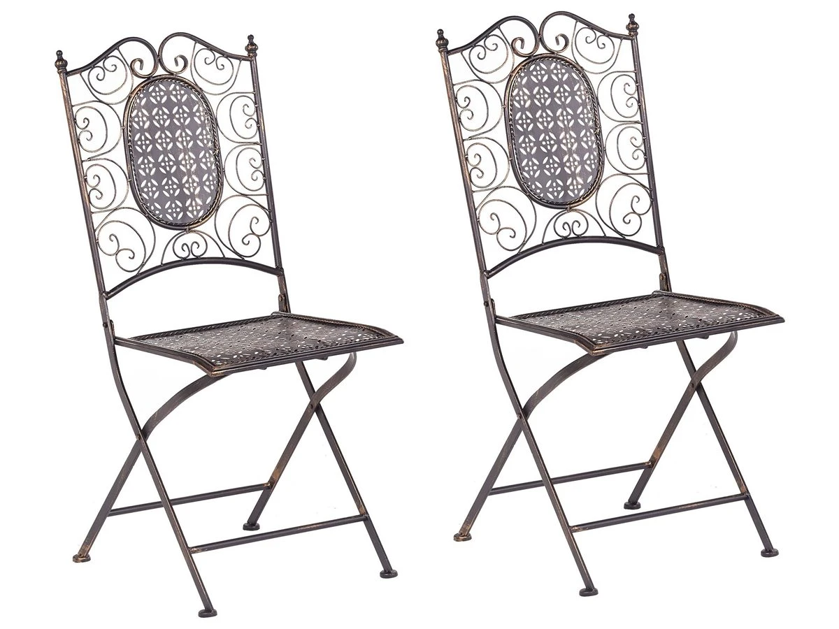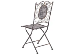 Juego de 2 sillas de aluminio de inspiración vintage. Elegante y práctico, este conjunto de dos sillas es perfecto para cualquier jardín, terraza o balcón. Fabricado en aluminio ligero y duradero, presenta un acabado en pintura en polvo marrón que aporta una mayor resistencia. Las sillas cuentan con unas líneas curvilíneas de inspiración victoriana que combinan bien en ambientes vintage. Combínalas con una mesa a juego y crea un comedor al aire libre. Detalles: Tipo de Producto: Silla de jardín Estilo: Retro Color: Marrón Tonalidad: Marrón oscuro Tipo de material: Metal Material principal: Aluminio Material de las patas: Metal Material del asiento: Metal Apoyabrazo: No Acabado: Revestimiento en polvo Plegable: No Apilable: No Dimensiones: Profundidad: 53 cm Altura del asiento: 41 cm Ancho: 43 cm Altura: 90 cm Superficie del asiento: 38×38 cm Peso: 5 kg Capacidad de peso: 120 kg La oferta incluye: 2 x Silla Ventajas: Diseño atemporal, Detalles perfectos, Gran durabilidad, Apariencia moderna y calidad durante muchos años, Ideal para uso al aire libre Información de montaje: Requiere montaje completo. 5-15 min. Información adicional: El efecto desgastado o las manchas visibles son intencionales y no se consideran un defecto. Texto de resistencia: Gracias al acabado especial, la superficie del producto es resistente a la oxidación. Esto significa que se puede utilizar en exteriores. Cuando el producto no esté en uso, se recomienda cubrirlo con una cubierta o colocarlo en un lugar seco. Resistencia: Intemperie Consejos de mantenimiento: Aluminio: 1.Fuera de temporada, utilice una funda protectora o guarde los muebles en un lugar fresco y seco 2.Limpiar con agua jabonosa y detergentes suaves. Quitar el polvo con un paño suave.