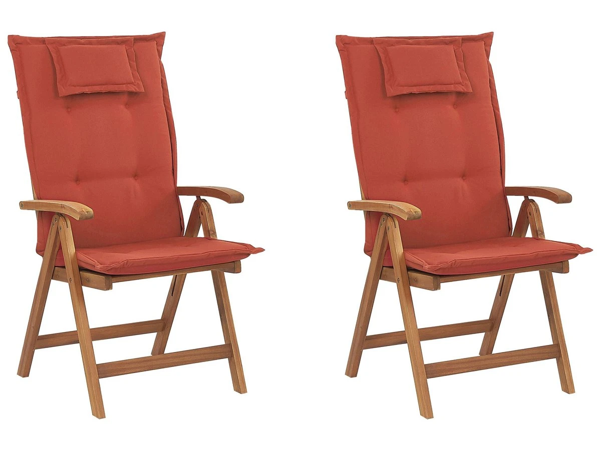 Conjunto de 2 sillas de jardín con cojines. Este conjunto de 2 de sillas de jardín, perfecto para cualquier espacio al aire libre, encaja bien con cualquier estilo de decoración tradicional. Las sillas están fabricadas de madera de acacia, son duraderas y soportan el uso prolongado y las condiciones climáticas adversas. Incluyen cojines a juego que garantizan la máxima comodidad de asiento. Son plegables, lo que facilita su almacenamiento fuera de temporada y permite ahorrar espacio. Detalles: Tipo de Producto: Silla de jardín Estilo: Tradicional Color: Madera clara Tonalidad: Rojo oscuro Tipo de material: Madera maciza Material principal: Madera de acacia Material adicional: Poliéster Material de las patas: Madera maciza Material del asiento: Tejido Composición del Material: 100% Poliéster Apoyabrazo: Sí Acabado: Aceitado Plegable: Sí Apilable: No Dimensiones: Altura del apoyabrazos: 67 cm Profundidad: 69 cm Espesor del asiento: 5 cm Altura del asiento: 44 cm Ancho: 54 cm Altura: 105 cm Superficie del asiento: 48×43 cm Peso: 9 kg Capacidad de peso: 160 kg La oferta incluye: 2 x Silla, 2 x Cojines del asiento Ventajas: Respaldo ajustable en 6 posiciones, Las tiras ofrecen una fijación segura, Cómodos apoyabrazos, Materiales pensados para el uso en el exterior, Resistencia UV 5 (ISO 105-B02, Plegable para un fácil almacenamiento Información de montaje: No requiere montaje Información adicional: Por favor, ten en cuenta que la madera es un producto natural, y cada pieza puede presentar ligeras variaciones. Las diferencias en el color o la textura, como las arrugas u otras características naturales, no se consideran un defecto ni tampoco una base de reclamación, El producto viene con un libro de cuidados detallado para ayudarte a mantener tus muebles en las mejores condiciones durante muchos años. Consulta estos consejos para garantizar el mantenimiento adecuado de tus muebles nuevos – encontrarás las instrucciones de mantenimiento junto con el manual de montaje. Texto de resistencia: Gracias a su resistencia al agua, puedes utilizar el producto al aire libre y dejarlo a la intemperie durante lluvias ligeras. Si no es posible guardarlo en un lugar cerrado y protegido, recomendamos utilizar una funda protectora. La exposición prolongada a la humedad puede provocar daños en el mueble. Resistencia: Agua ligera / humedad Consejos de mantenimiento: Madera de acacia: 1.Durante el invierno o en condiciones climáticas adversas, utilice una funda protectora o guarde los muebles en el interior 2.Los muebles con acabado de aceite deben volverse a engrasar antes de ponerlos en uso y al menos una vez al año, especialmente en el clima húmedo 3.Limpiar con un limpiador suave y un paño suave en la dirección de la veta. Secar con un paño inmediatamente después de limpiar. Poliéster: 1.Aspire con un accesorio adecuado 2.Limpiar con champú seco y una esponja húmeda o un limpiador suave 3.Cuando no esté en uso, manténgalo en un lugar limpio y seco para protegerlo de las condiciones atmosféricas.