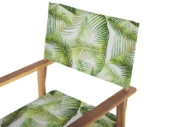 Juego de sillas. Este conjunto de 2 sillas de jardín aporta un ambiente de Hollywood a cualquier sala de estar o área exterior. Está fabricado a partir de madera de acacia duradera y resistente de acabado natural. El asiento y el respaldo de tela consiguen que las sillas parezcan sacadas directamente de un set de filmación. El patrón de hojas llama la atención de los invitados. Es plegable, lo que permite ahorrar espacio. Incluye un juego de telas de repuesto. Detalles: Tipo de Producto: Silla de jardín Estilo: Moderno Color: Verde Tonalidad: Verde claro Tipo de material: Madera maciza Material principal: Madera de acacia Material de las patas: Madera maciza Material del asiento: Tejido Composición del Material: 100% Poliéster Apoyabrazo: Sí Acabado: Aceitado Plegable: Sí Apilable: No Dimensiones: Altura del apoyabrazos: 64 cm Profundidad: 50 cm Altura del asiento: 48 cm Ancho: 50 cm Altura: 91 cm Superficie del asiento: 44×46 cm Peso: 4 kg Capacidad de peso: 120 kg La oferta incluye: 2 x Silla, 4 x Tela extraíble Ventajas: Fundas intercambiables incluidas, Diseño tradicional con un toque moderno, Ideal para todo tipo de decoración, Ideal para uso en interiores y exteriores, Resistencia UV 4 (ISO 105-B02, Plegable, ahorra espacio Información de montaje: Requiere montaje parcial. 20-40 min. Información adicional: Por favor, ten en cuenta que la madera es un producto natural, y cada pieza puede presentar ligeras variaciones. Las diferencias en el color o la textura, como las arrugas u otras características naturales, no se consideran un defecto ni tampoco una base de reclamación, El producto viene con un libro de cuidados detallado para ayudarte a mantener tus muebles en las mejores condiciones durante muchos años. Consulta estos consejos para garantizar el mantenimiento adecuado de tus muebles nuevos – encontrarás las instrucciones de mantenimiento junto con el manual de montaje. Texto de resistencia: Gracias a su resistencia al agua, puedes utilizar el producto al aire libre y dejarlo a la intemperie durante lluvias ligeras. Si no es posible guardarlo en un lugar cerrado y protegido, recomendamos utilizar una funda protectora. La exposición prolongada a la humedad puede provocar daños en el mueble. Resistencia: Agua ligera / humedad Consejos de mantenimiento: Madera de acacia: 1.Durante el invierno o en condiciones climáticas adversas, utilice una funda protectora o guarde los muebles en el interior 2.Los muebles con acabado de aceite deben volverse a engrasar antes de ponerlos en uso y al menos una vez al año, especialmente en el clima húmedo 3.Limpiar con un limpiador suave y un paño suave en la dirección de la veta. Secar con un paño inmediatamente después de limpiar. Poliéster: 1.No secar en secadora ni planchar 2.Lavar a mano únicamente, usar agua fría y un detergente suave 3.Cuando no esté en uso, manténgalo en un lugar limpio y seco para protegerlo de las condiciones atmosféricas.