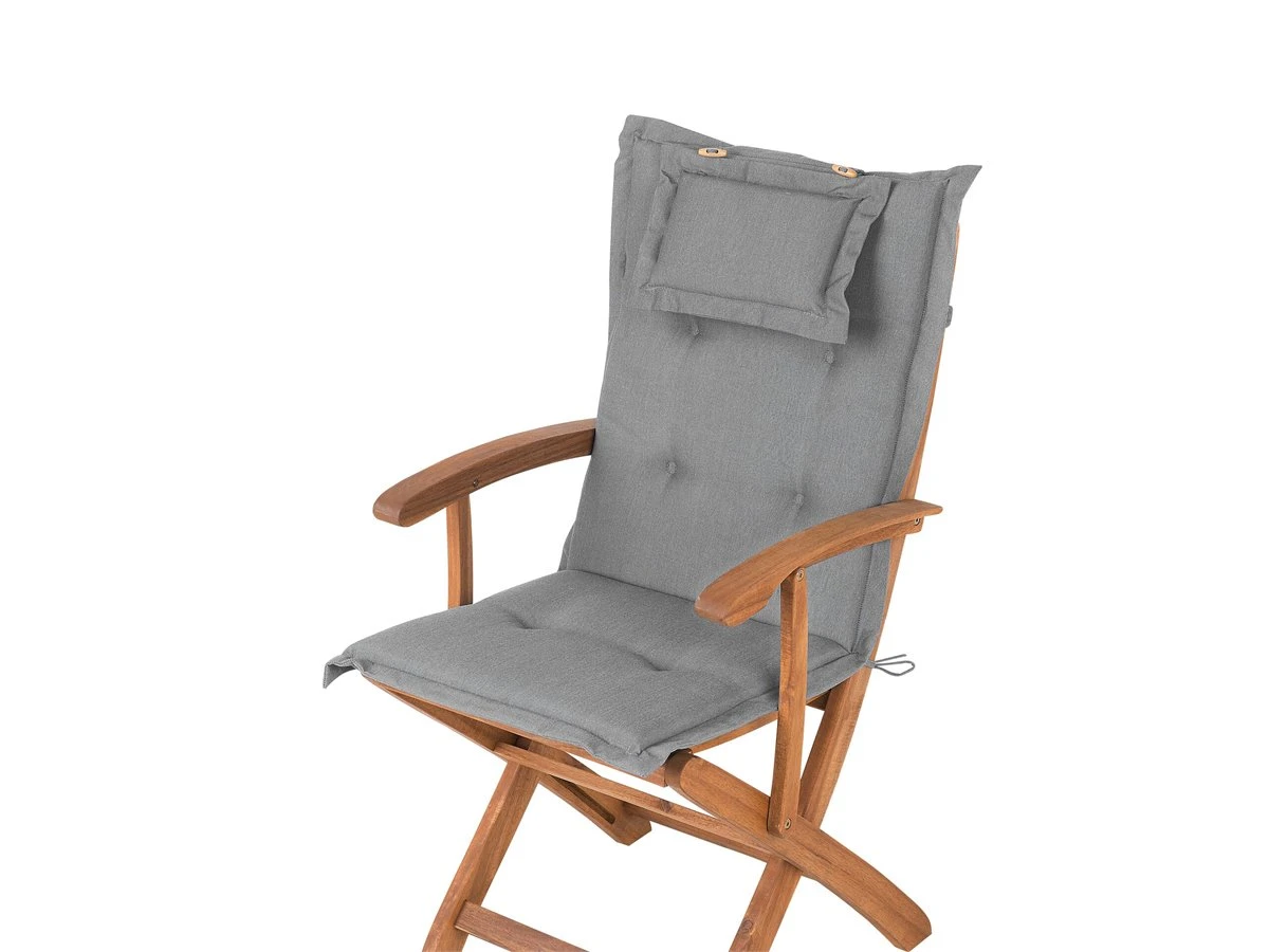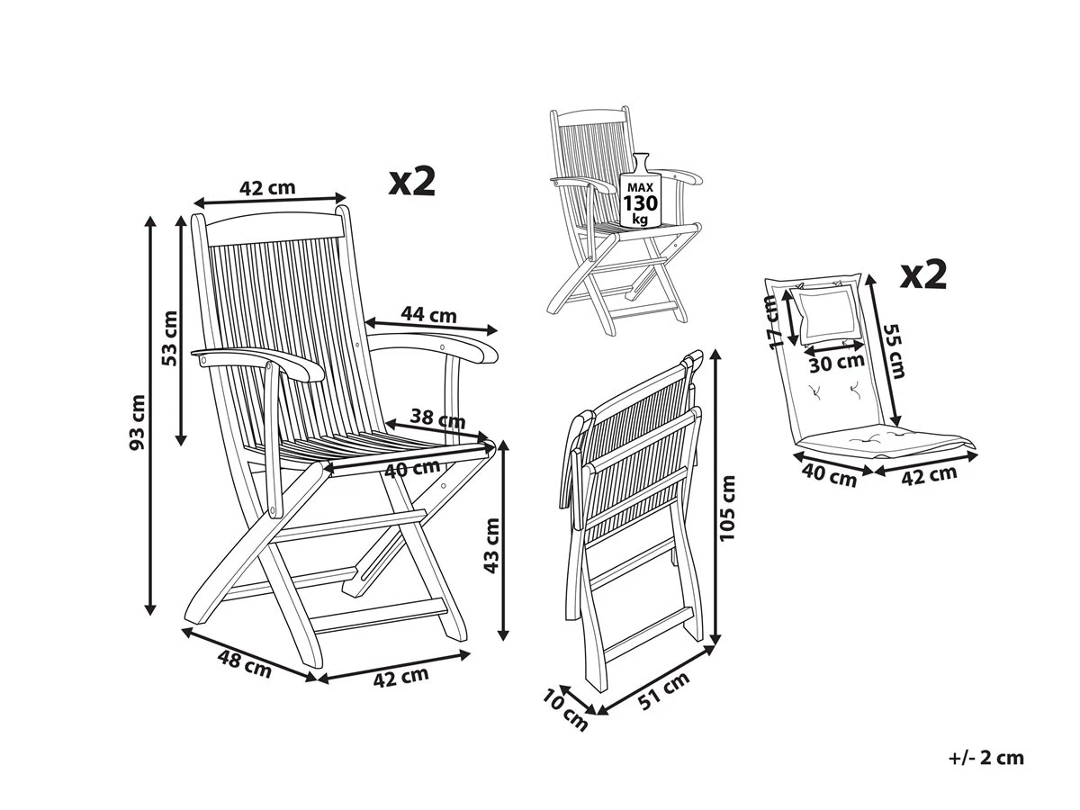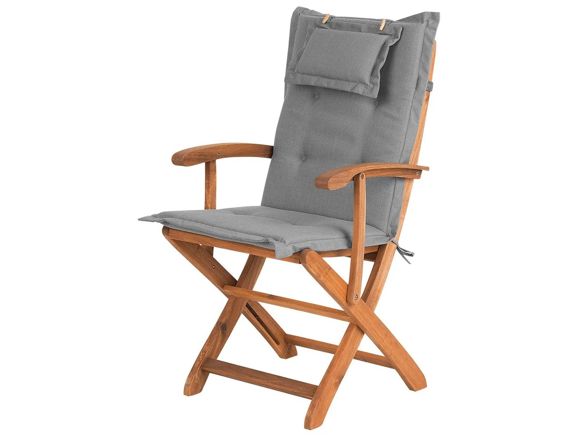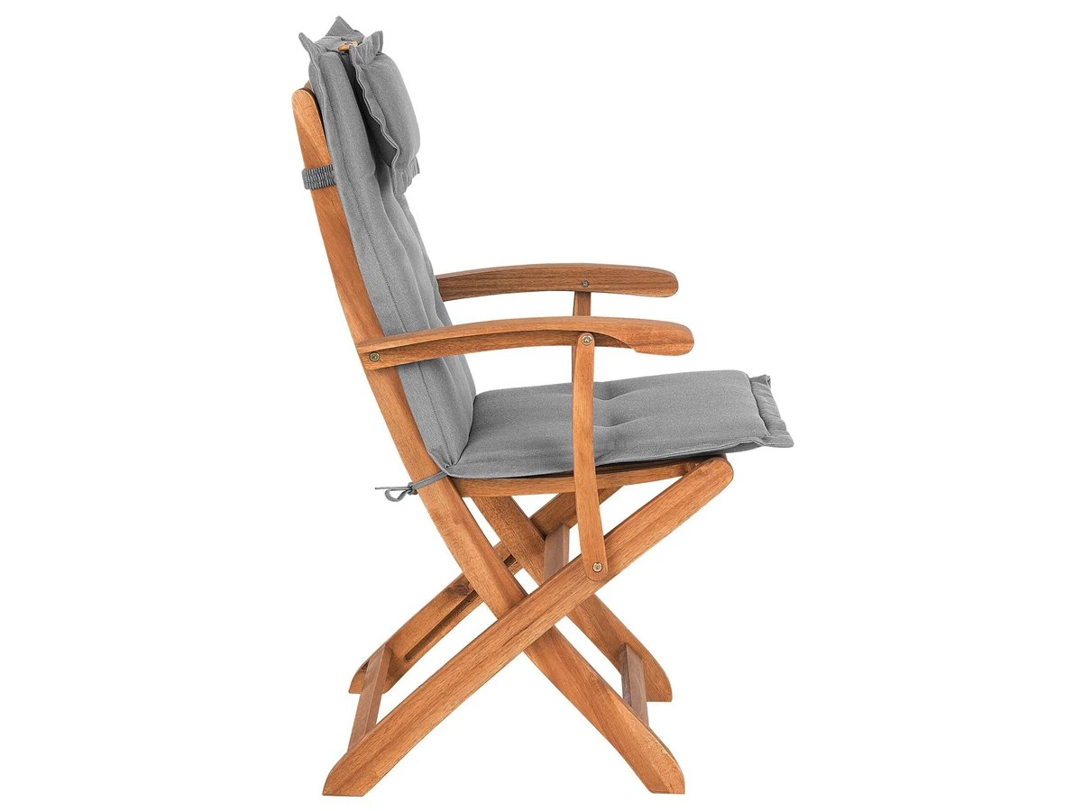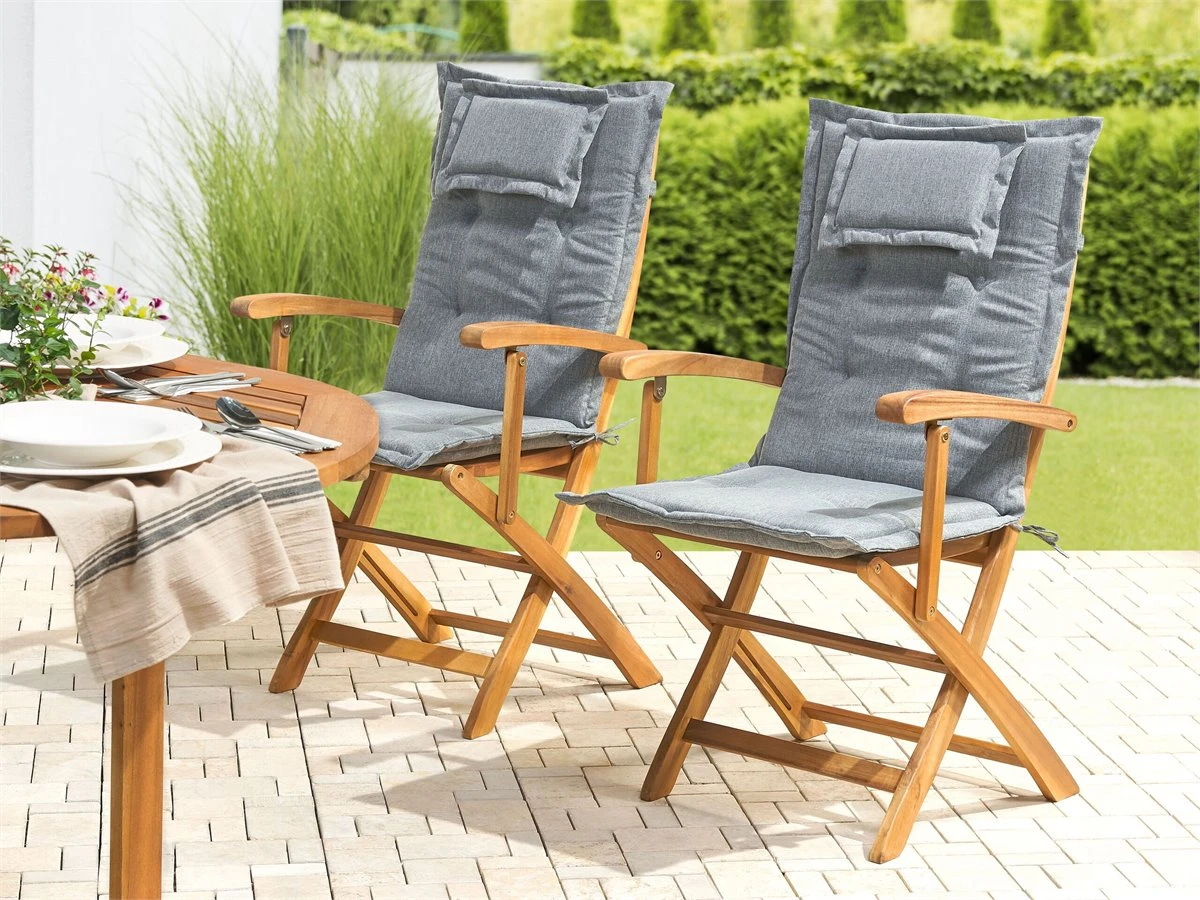 Conjunto de dos clásicas sillas de jardín con cojín. La silla de jardín con reposabrazos será una pieza llamativa en cualquier jardín o patio trasero. Es resistente y de fácil mantenimiento. La silla está elaborada en madera de acacia en un precioso tono cálido. Los reposabrazos garantizan el máximo confort al sentarse. Además, las sillas están equipadas con cómodos y gruesos cojines. El material de los cojines es impermeable, por lo tanto es fácil de limpiar. La funda no tiene cremallera. El mecanismo de plegado te ayudará a ahorrar una gran cantidad de espacio. Detalles: Tipo de Producto: Silla de jardín Estilo: Rústico Color: Madera clara Tipo de material: Madera maciza Material principal: Madera de acacia Material adicional: Poliéster Material de las patas: Madera maciza Material del asiento: Tejido Composición del Material: 100% Poliéster Apoyabrazo: Sí Acabado: Aceitado Plegable: Sí Densidad de espuma del asiento: 18 kg/m3 Apilable: No Dimensiones: Altura del apoyabrazos: 65 cm Profundidad: 48 cm Espesor del asiento: 5 cm Altura del asiento: 43 cm Ancho: 42 cm Altura: 93 cm Superficie del asiento: 40×38 cm Peso: 10 kg Capacidad de peso: 110 kg La oferta incluye: 2 x Silla, 2 x Cojines del asiento Ventajas: Las tiras ofrecen una fijación segura, Confort del asiento óptimo, Diseño atemporal, Materiales de la más alta calidad, Resistencia UV 5 (ISO 105-B02, Plegable para un fácil almacenamiento, Mantenimiento sencillo Información de montaje: No requiere montaje Información adicional: El producto viene con un libro de cuidados detallado para ayudarte a mantener tus muebles en las mejores condiciones durante muchos años. Consulta estos consejos para garantizar el mantenimiento adecuado de tus muebles nuevos – encontrarás las instrucciones de mantenimiento junto con el manual de montaje. Texto de resistencia: Gracias a su resistencia al agua, puedes utilizar el producto al aire libre y dejarlo a la intemperie durante lluvias ligeras. Si no es posible guardarlo en un lugar cerrado y protegido, recomendamos utilizar una funda protectora. La exposición prolongada a la humedad puede provocar daños en el mueble. Resistencia: Agua ligera / humedad Consejos de mantenimiento: Madera de acacia: 1.Limpiar con un limpiador suave y un paño suave en la dirección de la veta. Secar con un paño inmediatamente después de limpiar 2.Durante el invierno o en condiciones climáticas adversas, utilice una funda protectora o guarde los muebles en el interior 3.Los muebles con acabado de aceite deben volverse a engrasar antes de ponerlos en uso y al menos una vez al año, especialmente en el clima húmedo. Poliéster: 1.Aspire con un accesorio adecuado 2.Limpiar con champú seco y una esponja húmeda o un limpiador suave 3.Cuando no esté en uso, manténgalo en un lugar limpio y seco para protegerlo de las condiciones atmosféricas.