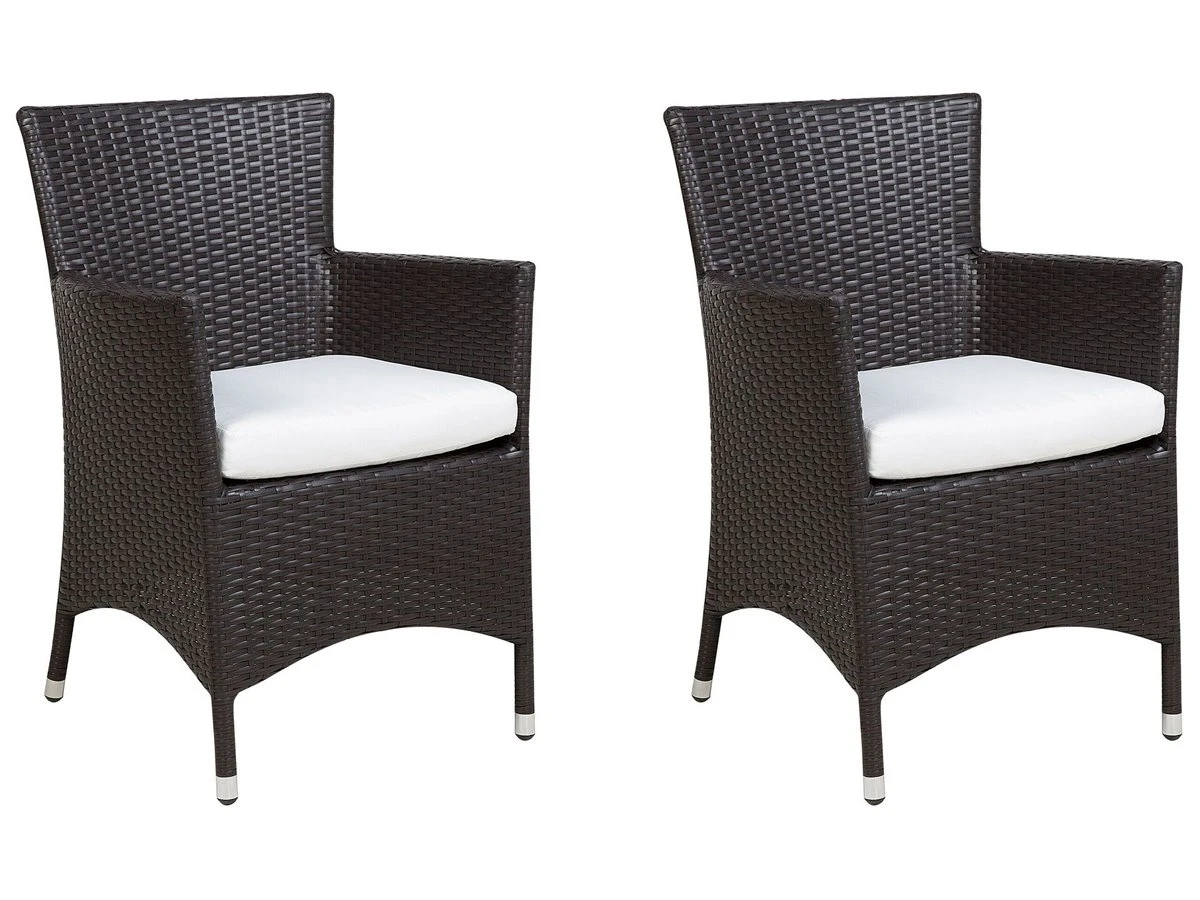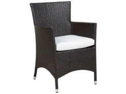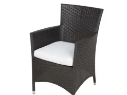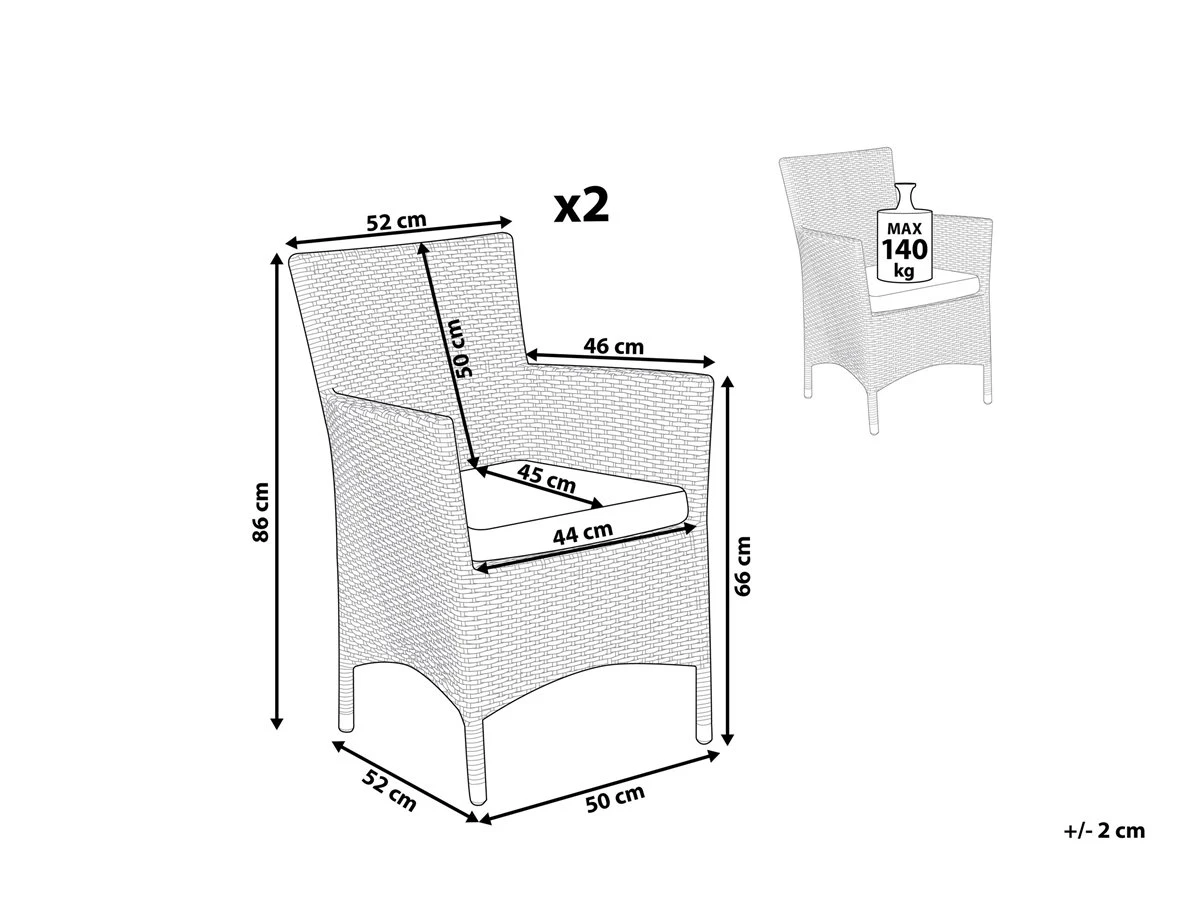 Juego de sillas de ratán sintético. Añade a tu zona exterior este conjunto de 2 sillas de jardín. Está fabricado a partir de ratán sintético de alta calidad. La estructura de metal con recubrimiento en polvo garantiza estabilidad. El respaldo alto y los reposabrazos cómodos proporcionan la máxima relajación. Los cojines vienen con fundas extraíbles que facilitan la limpieza. Detalles: Tipo de Producto: Silla de jardín Estilo: Moderno Color: Marrón Tonalidad: Blanco crema Tipo de material: Ratán sintético Material principal: Ratán sintético Material adicional: Poliéster Material de las patas: Mimbre sintético Material del asiento: Tejido Composición del Material: 100% Poliéster Apoyabrazo: Sí Acabado: Revestimiento en polvo Plegable: No Densidad de espuma del asiento: 25 kg/m3 Apilable: No Dimensiones: Altura del apoyabrazos: 66 cm Profundidad: 52 cm Espesor del asiento: 11 cm Altura del asiento: 41 cm Ancho: 52 cm Altura: 86 cm Superficie del asiento: 45×44 cm Peso: 7 kg Capacidad de peso: 140 kg La oferta incluye: 2 x Sillón, 2 x Cojines del asiento Ventajas: Cómodos apoyabrazos, Patas estables y resistentes, Diseño tradicional con un toque moderno, Ideal para uso al aire libre, Resistencia UV 5 (ISO 105-B02, Fundas de cojines con costuras ocultas y cremalleras, Ligero y sólido a la vez, muy fácil de mover Información de montaje: No requiere montaje Información adicional: El producto viene con un libro de cuidados detallado para ayudarte a mantener tus muebles en las mejores condiciones durante muchos años. Consulta estos consejos para garantizar el mantenimiento adecuado de tus muebles nuevos – encontrarás las instrucciones de mantenimiento junto con el manual de montaje. Texto de resistencia: Gracias a su resistencia al agua, puedes utilizar el producto al aire libre y dejarlo a la intemperie durante lluvias ligeras. Si no es posible guardarlo en un lugar cerrado y protegido, recomendamos utilizar una funda protectora. La exposición prolongada a la humedad puede provocar daños en el mueble. Resistencia: Agua ligera / humedad Consejos de mantenimiento: Ratán sintético: 1.Se recomienda utilizar una funda protectora para la temporada de invierno o, si es posible, para mantener los muebles secos y frescos en el interior 2.Limpiar con detergentes a base de jabón. No utilizar limpiadores químicos corrosivos 3.Los utensilios o accesorios de vidrio pueden sobrecalentar la superficie 4.Para alargar la vida útil del mueble, protéjalo de la exposición directa al sol. Poliéster: 1.Lavar a mano únicamente, usar agua fría y un detergente suave 2.Cuando no esté en uso, manténgalo en un lugar limpio y seco para protegerlo de las condiciones atmosféricas 3.No secar en secadora ni planchar.