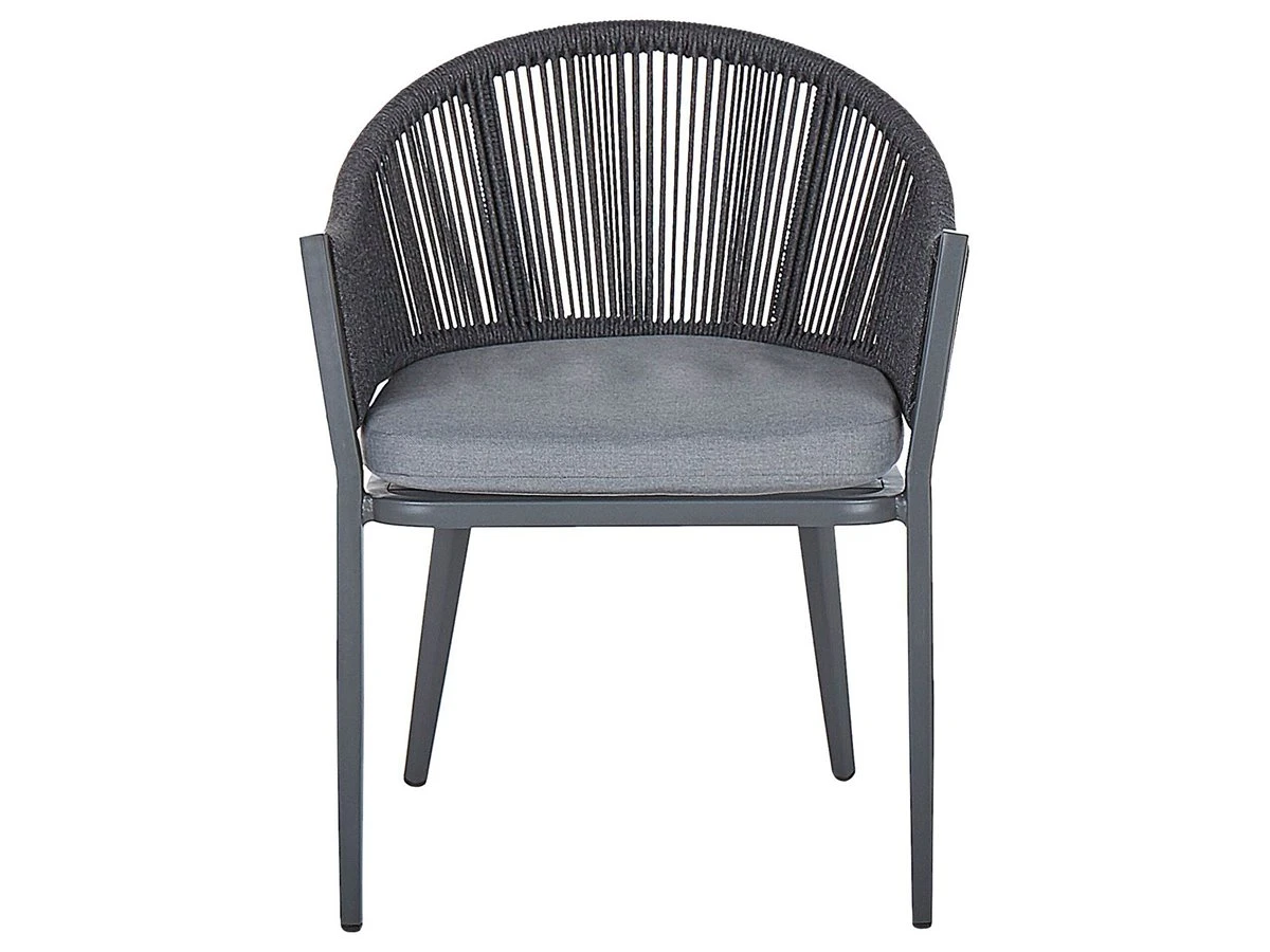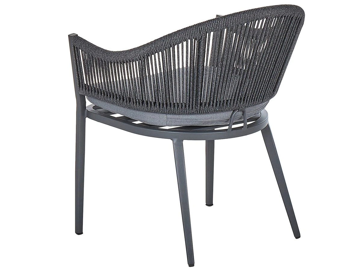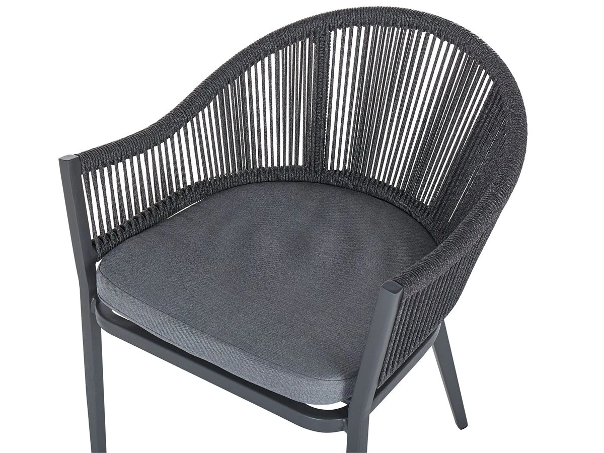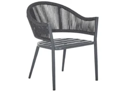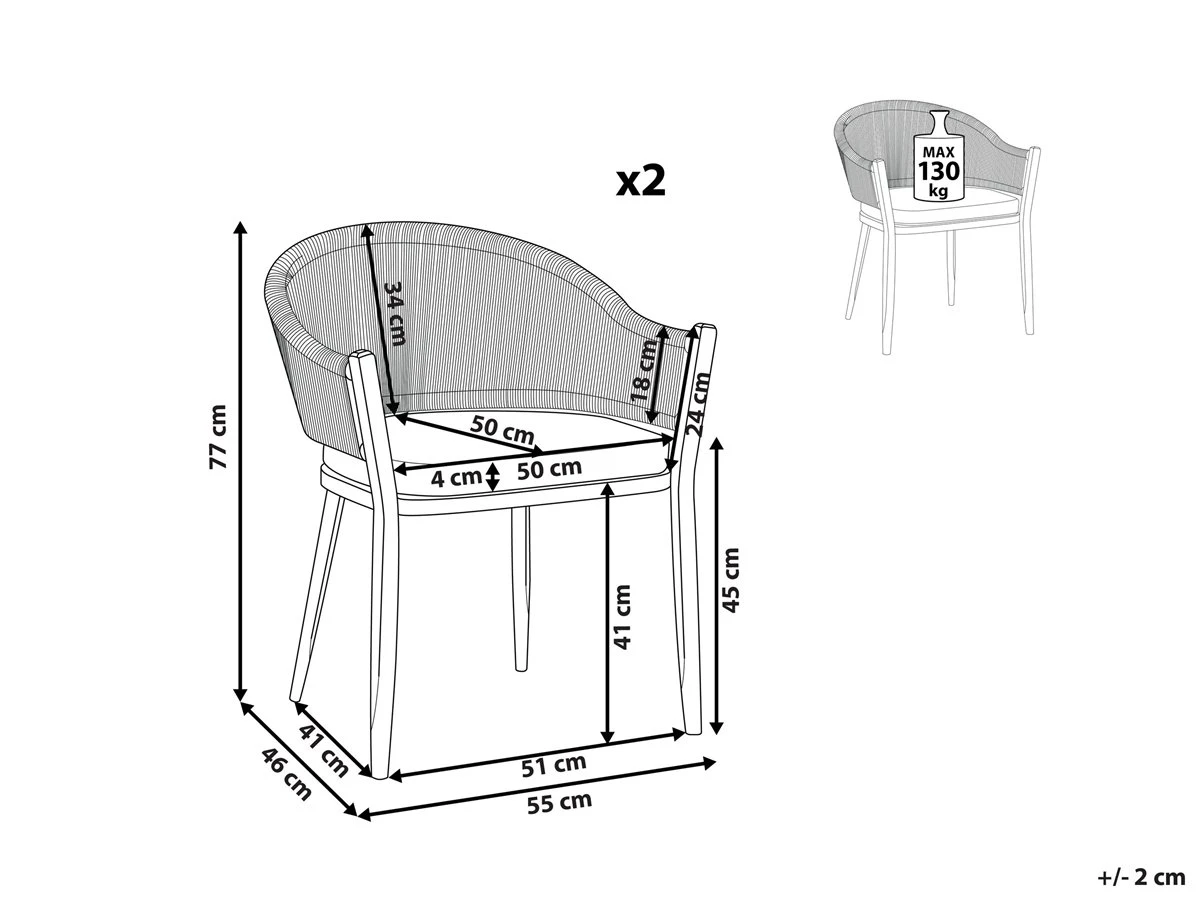 Conjunto de 2 sillas de jardín. Este conjunto de 2 sillas de jardín es el complemento perfecto para cualquier espacio al aire libre contemporáneo, moderno o minimalista. El marco de metal resistente garantiza durabilidad y estabilidad en la estructura. El respaldo y el asiento acolchado garantizan la máxima comodidad. Combínalas con una mesa de jardín y crea un acogedor comedor al aire libre. Detalles: Tipo de Producto: Silla de jardín Estilo: Moderno Color: Gris Tonalidad: Gris oscuro Tipo de material: Metal Material principal: Aluminio Material adicional: Poliéster Material de las patas: Metal Material del asiento: Tejido Composición del Material: 100% Poliéster Apoyabrazo: Sí Acabado: Revestimiento en polvo Plegable: No Densidad de espuma del asiento: 28 kg/m3 Apilable: No Dimensiones: Altura del apoyabrazos: 63 cm Profundidad: 46 cm Espesor del asiento: 4 cm Altura del asiento: 45 cm Ancho: 55 cm Altura: 77 cm Superficie del asiento: 50×50 cm Peso: 6 kg Capacidad de peso: 130 kg La oferta incluye: 2 x Silla, 2 x Cojines del asiento Ventajas: Funda extraíble, Perfecto para todo tipo de exterior, Resistencia UV 6 (ISO 105-B02, Ideal para uso al aire libre, Construcción muy estable, Patas con tapas antideslizantes de seguridad Información de montaje: No requiere montaje Información adicional: Abre el embalaje con cuidado, especialmente cuando utilizas herramientas afiladas o puntiagudas, ya que pueden dañar el producto Texto de resistencia: El producto es resistente al viento, por lo que no debe volcarse ni perder estabilidad con ráfagas de viento. Resistencia: Viento Consejos de mantenimiento: Aluminio: 1.Fuera de temporada, utilice una funda protectora o guarde los muebles en un lugar fresco y seco 2.Limpiar con agua jabonosa y detergentes suaves. Quitar el polvo con un paño suave. Poliéster: 1.No secar en secadora ni planchar 2.Lavar a mano únicamente, usar agua fría y un detergente suave 3.Cuando no esté en uso, manténgalo en un lugar limpio y seco para protegerlo de las condiciones atmosféricas.