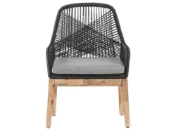 Juego de sillas de exterior. Decora tu espacio al aire libre con este conjunto de 2 sillas de jardín. El marco exterior está fabricado de polipropileno y el interior, de acero, ofrece ligereza y durabilidad. Las patas están hechas de madera de acacia que complementan su diseño natural. Cada silla incluye un cojín a juego para mayor comodidad. El diseño escandinavo y rústico combina bien con cualquier estilo de decoración. Detalles: Tipo de Producto: Silla de jardín Estilo: Rústico Color: Negro Tonalidad: Gris claro Tipo de material: Material sintético Material principal: Polipropileno Material adicional: Acero Material de las patas: Madera maciza Material del asiento: Material sintético Composición del Material: 100% Poliéster Apoyabrazo: Sí Acabado: Mate Plegable: No Densidad de espuma del asiento: 20 kg/m3 Apilable: No Dimensiones: Altura del apoyabrazos: 61 cm Profundidad: 71 cm Espesor del asiento: 5 cm Altura del asiento: 48 cm Ancho: 64 cm Altura: 89 cm Superficie del asiento: 52×50 cm Peso: 8 kg Capacidad de peso: 150 kg La oferta incluye: 2 x Silla, 2 x Cojines del asiento Ventajas: Asiento extremadamente cómodo, Perfecto para todo tipo de exterior, Ideal para uso en interiores y exteriores, Ideal para uso al aire libre, Estructura sólida y estable, Fundas extraíbles Información de montaje: Requiere montaje de las patas. 5-15 min. Información adicional: El producto viene con un libro de cuidados detallado para ayudarte a mantener tus muebles en las mejores condiciones durante muchos años. Consulta estos consejos para garantizar el mantenimiento adecuado de tus muebles nuevos – encontrarás las instrucciones de mantenimiento junto con el manual de montaje. Texto de resistencia: Gracias a su resistencia al agua, puedes utilizar el producto al aire libre y dejarlo a la intemperie durante lluvias ligeras. Si no es posible guardarlo en un lugar cerrado y protegido, recomendamos utilizar una funda protectora. La exposición prolongada a la humedad puede provocar daños en el mueble. Resistencia: Agua ligera / humedad Consejos de mantenimiento: Polipropileno: 1.El material es extremadamente resistente a la intemperie. Sin embargo, se recomienda utilizar una funda protectora para la temporada de invierno o, si es posible, guardar los muebles en un lugar fresco y seco 2.Manténgalo alejado de fuentes de calor, como parrilla o fuego, ya que las chispas pueden causar daños graves. No coloque utensilios calientes directamente sobre la superficie, 3.Limpiar con un limpiador a base de jabón suave y un paño suave Madera de acacia: 1.Durante el invierno o en condiciones climáticas adversas, utilice una funda protectora o guarde los muebles en el interior 2.Los muebles con acabado de aceite deben volverse a engrasar antes de ponerlos en uso y al menos una vez al año, especialmente en el clima húmedo 3.Limpiar con un limpiador suave y un paño suave en la dirección de la veta. Secar con un paño inmediatamente después de limpiar.