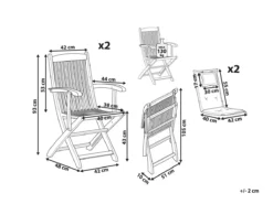 Conjunto de dos clásicas sillas de jardín con cojín. La silla de jardín con reposabrazos será una pieza llamativa en cualquier jardín o patio trasero. Es resistente y de fácil mantenimiento. La silla está elaborada en madera de acacia en un precioso tono cálido. Los reposabrazos garantizan el máximo confort al sentarse. Además, las sillas están equipadas con cómodos y gruesos cojines. El material de los cojines es impermeable, por lo tanto es fácil de cuidar. La funda no tiene cremallera. El mecanismo de plegado te ayudará a ahorrar una gran cantidad de espacio. Detalles: Tipo de Producto: Silla de jardín Estilo: Tradicional Color: Madera clara Tonalidad: Blanco crema Tipo de material: Madera maciza Material principal: Madera de acacia Material adicional: Poliéster Material de las patas: Madera maciza Material del asiento: Tejido Composición del Material: 100% Poliéster Apoyabrazo: Sí Acabado: Aceitado Plegable: Sí Densidad de espuma del asiento: 18 kg/m3 Apilable: No Dimensiones: Altura del apoyabrazos: 65 cm Profundidad: 48 cm Espesor del asiento: 5 cm Altura del asiento: 43 cm Ancho: 42 cm Altura: 93 cm Superficie del asiento: 38×40 cm Peso: 9 kg Capacidad de peso: 130 kg La oferta incluye: 2 x Silla, 2 x Cojines del asiento Ventajas: Las tiras ofrecen una fijación segura, Confort del asiento óptimo, Diseño atemporal, Materiales de la más alta calidad, Resistencia UV 5 (ISO 105-B02 Información de montaje: No requiere montaje Información adicional: El producto viene con un libro de cuidados detallado para ayudarte a mantener tus muebles en las mejores condiciones durante muchos años. Consulta estos consejos para garantizar el mantenimiento adecuado de tus muebles nuevos – encontrarás las instrucciones de mantenimiento junto con el manual de montaje. Texto de resistencia: Gracias a su resistencia al agua, puedes utilizar el producto al aire libre y dejarlo a la intemperie durante lluvias ligeras. Si no es posible guardarlo en un lugar cerrado y protegido, recomendamos utilizar una funda protectora. La exposición prolongada a la humedad puede provocar daños en el mueble. Resistencia: Agua ligera / humedad Consejos de mantenimiento: Madera de acacia: 1.Los muebles con acabado de aceite deben volverse a engrasar antes de ponerlos en uso y al menos una vez al año, especialmente en el clima húmedo 2.Limpiar con un limpiador suave y un paño suave en la dirección de la veta. Secar con un paño inmediatamente después de limpiar 3.Durante el invierno o en condiciones climáticas adversas, utilice una funda protectora o guarde los muebles en el interior. Poliéster: 1.Cuando no esté en uso, manténgalo en un lugar limpio y seco para protegerlo de las condiciones atmosféricas 2.Aspire con un accesorio adecuado 3.Limpiar con champú seco y una esponja húmeda o un limpiador suave.