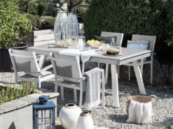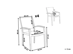 Moderno conjunto de sillas de jardín en aluminio. Un conjunto de sillas de jardín de aluminio en un diseño clásico que complementa cualquier área al aire libre. El robusto marco blanco de las sillas presenta un asiento y respaldo hechos de textilene en color gris neutro. Los reposabrazos están cubiertos con madera contrachapada duradera. Combina las sillas con una mesa y crea un comedor acogedor para disfrutar de tus comidas en el jardín. Detalles: Tipo de Producto: Silla de jardín Estilo: Moderno Color: Gris Tonalidad: Gris claro Tipo de material: Metal Material principal: Aluminio Material adicional: Madera plástica Material de las patas: Metal Material del asiento: Tejido Composición del Material: 90% PVC Apoyabrazo: Sí Acabado: Revestimiento en polvo Plegable: No Apilable: Sí Dimensiones: Altura del apoyabrazos: 61 cm Profundidad: 50 cm Altura del asiento: 38 cm Ancho: 46 cm Altura: 86 cm Superficie del asiento: 39×47 cm Peso: 6 kg Capacidad de peso: 120 kg La oferta incluye: 4 x Silla Ventajas: Confort del asiento óptimo, Perfecto para todo tipo de exterior, No requiere mantenimiento regular, Ideal para uso en interiores y exteriores, Materiales de la más alta calidad, Resistencia UV 4 (ISO 105-B05 Información de montaje: No requiere montaje Texto de resistencia: El producto es resistente al agua, lo que significa que no se dañará expuesto a la lluvia o en contacto con otros líquidos. Puede dejarlo al aire libre incluso durante fuertes lluvias o humedad. Durante la temporada de invierno es recomendable almacenar el producto en el interior o bajo una cubierta impermeable. Resistencia: Agua Consejos de mantenimiento: Aluminio: 1.Limpiar con agua jabonosa y detergentes suaves. Quitar el polvo con un paño suave 2.Fuera de temporada, utilice una funda protectora o guarde los muebles en un lugar fresco y seco. Poliéster: 1.Manténgalo alejado de fuentes de calor, como parrilla o fuego, ya que las chispas pueden causar daños graves. No coloque utensilios calientes directamente sobre la superficie, 2.Limpiar con un limpiador a base de jabón suave y un paño suave, 3.El material es extremadamente resistente a la intemperie. Sin embargo, se recomienda utilizar una funda protectora para la temporada de invierno o, si es posible, guardar los muebles en un lugar fresco y seco.