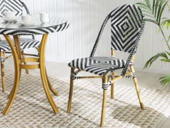 Conjunto de 4 sillas de jardín. Gracias a su llamativo tejido de formas geométricas, este conjunto de 4 sillas es perfecto para cualquier patio, balcón o comedor. Fabricadas con un marco de aluminio y asientos que imitan al ratán, las sillas son idóneas para usar tanto en exteriores como en interiores. Permiten ser apiladas, lo que las hace ideales para jardines pequeños o habitaciones de espacio reducido. Combínalas con una mesa de la misma colección y crea un lugar soleado donde relajarte. Detalles: Tipo de Producto: Silla de jardín Estilo: Retro Color: Negro Tipo de material: Ratán sintético Material principal: Ratán sintético Material adicional: Aluminio Material de las patas: Metal Material del asiento: Mimbre sintético Apoyabrazo: No Acabado: Revestimiento en polvo Plegable: No Apilable: Sí Dimensiones: Profundidad: 55 cm Altura del asiento: 40 cm Ancho: 46 cm Altura: 88 cm Superficie del asiento: 42×42 cm Peso: 4 kg Capacidad de peso: 150 kg La oferta incluye: 4 x Silla Ventajas: Perfecto para todo tipo de exterior, Ideal para uso en interiores y exteriores, Ligero y sólido a la vez, muy fácil de mover, Apilable para un almacenaje mejor, Patas con tapas anti-deslizantes Información de montaje: No requiere montaje Texto de resistencia: El producto está fabricado con materiales altamente resistentes a las manchas, por lo que la suciedad no empapará el producto y debería ser fácil de eliminar. Cuando elimine las manchas, siga el manual de cuidado del producto. Resistencia: Manchas Consejos de mantenimiento: Ratán sintético: 1.Para alargar la vida útil del mueble, protéjalo de la exposición directa al sol 2.Se recomienda utilizar una funda protectora para la temporada de invierno o, si es posible, para mantener los muebles secos y frescos en el interior 3.Limpiar con detergentes a base de jabón. No utilizar limpiadores químicos corrosivos 4.Los utensilios o accesorios de vidrio pueden sobrecalentar la superficie. Aluminio: 1.Fuera de temporada, utilice una funda protectora o guarde los muebles en un lugar fresco y seco 2.Limpiar con agua jabonosa y detergentes suaves. Quitar el polvo con un paño suave.