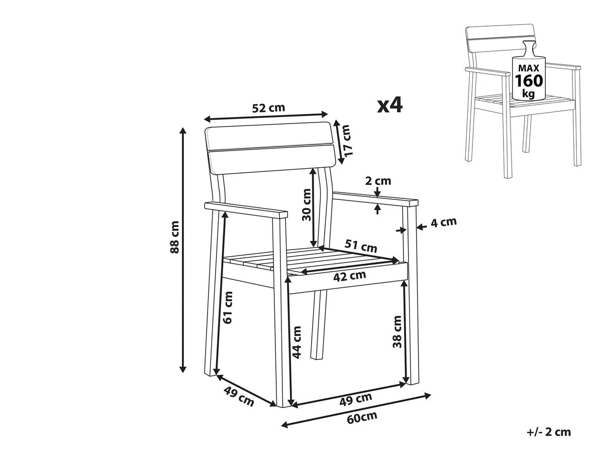 Juego de sillas de madera. Añade a tu exterior este conjunto de 4 sillas de jardín. Está fabricado a partir de madera de acacia resistente y duradera. El diseño clásico con reposabrazos combina bien con una mesa a juego. Ideal para cualquier jardín, patio o terraza. Detalles: Tipo de Producto: Silla de jardín Estilo: Rústico Color: Madera clara Tipo de material: Madera maciza Material principal: Madera de acacia Material de las patas: Madera maciza Material del asiento: Madera maciza Apoyabrazo: Sí Acabado: Aceitado Plegable: No Apilable: No Dimensiones: Altura del apoyabrazos: 63 cm Profundidad: 56 cm Altura del asiento: 44 cm Ancho: 60 cm Altura: 88 cm Superficie del asiento: 42×51 cm Peso: 7 kg Capacidad de peso: 160 kg La oferta incluye: 4 x Silla Ventajas: Cómodos apoyabrazos, Los nudos y vetas de madera natural hacen que cada pieza sea única, Diseño atemporal, Fabricación sólida y precisa, Muy fácil de conservar Información de montaje: Requiere montaje completo. 45-60 min. Información adicional: El producto viene con un libro de cuidados detallado para ayudarte a mantener tus muebles en las mejores condiciones durante muchos años. Consulta estos consejos para garantizar el mantenimiento adecuado de tus muebles nuevos – encontrarás las instrucciones de mantenimiento junto con el manual de montaje. Texto de resistencia: Gracias a su resistencia al agua, puedes utilizar el producto al aire libre y dejarlo a la intemperie durante lluvias ligeras. Si no es posible guardarlo en un lugar cerrado y protegido, recomendamos utilizar una funda protectora. La exposición prolongada a la humedad puede provocar daños en el mueble. Resistencia: Agua ligera / humedad Consejos de mantenimiento: Madera de acacia: 1.Limpiar con un limpiador suave y un paño suave en la dirección de la veta. Secar con un paño inmediatamente después de limpiar 2.Durante el invierno o en condiciones climáticas adversas, utilice una funda protectora o guarde los muebles en el interior 3.Los muebles con acabado de aceite deben volverse a engrasar antes de ponerlos en uso y al menos una vez al año, especialmente en el clima húmedo.