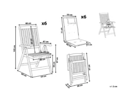 Juego de 6 sillas plegables con cojines a juego. Este conjunto de 6 sillas de jardín es perfecto para cualquier espacio al aire libre, y encaja especialmente bien con la decoración tradicional. Fabricadas de madera maciza de acacia, las sillas son duraderas y pueden soportar condiciones climáticas adversas. Incluyen cojines a juego rellenos de espuma suave que aumentan la comodidad del asiento. Son fácilmente plegables, lo que permite ahorrar espacio cuando se almacenan fuera de temporada. Detalles: Tipo de Producto: Silla de jardín Estilo: Tradicional Color: Madera clara Tipo de material: Madera maciza Material principal: Madera de acacia Material adicional: Acero Material de las patas: Madera maciza Material del asiento: Madera maciza Composición del Material: 100% Poliéster Partes ajustables: Respaldo Apoyabrazo: Sí Acabado: Aceitado Plegable: Sí Apilable: No Dimensiones: Altura del apoyabrazos: 67 cm Profundidad: 69 cm Espesor del asiento: 5 cm Altura del asiento: 44 cm Ancho: 54 cm Altura: 105 cm Superficie del asiento: 48×43 cm Peso: 9 kg Capacidad de peso: 160 kg La oferta incluye: 6 x Silla, 6 x Cojín Ventajas: Respaldo ajustable en 6 posiciones, Las tiras ofrecen una fijación segura, Cómodos apoyabrazos, Materiales pensados para el uso en el exterior, Resistencia UV 5 (ISO 105-B02, Plegable para un fácil almacenamiento Información de montaje: No requiere montaje Información adicional: Por favor, ten en cuenta que la madera es un producto natural, y cada pieza puede presentar ligeras variaciones. Las diferencias en el color o la textura, como las arrugas u otras características naturales, no se consideran un defecto ni tampoco una base de reclamación, El producto viene con un libro de cuidados detallado para ayudarte a mantener tus muebles en las mejores condiciones durante muchos años. Consulta estos consejos para garantizar el mantenimiento adecuado de tus muebles nuevos – encontrarás las instrucciones de mantenimiento junto con el manual de montaje. Texto de resistencia: Gracias a su resistencia al agua, puedes utilizar el producto al aire libre y dejarlo a la intemperie durante lluvias ligeras. Si no es posible guardarlo en un lugar cerrado y protegido, recomendamos utilizar una funda protectora. La exposición prolongada a la humedad puede provocar daños en el mueble. Resistencia: Agua ligera / humedad Consejos de mantenimiento: Madera de acacia: 1.Limpiar con un limpiador suave y un paño suave en la dirección de la veta. Secar con un paño inmediatamente después de limpiar 2.Durante el invierno o en condiciones climáticas adversas, utilice una funda protectora o guarde los muebles en el interior 3.Los muebles con acabado de aceite deben volverse a engrasar antes de ponerlos en uso y al menos una vez al año, especialmente en el clima húmedo. Poliéster: 1.Cuando no esté en uso, manténgalo en un lugar limpio y seco para protegerlo de las condiciones atmosféricas 2.Aspire con un accesorio adecuado 3.Limpiar con champú seco y una esponja húmeda o un limpiador suave.