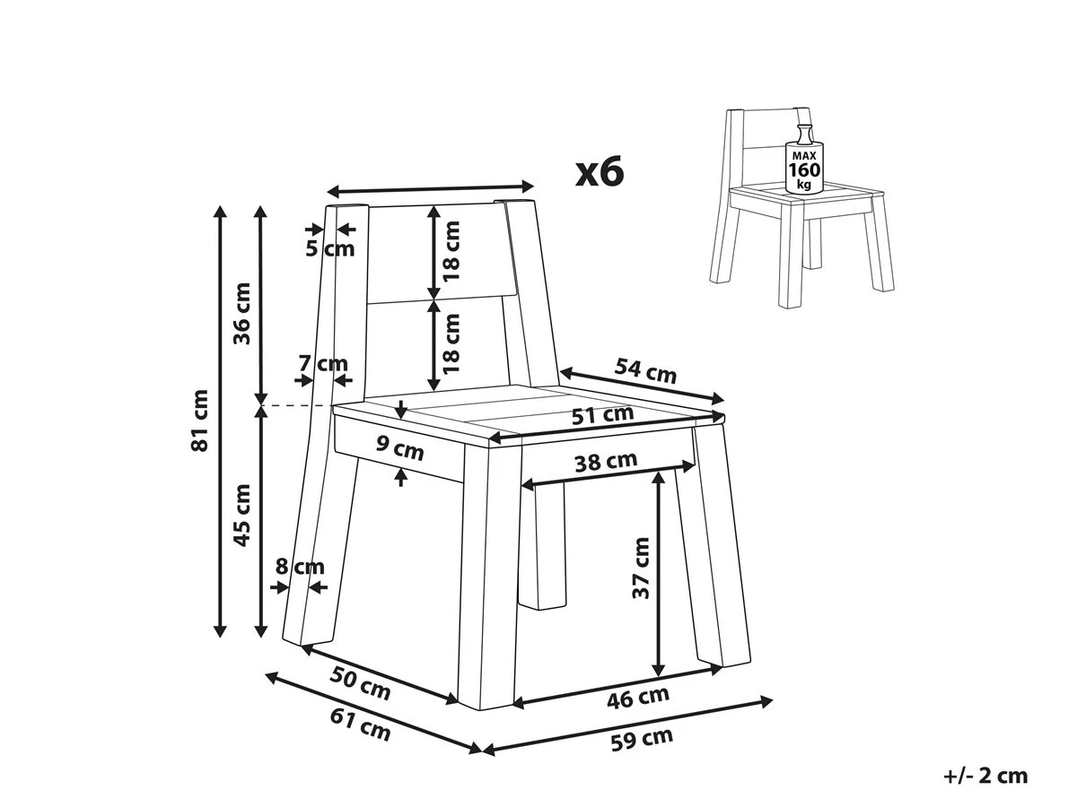 Juego de sillas de jardín. Decora tu exterior con este conjunto de 6 sillas de jardín de inspiración moderna. Están fabricadas a partir de madera de acacia de alta calidad. Las líneas limpias combinan bien con una gran variedad de estilos de decoración. Pueden ser utilizadas en interiores y exteriores. Detalles: Tipo de Producto: Silla de jardín Estilo: Tradicional Color: Madera clara Tipo de material: Madera maciza Material principal: Madera de acacia Material de las patas: Madera maciza Material del asiento: Madera maciza Apoyabrazo: No Acabado: Aceitado Plegable: No Apilable: No Dimensiones: Profundidad: 61 cm Altura del asiento: 45 cm Ancho: 59 cm Altura: 81 cm Superficie del asiento: 51×54 cm Peso: 13 kg Capacidad de peso: 160 kg La oferta incluye: 6 x Silla Ventajas: Asiento extremadamente cómodo, Perfecto para todo tipo de exterior, Materiales de la más alta calidad, No requiere mantenimiento regular, Ideal para uso en interiores y exteriores Información de montaje: Requiere montaje completo. Más de 60 min. Información adicional: Por favor, ten en cuenta que la madera es un producto natural, y cada pieza puede presentar ligeras variaciones. Las diferencias en el color o la textura, como las arrugas u otras características naturales, no se consideran un defecto ni tampoco una base de reclamación, El producto viene con un libro de cuidados detallado para ayudarte a mantener tus muebles en las mejores condiciones durante muchos años. Consulta estos consejos para garantizar el mantenimiento adecuado de tus muebles nuevos – encontrarás las instrucciones de mantenimiento junto con el manual de montaje. Texto de resistencia: Gracias a su resistencia al agua, puedes utilizar el producto al aire libre y dejarlo a la intemperie durante lluvias ligeras. Si no es posible guardarlo en un lugar cerrado y protegido, recomendamos utilizar una funda protectora. La exposición prolongada a la humedad puede provocar daños en el mueble. Resistencia: Agua ligera / humedad Consejos de mantenimiento: Madera de acacia: 1.Los muebles con acabado de aceite deben volverse a engrasar antes de ponerlos en uso y al menos una vez al año, especialmente en el clima húmedo 2.Limpiar con un limpiador suave y un paño suave en la dirección de la veta. Secar con un paño inmediatamente después de limpiar 3.Durante el invierno o en condiciones climáticas adversas, utilice una funda protectora o guarde los muebles en el interior.