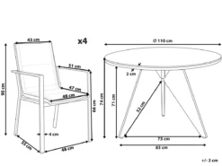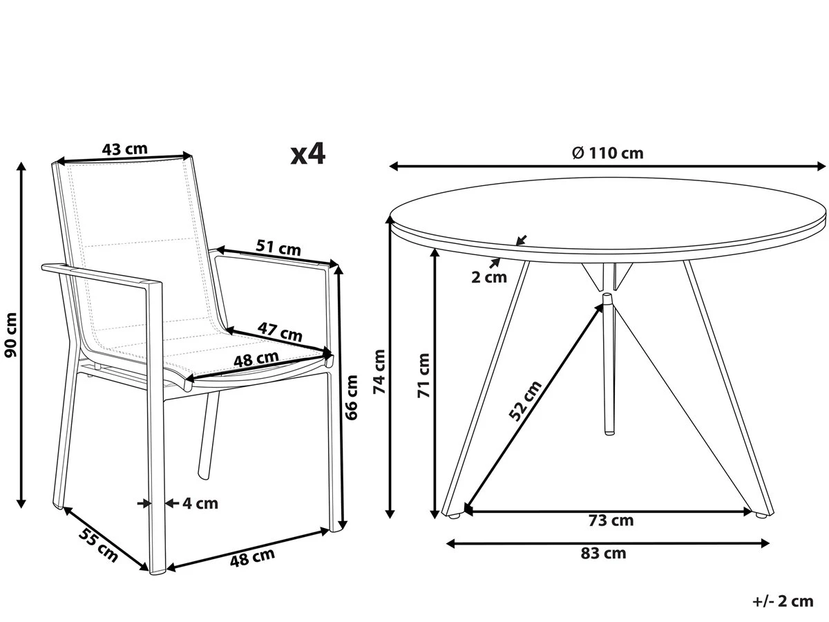 Juego de exterior. Añade a tu zona exterior este conjunto de comedor de diseño moderno. Está fabricado a partir de material duradero y de alta calidad. Las sillas tapizadas y los reposabrazos garantizan la máxima comodidad. La forma geomĂ©trica de las patas de la mesa completa el diseño. Utilizable en interiores y exteriores. Detalles: Tipo de Producto: Conjunto de comedor Estilo: Moderno Color: Negro Tipo de material: Material sintĂ©tico Material principal: Aluminio Material adicional: Cerámica ComposiciĂłn del Material: 100% PoliĂ©ster Acabado: Revestimiento en polvo Dimensiones: Dimensiones de la silla: 48x55x90 cm Altura del asiento: 39 cm Dimensiones de la mesa: 110x110x74 cm Peso: 23 kg Capacidad de peso de la silla: 150 kg Capacidad de peso de la mesa: 70 kg La oferta incluye: 1 x Mesa, 4 x Silla Ventajas: Cojines muy cĂłmodos para un confort ideal, Robusto marco resistente a la corrosiĂłn, Resistencia UV 5 (ISO 105-B02, Mantenimiento sencillo, Patas con tapas anti-deslizantes, Apilable, ahorra espacio InformaciĂłn de montaje: Requiere montaje de las patas. 20-40 min. Texto de resistencia: Gracias al acabado especial, la superficie del producto es resistente a la oxidaciĂłn. Esto significa que se puede utilizar en exteriores. Cuando el producto no estĂ© en uso, se recomienda cubrirlo con una cubierta o colocarlo en un lugar seco. Resistencia: Intemperie Consejos de mantenimiento: Aluminio: 1.Fuera de temporada, utilice una funda protectora o guarde los muebles en un lugar fresco y seco 2.Limpiar con agua jabonosa y detergentes suaves. Quitar el polvo con un paño suave. Cerámica: 1.Limpiar con un limpiador suave y un paño suave, secar despuĂ©s 2.El material es resistente a la intemperie, pero durante el invierno se recomienda utilizar una funda protectora o guardar los muebles en el interior. PoliĂ©ster: 1.Cuando no estĂ© en uso, mantĂ©ngalo en un lugar limpio y seco para protegerlo de las condiciones atmosfĂ©ricas 2.No secar en secadora ni planchar 3.Lavar a mano Ăşnicamente, usar agua frĂa y un detergente suave.