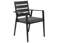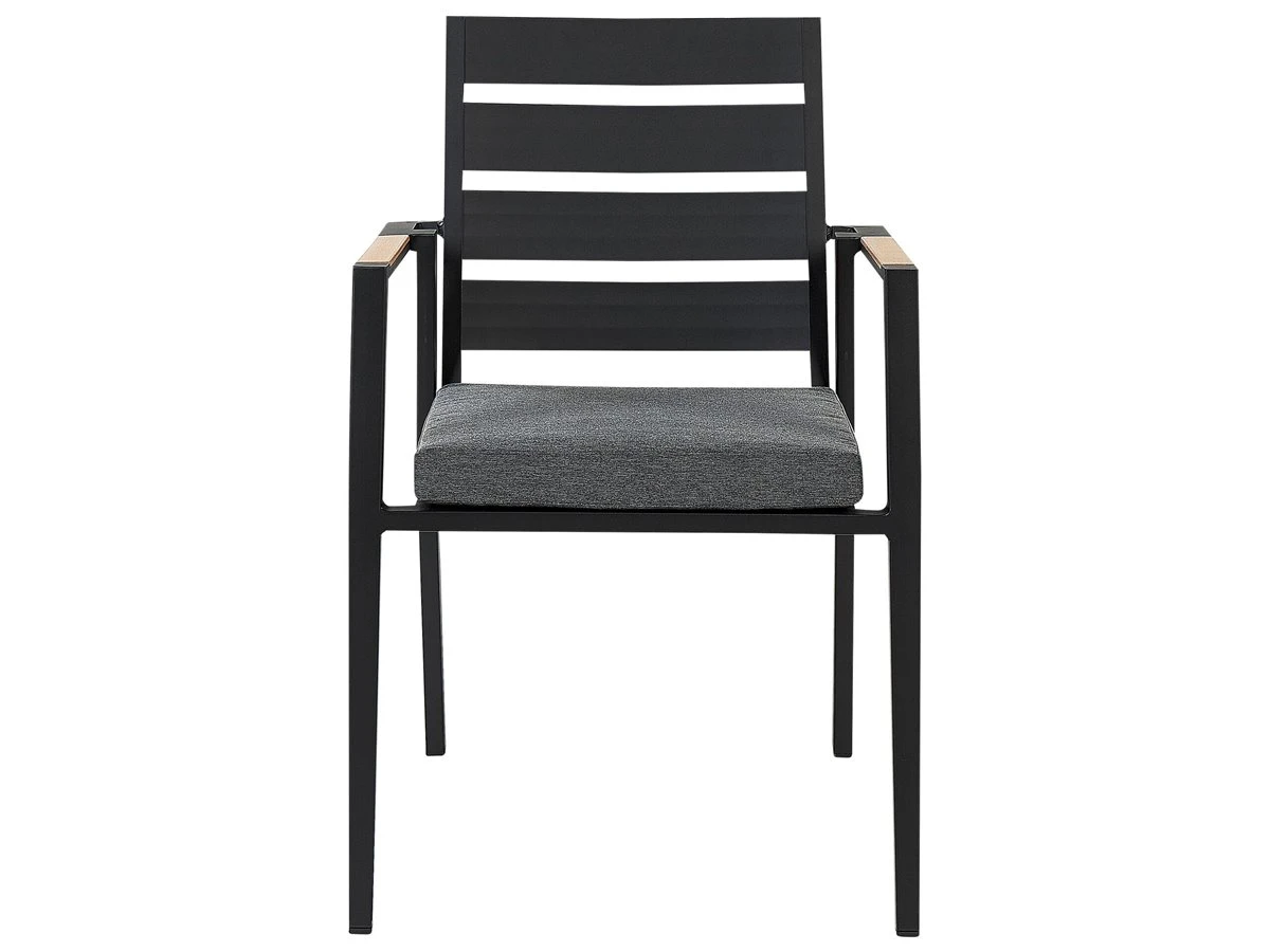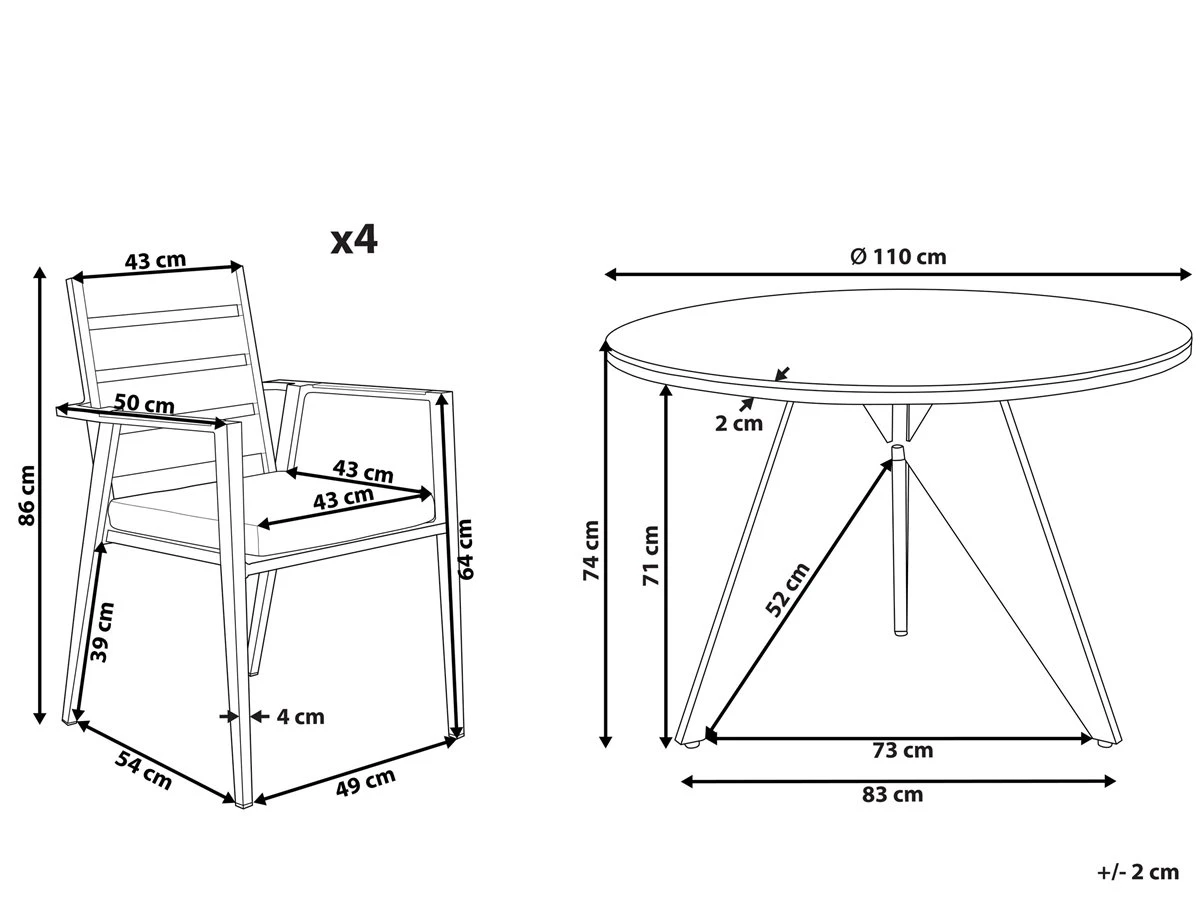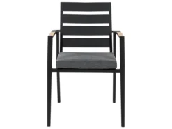 Juego de exterior. Añade elegancia a tu zona exterior con este conjunto de comedor. Está fabricado a partir de material duradero y de alta calidad. El respaldo de listones de la silla y los cojines gruesos aportan un aire de distinción. La forma geométrica de las patas de la mesa completa el diseño. Detalles: Tipo de Producto: Conjunto de comedor Estilo: Moderno Color: Negro Tipo de material: Material sintético Material principal: Aluminio Material adicional: Poliéster Composición del Material: 100% Poliéster Acabado: Revestimiento en polvo Densidad de espuma del asiento: 28 kg/m3 Dimensiones: Dimensiones de la silla: 49x54x86 cm Espesor del asiento: 5 cm Altura del asiento: 39 cm Dimensiones de la mesa: 110x110x74 cm Peso: 29 kg Capacidad de peso de la silla: 160 kg Capacidad de peso de la mesa: 70 kg La oferta incluye: 1 x Mesa, 4 x Silla, 4 x Cojín del asiento Ventajas: Cojines muy cómodos para un confort ideal, Resistencia UV, Robusto marco resistente a la corrosión, Mantenimiento sencillo, Patas con tapas anti-deslizantes, Apilable, ahorra espacio Información de montaje: Requiere montaje de las patas. 20-40 min. Texto de resistencia: Gracias al acabado especial, la superficie del producto es resistente a la oxidación. Esto significa que se puede utilizar en exteriores. Cuando el producto no esté en uso, se recomienda cubrirlo con una cubierta o colocarlo en un lugar seco. Resistencia: Intemperie Consejos de mantenimiento: Aluminio: 1.Limpiar con agua jabonosa y detergentes suaves. Quitar el polvo con un paño suave 2.Fuera de temporada, utilice una funda protectora o guarde los muebles en un lugar fresco y seco. Poliéster: 1.Cuando no esté en uso, manténgalo en un lugar limpio y seco para protegerlo de las condiciones atmosféricas 2.No secar en secadora ni planchar 3.Lavar a mano únicamente, usar agua fría y un detergente suave. Cerámica: 1.El material es resistente a la intemperie, pero durante el invierno se recomienda utilizar una funda protectora o guardar los muebles en el interior 2.Limpiar con un limpiador suave y un paño suave, secar después.