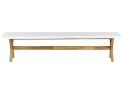 Conjunto de comedor para jardín con base de madera de acacia. Si estás buscando la forma de convertir tu jardín en el mejor lugar para reunir a tu familia y amigos, este conjunto de jardín es justo lo que necesitas. La mesa ofrece espacio para hasta 8 personas. Todos los elementos están fabricados a partir de materiales resistentes al agua y a la intemperie: la mesa y los asientos, de cemento reforzado y, las bases, de madera de acacia, todo de fácil mantenimiento. Este juego de jardín destacará en espacios de diseño moderno o minimalista, pero combina bien con cualquier estilo. Detalles: Tipo de Producto: Conjunto de comedor Estilo: Moderno Color: Blanco Tipo de material: Cemento Material principal: Cemento reforzado con fibra Material adicional: Madera de acacia Material de la superficie: Cemento Acabado: Laminado Dimensiones: Dimensiones del banco: 40x200x45 Dimensiones de la silla: 40x51x45 cm Altura del asiento: 45 cm Dimensiones de la mesa: 200x100x75 cm Peso: 126 kg Capacidad de peso de la silla: 120 kg Capacidad de peso de la mesa: 125 kg La oferta incluye: 1 x Mesa, 2 x Banco, 2 x Taburete Ventajas: Perfecto para cenar en grupos más grandes, Acabado de hormigón para aspecto industrial, Perfecto para todo tipo de exterior, Ideal para uso en interiores y exteriores, Materiales de la más alta calidad Información de montaje: Requiere montaje completo. Más de 60 min. Información adicional: Dependiendo de la humedad del aire, los muebles de concreto pueden tener grietas, agujeros o cambiar de color. Es una característica natural del material y no afecta su calidad. El producto viene con un libro de cuidados detallado para ayudarte a mantener tus muebles en las mejores condiciones durante muchos años. Consulta estos consejos para garantizar el mantenimiento adecuado de tus muebles nuevos – encontrarás las instrucciones de mantenimiento junto con el manual de montaje. Texto de resistencia: Gracias a su resistencia al agua, puedes utilizar el producto al aire libre y dejarlo a la intemperie durante lluvias ligeras. Si no es posible guardarlo en un lugar cerrado y protegido, recomendamos utilizar una funda protectora. La exposición prolongada a la humedad puede provocar daños en el mueble. Resistencia: Agua ligera / humedad Consejos de mantenimiento: Cemento reforzado con fibra: 1.Durante el invierno utilice una funda protectora o guarde los muebles en el interior 2.Para evitar manchas, no utilice detergentes cremosos o detergentes con ácidos o aceites. Madera de acacia: 1.Durante el invierno o en condiciones climáticas adversas, utilice una funda protectora o guarde los muebles en el interior 2.Los muebles con acabado de aceite deben volverse a engrasar antes de ponerlos en uso y al menos una vez al año, especialmente en el clima húmedo 3.Limpiar con un limpiador suave y un paño suave en la dirección de la veta. Secar con un paño inmediatamente después de limpiar.