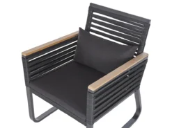 Set de jardín. Añade a tu área exterior este conjunto de jardín de estilo clásico. La construcción de aluminio proporciona estabilidad y los elementos de madera plástica en las sillas, comodidad. Los respaldos y asientos de estilo cuerda acolchados garantizan el mejor descanso. Coloca este juego en tu jardín y crea un comedor acogedor al aire libre. Detalles: Tipo de Producto: Conjunto de comedor Estilo: Moderno Color: Negro Tipo de material: Metal Material principal: Aluminio Material adicional: Poliéster Material de la superficie: Vidrio Composición del Material: 100% Poliéster Acabado: Revestimiento en polvo Densidad de espuma del asiento: 6 kg/m3 Dimensiones: Dimensiones de la silla: 60x65x83 cm Espesor del asiento: 3 cm Altura del asiento: 45 cm Dimensiones de la mesa: 150x90x76 cm Peso: 60 kg Capacidad de peso de la silla: 130 kg Capacidad de peso de la mesa: 200 kg La oferta incluye: 4 x Silla, 1 x Mesa, 4 x Cojín del asiento, 4 x Cojín del respaldo Ventajas: Tablero grueso de vidrio templado resistente, No requiere mantenimiento regular, Resistencia UV 6 (ISO 105-B02, Ideal para uso al aire libre, Fundas extraíbles, Patas con tapas antideslizantes de seguridad, Tablero en vidrio templado de seguridad Información de montaje: Requiere montaje parcial. Más de 60 min. Información adicional: Abre el embalaje con cuidado, especialmente cuando utilizas herramientas afiladas o puntiagudas, ya que pueden dañar el producto Texto de resistencia: El producto es resistente al viento, por lo que no debe volcarse ni perder estabilidad con ráfagas de viento. Resistencia: Viento Consejos de mantenimiento: Aluminio: 1.Fuera de temporada, utilice una funda protectora o guarde los muebles en un lugar fresco y seco 2.Limpiar con agua jabonosa y detergentes suaves. Quitar el polvo con un paño suave. Vidrio templado: 1.Limpiar con un detergente suave o acondicionador de vidrio con un paño suave. Secar después de limpiar 2.Secar después de la lluvia o la nieve. Durante el invierno, utilice una funda protectora o guarde los muebles en el interior 3.Para evitar rayones, no use un limpiador cremoso. Poliéster: 1.No secar en secadora ni planchar 2.Lavar a mano únicamente, usar agua fría y un detergente suave 3.Cuando no esté en uso, manténgalo en un lugar limpio y seco para protegerlo de las condiciones atmosféricas.