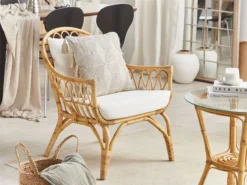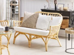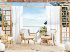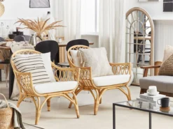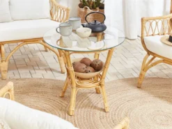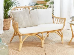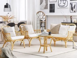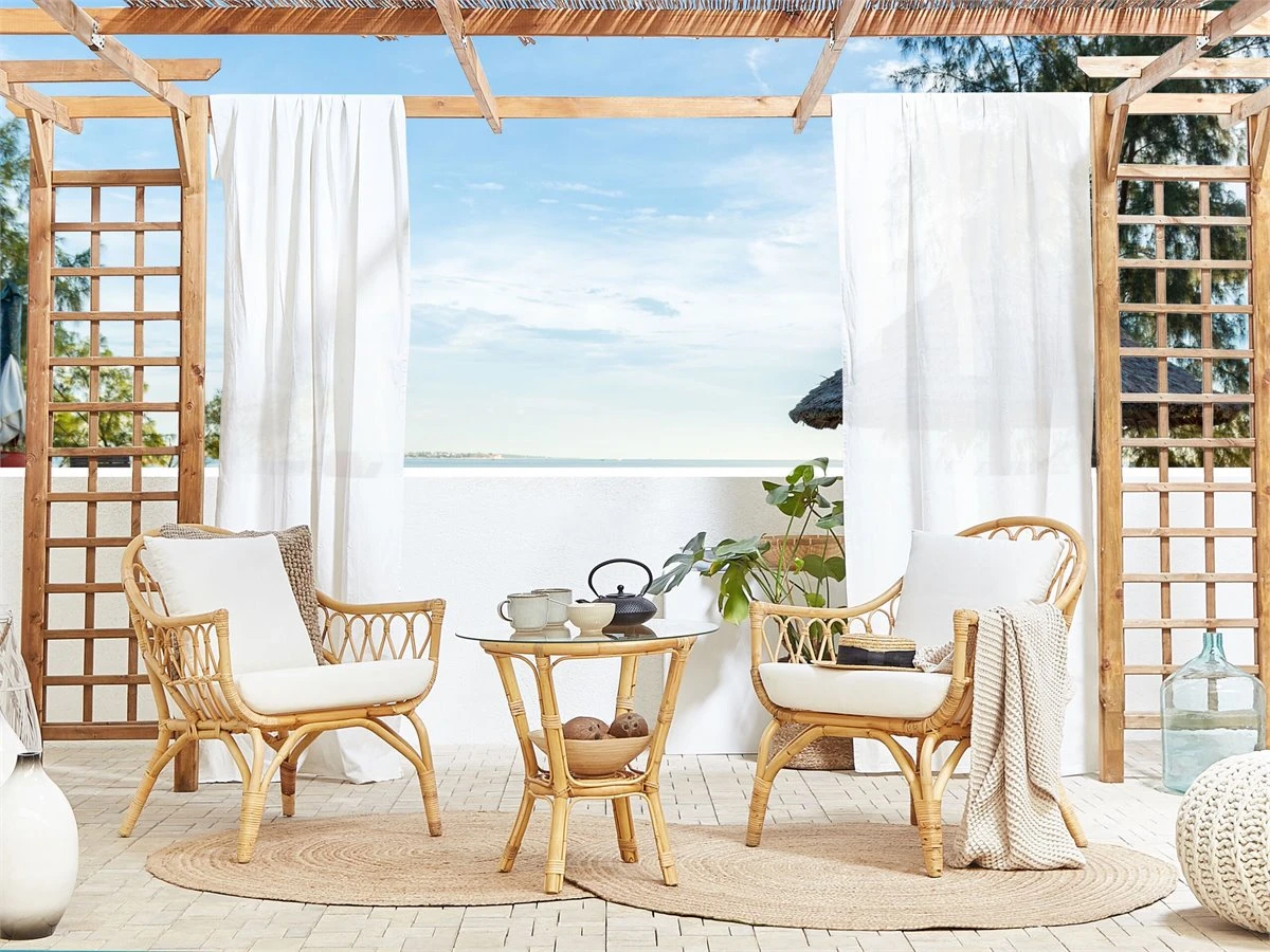 Juego de jardín. Este conjunto de ratán se adapta a cualquier espacio interior, patio o balcón. El patrón de tejido inspirado en formas vintage hace que el juego combine con estilos de decoración boho, retro y ecléctico. El sofá y los sillones incluyen cojines gruesos equipados con fundas extraíbles que facilitan la limpieza y el mantenimiento. La mesa de centro cuenta con un estante y el tablero de vidrio templado está asegurado con ventosas. Detalles: Tipo de Producto: Conjunto de jardín Estilo: Boho Color: Beige Tipo de material: Mimbre sintético Material principal: Ratán Material adicional: Vidrio templado Material de la superficie: Vidrio Composición del Material: 100% Algodón Densidad de espuma del asiento: 20 kg/m3 Dimensiones: Dimensiones del sofá de 2 plazas: 123x75x81 Dimensiones del sillón: 77x70x81 Dimensiones de la mesa de centro: 60x60x57 Espesor del asiento: 10 cm Altura del asiento: 41 cm Peso: 21 kg Capacidad de peso de la mesa: 30 kg Capacidad de peso por persona: 120 kg La oferta incluye: 1 x Sofá, 2 x Sillón, 1 x Mesa de centro, 3 x Cojín del asiento, 4 x Cojín del respaldo Ventajas: Las ventosas fijan el tablero de forma segura, Hecho a mano con la máxima precisión, Diseño moderno, Ideal para uso en interiores y exteriores, Apilable para un almacenaje mejor, Fundas extraíbles, Tablero en vidrio templado de seguridad, Materiales naturales Información de montaje: Requiere montaje parcial. 5-15 min. Información adicional: Ten en cuenta que el producto es sensible a condiciones climáticas adversas, por lo que, cuando no esté en uso, debe ser almacenado en el interior o en un lugar cubierto. El producto viene con un libro de cuidados detallado para ayudarte a mantener tus muebles en las mejores condiciones durante muchos años. Consulta estos consejos para garantizar el mantenimiento adecuado de tus muebles nuevos – encontrarás las instrucciones de mantenimiento junto con el manual de montaje. Texto de resistencia: Gracias a su resistencia al agua, puedes utilizar el producto al aire libre y dejarlo a la intemperie durante lluvias ligeras. Si no es posible guardarlo en un lugar cerrado y protegido, recomendamos utilizar una funda protectora. La exposición prolongada a la humedad puede provocar daños en el mueble. Resistencia: Agua ligera / humedad Consejos de mantenimiento: Ratán: 1.Evite la exposición prolongada a la luz solar directa intensa, así como el contacto con la humedad y la lluvia, 2.Limpiar con un paño suave húmedo y secar siempre después, 3.Los muebles deben almacenarse adentro cuando no estén en uso Algodón: 1.No secar en secadora y no planchar 2.Lavar a mano o seleccionar un ciclo de lavado de lana (30 ° C, a menos que el fabricante especifique lo contrario. Lavar del revés con la cremallera cerrada 3.Cuando no esté en uso, manténgalo en un lugar limpio y seco para protegerlo de las condiciones atmosféricas.