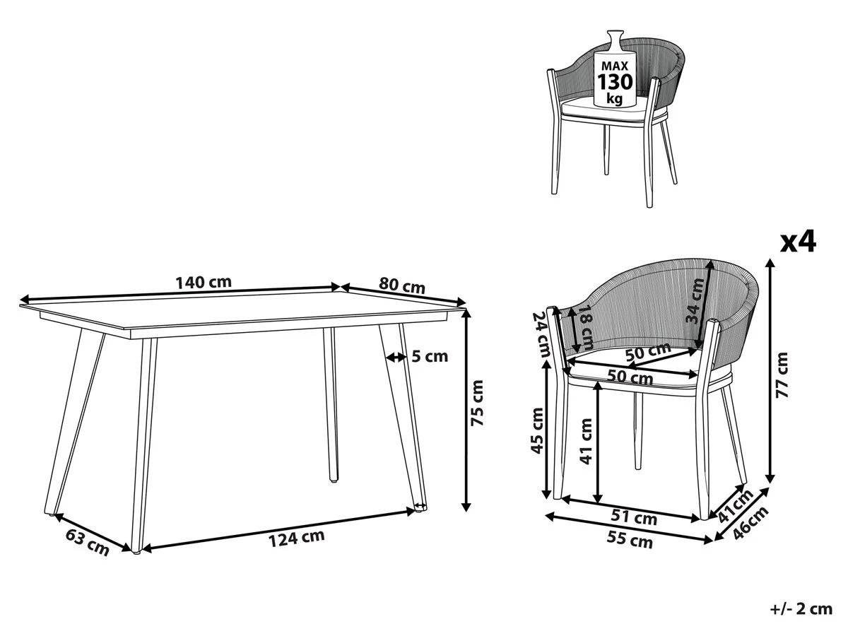 Conjunto de jardín 4 plazas. Este conjunto de jardín elegante y espacioso es el complemento perfecto para cualquier espacio al aire libre. La construcción fabricada de aluminio resistente y duradero aporta estabilidad. El respaldo y el asiento acolchado de las sillas garantizan la máxima comodidad. La mesa proporciona el suficiente espacio para hasta 4 personas. Detalles: Tipo de Producto: Conjunto de comedor Estilo: Retro Color: Gris Tonalidad: Gris oscuro Tipo de material: Metal Material principal: Aluminio Material adicional: Vidrio templado Material de la superficie: Vidrio Composición del Material: 100% Poliéster Acabado: Revestimiento en polvo Densidad de espuma del asiento: 28 kg/m3 Dimensiones: Dimensiones de la silla: 55x46x77 cm Espesor del asiento: 5 cm Altura del asiento: 45 cm Dimensiones de la mesa: 140x80x75 cm Peso: 51 kg Capacidad de peso de la silla: 130 kg Capacidad de peso de la mesa: 200 kg La oferta incluye: 4 x Silla, 1 x Mesa, 4 x Cojín del asiento Ventajas: Tablero grueso de vidrio templado resistente, Perfecto para todo tipo de exterior, Construcción muy estable, Resistencia UV 6 (ISO 105-B02, Ideal para uso al aire libre, Fundas extraíbles, Tablero en vidrio templado de seguridad Información de montaje: Requiere montaje parcial. 20-40 min. Información adicional: Abre el embalaje con cuidado, especialmente cuando utilizas herramientas afiladas o puntiagudas, ya que pueden dañar el producto Texto de resistencia: El producto es resistente al viento, por lo que no debe volcarse ni perder estabilidad con ráfagas de viento. Resistencia: Viento Consejos de mantenimiento: Aluminio: 1.Fuera de temporada, utilice una funda protectora o guarde los muebles en un lugar fresco y seco 2.Limpiar con agua jabonosa y detergentes suaves. Quitar el polvo con un paño suave. Vidrio templado: 1.Limpiar con un detergente suave o acondicionador de vidrio con un paño suave. Secar después de limpiar 2.Secar después de la lluvia o la nieve. Durante el invierno, utilice una funda protectora o guarde los muebles en el interior 3.Para evitar rayones, no use un limpiador cremoso. Poliéster: 1.No secar en secadora ni planchar 2.Lavar a mano únicamente, usar agua fría y un detergente suave 3.Cuando no esté en uso, manténgalo en un lugar limpio y seco para protegerlo de las condiciones atmosféricas.