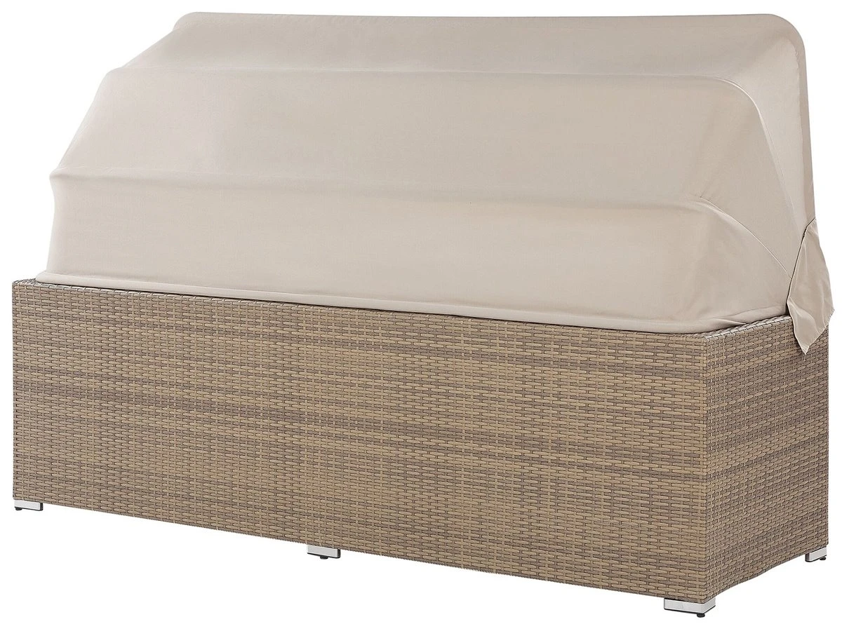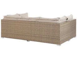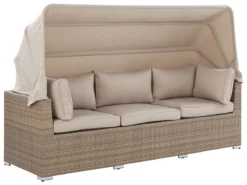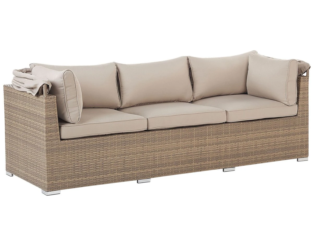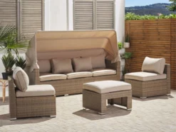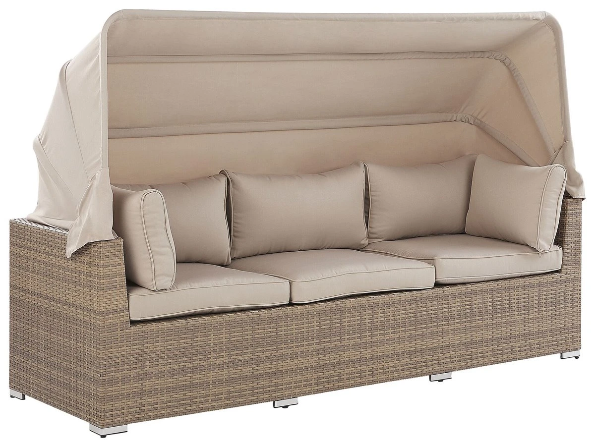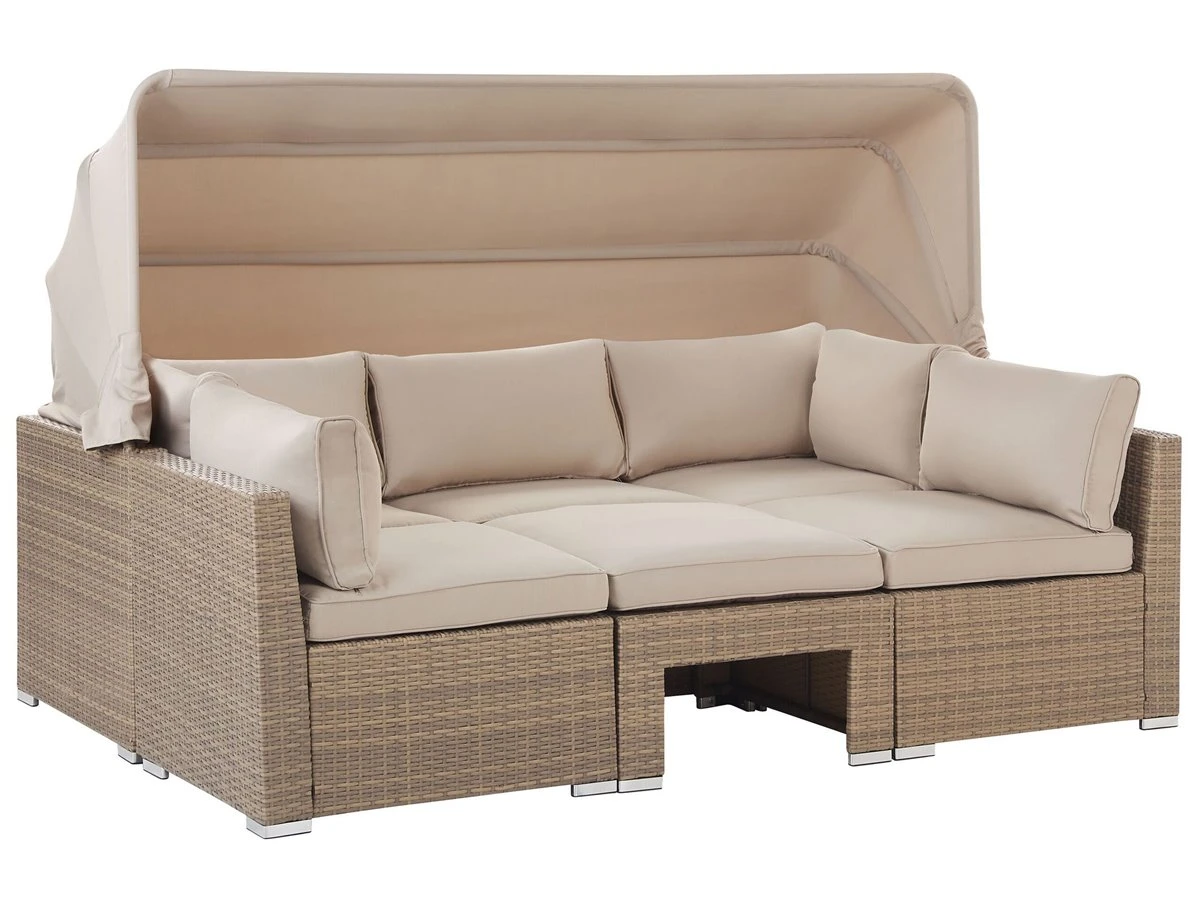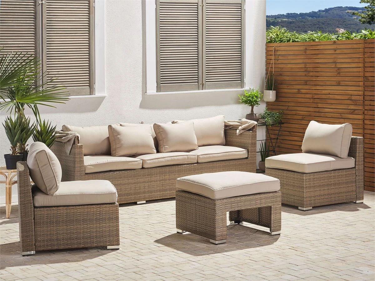 Conjunto de jardín 5 plazas de ratán color natural. Disfruta del calor del verano en compañía de la familia y amigos con este conjunto de jardín de 5 plazas. Fabricado de ratán sintético duradero de color natural, incluye un reposapiés multifuncional que se puede utilizar como otomana, asiento adicional o mesa de café. Los cojines garantizan la máxima comodidad al sentarse. Las fundas son extraíbles y se pueden lavar con facilidad. El juego incluye un dosel que protege de los rayos del sol o del viento cuando sea preciso. Detalles: Tipo de Producto: Conjunto longue Estilo: Moderno Color: Beige Tonalidad: Marrón claro Tipo de material: Ratán sintético Material principal: Ratán sintético Material adicional: Aluminio Composición del Material: 100% Poliéster Forma: Rectangular Acabado: Revestimiento en polvo Densidad de espuma del asiento: 24 kg/m3 Dimensiones: Dimensiones del sofá de 3 plazas: 213x76x146 Dimensiones del sillón: 64x74x66 Dimensiones del reposapies: 64x64x35 cm Espesor del asiento: 9 cm Altura del asiento: 44 cm Dimensiones totales: 213x140x146 Peso: 43 kg Capacidad de peso por persona: 150 kg La oferta incluye: 1 x Sofá, 1 x Puf, 2 x Silla, 6 x Cojines del asiento, 5 x Cojín del respaldo, 2 x Cojín Ventajas: La práctica cubertura brindará protección contra el viento y el sol, Construcción muy estable, Resistencia UV 5 (ISO 105-B02, Ideal para uso al aire libre, Varias posibilidades de ubicación, Fundas de cojines con costuras ocultas y cremalleras Información de montaje: Requiere montaje completo. 45-60 min. Texto de resistencia: Los muebles resistentes a los rayos UV muestran una mayor resistencia a la decoloración. Sin embargo, recomendamos que el producto se guarde en el interior cuando no esté en uso. Esto asegurará la máxima durabilidad de los muebles. Resistencia: Rayos UV Consejos de mantenimiento: Ratán sintético: 1.Para alargar la vida útil del mueble, protéjalo de la exposición directa al sol 2.Se recomienda utilizar una funda protectora para la temporada de invierno o, si es posible, para mantener los muebles secos y frescos en el interior 3.Limpiar con detergentes a base de jabón. No utilizar limpiadores químicos corrosivos 4.Los utensilios o accesorios de vidrio pueden sobrecalentar la superficie. Poliéster: 1.No secar en secadora y no planchar 2.Lavar a mano o seleccionar un ciclo de lavado de lana (30 ° C, a menos que el fabricante especifique lo contrario. Lavar del revés con la cremallera cerrada 3.Cuando no esté en uso, manténgalo en un lugar limpio y seco para protegerlo de las condiciones atmosféricas. Aluminio: 1.Fuera de temporada, utilice una funda protectora o guarde los muebles en un lugar fresco y seco 2.Limpiar con agua jabonosa y detergentes suaves. Quitar el polvo con un paño suave.