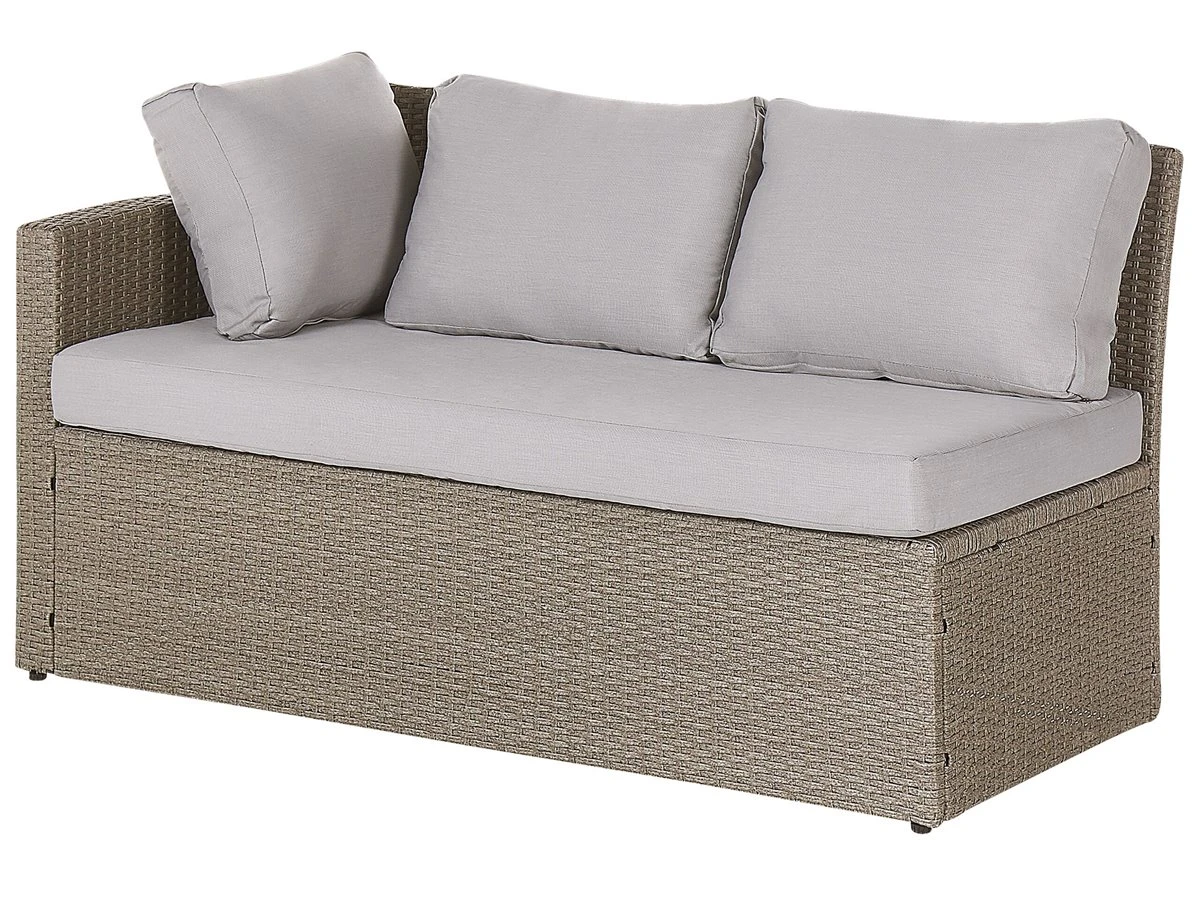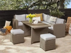 Set de jardín de ratán sintético. Crea el lugar perfecto para una reunión familiar o de amigos con este conjunto de jardín constituido por un sofá esquinero, una mesa de comedor y 2 otomanas. Está fabricado a partir de aluminio de alta calidad cubierto con ratán sintético. Incluye cojines de respaldo y asientos resistentes a los rayos UV con fundas extraíbles y cierres de cremallera. Detalles: Tipo de Producto: Conjunto de comedor Estilo: Tradicional Color: Beige Tonalidad: Gris pardo Tipo de material: Ratán sintético Material principal: Ratán sintético Material adicional: Poliéster Material de la superficie: Material sintético Composición del Material: 100% Poliéster Forma: Forma de L Densidad de espuma del asiento: 25 kg/m3 Dimensiones: Dimensiones de la mesa de centro: 130x70x68 Dimensiones del reposapies: 40x40x43 cm Espesor del asiento: 10 cm Altura del asiento: 45 cm Dimensiones totales: 201x177x74 Peso: 59 kg Capacidad de peso de la mesa: 45 kg Capacidad de peso por persona: 170 kg La oferta incluye: 1 x Sofá esquinero, 1 x Mesa, 2 x Puf, 6 x Cojín del respaldo, 6 x Cojines del asiento, No incluye: decoraciones Ventajas: Ideal para grandes reuniones con amigos y familiares, Diseño atemporal, Resistencia UV 5 (ISO 105-B02, Tejido sólido, Materiales de calidad, Fundas de cojines con costuras ocultas y cremalleras Información de montaje: Requiere montaje completo. Más de 60 min. Información adicional: El producto viene con un libro de cuidados detallado para ayudarte a mantener tus muebles en las mejores condiciones durante muchos años. Consulta estos consejos para garantizar el mantenimiento adecuado de tus muebles nuevos – encontrarás las instrucciones de mantenimiento junto con el manual de montaje. Texto de resistencia: Gracias a su resistencia al agua, puedes utilizar el producto al aire libre y dejarlo a la intemperie durante lluvias ligeras. Si no es posible guardarlo en un lugar cerrado y protegido, recomendamos utilizar una funda protectora. La exposición prolongada a la humedad puede provocar daños en el mueble. Resistencia: Agua ligera / humedad Consejos de mantenimiento: Ratán sintético: 1.Limpiar con detergentes a base de jabón. No utilizar limpiadores químicos corrosivos 2.Los utensilios o accesorios de vidrio pueden sobrecalentar la superficie 3.Para alargar la vida útil del mueble, protéjalo de la exposición directa al sol 4.Se recomienda utilizar una funda protectora para la temporada de invierno o, si es posible, para mantener los muebles secos y frescos en el interior. Poliéster: 1.Lavar a mano únicamente, usar agua fría y un detergente suave 2.Cuando no esté en uso, manténgalo en un lugar limpio y seco para protegerlo de las condiciones atmosféricas 3.No secar en secadora ni planchar. Madera plástica: 1.El material es extremadamente resistente a la intemperie. Sin embargo, se recomienda utilizar una funda protectora para la temporada de invierno o, si es posible, guardar los muebles en un lugar fresco y seco 2.Manténgalo alejado de fuentes de calor, como parrilla o fuego, ya que las chispas pueden causar daños graves. No coloque utensilios calientes directamente sobre la superficie, 3.Limpiar con un limpiador a base de jabón suave y un paño suave