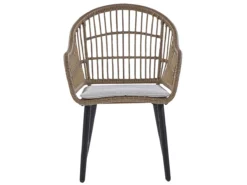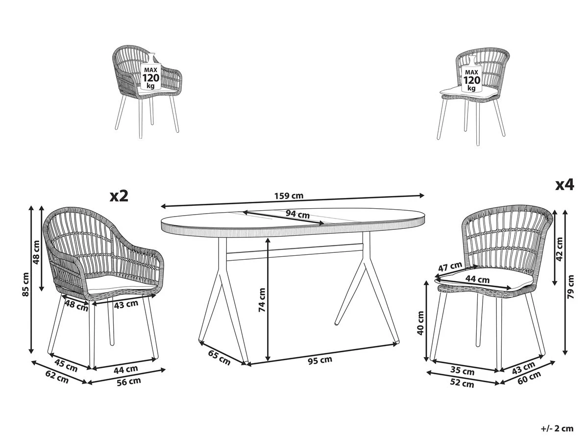 Conjunto de jardín con cojines de asiento. Organiza tus reuniones al aire libre con este conjunto de jardín de diseño moderno. Está constituido por una mesa y 6 sillas. El ratán sintético que cubre la estructura de metal aporta un aspecto clásico al diseño. Detalles: Tipo de Producto: Conjunto de comedor Estilo: Boho Color: Beige Tipo de material: Ratán sintético Material principal: Ratán sintético Material adicional: Acero Material de la superficie: Vidrio Composición del Material: 100% Poliéster Acabado: Revestimiento en polvo Densidad de espuma del asiento: 20 kg/m3 Dimensiones: Dimensiones de la silla: 60x52x79 cm Espesor del asiento: 2 cm Altura del asiento: 40 cm Dimensiones de la mesa: 159x94x74 cm Peso: 75 kg Capacidad de peso de la silla: 120 kg Capacidad de peso de la mesa: 60 kg La oferta incluye: 1 x Mesa, 2 x Sillón, 4 x Silla, 6 x Cojines del asiento Ventajas: Perfecto para cenar en grupos más grandes, Las tiras ofrecen una fijación segura, Diseño atemporal, Resistencia UV 5 (ISO 105-B02, Ideal para uso en interiores y exteriores, Tejido sólido, Tablero en vidrio templado de seguridad Información de montaje: Requiere montaje completo. 45-60 min. Texto de resistencia: Los muebles resistentes a los rayos UV muestran una mayor resistencia a la decoloración. Sin embargo, recomendamos que el producto se guarde en el interior cuando no esté en uso. Esto asegurará la máxima durabilidad de los muebles. Resistencia: Rayos UV Consejos de mantenimiento: Ratán sintético: 1.Para alargar la vida útil del mueble, protéjalo de la exposición directa al sol 2.Se recomienda utilizar una funda protectora para la temporada de invierno o, si es posible, para mantener los muebles secos y frescos en el interior 3.Limpiar con detergentes a base de jabón. No utilizar limpiadores químicos corrosivos 4.Los utensilios o accesorios de vidrio pueden sobrecalentar la superficie. Acero: 1.Quite las tapas protectoras con regularidad para que salga todo el líquido, déjelas secar y utilice un spray anticorrosión si es necesario 2.Limpiar con detergentes suaves 3.Los muebles de acero y sus elementos no deben exponerse al agua. De lo contrario, existe la posibilidad de que el agua oxidada salga de las tuberías del marco 4.Cuando no estén en uso, los muebles deben guardarse en el interior o bajo una cubierta protectora 5.Para aumentar la durabilidad del artículo, manténgalo seco y recuerde la limpieza regular 6.Cualquier daño a la capa de pintura exterior debe protegerse de la humedad 7.Para garantizar la protección contra la corrosión, evite los limpiadores alcalinos o ácidos. Después de limpiar, secar bien. Poliéster: 1.No secar en secadora ni planchar 2.Lavar a mano únicamente, usar agua fría y un detergente suave 3.Cuando no esté en uso, manténgalo en un lugar limpio y seco para protegerlo de las condiciones atmosféricas.