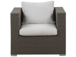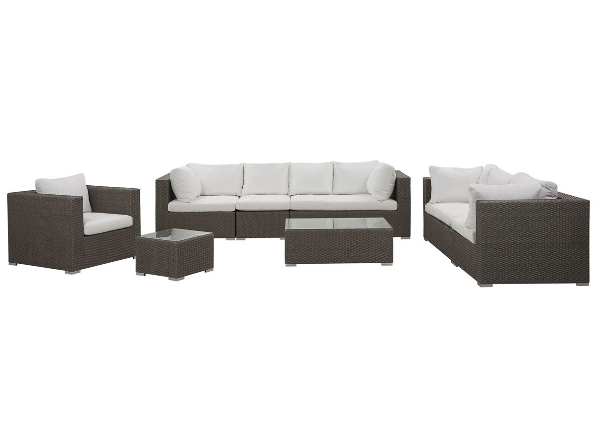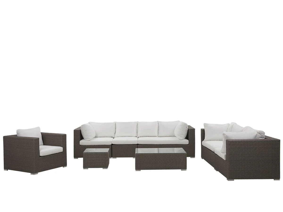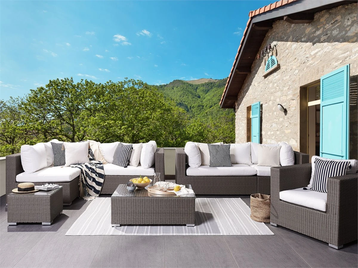 Moderno conjunto de jardín de ratán sintético. Un elegante juego de jardín que transformará tu patio en un salón al aire libre. Los marcos de aluminio están cubiertos con ratán sintético que garantiza la durabilidad de los muebles. Los asientos profundos y cómodos vienen con reposabrazos prácticos y respaldos bien formados. Los cojines de espuma de alta densidad están cubiertos con un tejido repelente al agua y resistente a las manchas. Todas las piezas se pueden mover fácilmente para que puedas organizarlas como desees. Detalles: Tipo de Producto: Conjunto de jardín Estilo: Tradicional Color: Marrón Tonalidad: Blanco crema Tipo de material: Ratán sintético Material principal: Ratán sintético Material adicional: Poliéster Composición del Material: 100% Poliéster Acabado: Revestimiento en polvo Densidad de espuma del asiento: 25 kg/m3 Dimensiones: Dimensiones del sofá de 2 plazas: 225x90x70 Dimensiones del sofá de 3 plazas: 282x90x70 Dimensiones del sillón: 90x90x70 Dimensiones de la mesa de centro: 100x70x35 Espesor del asiento: 5 cm Altura del asiento: 38 cm Dimensiones de la mesa auxiliar: 50x50x35 Peso: 126 kg Capacidad de peso de la mesa: 30 kg Capacidad de peso por persona: 100 kg La oferta incluye: 2 x Rinconera, 2 x Rinconera, 1 x Módulo central, 1 x Sillón, 1 x Mesa de centro, 1 x Mesa auxiliar, 6 x Cojines del asiento, 12 x Cojín del respaldo Ventajas: Ideal para grandes reuniones con amigos y familiares, Las ventosas fijan el tablero de forma segura, Resistencia UV 6 (ISO 105-B02, Tejido sólido, Materiales de calidad, Fundas de cojines con costuras ocultas y cremalleras, Tablero en vidrio templado de seguridad Información de montaje: No requiere montaje Información adicional: El contacto prolongado con el agua puede causar decoloración y deformación. Para prolongar la durabilidad de los muebles, se recomienda utilizar una cubierta protectora en condiciones climáticas adversas. Abre el embalaje con cuidado, especialmente cuando utilizas herramientas afiladas o puntiagudas, ya que pueden dañar el producto Texto de resistencia: Gracias a su resistencia al agua, puedes utilizar el producto al aire libre y dejarlo a la intemperie durante lluvias ligeras. Si no es posible guardarlo en un lugar cerrado y protegido, recomendamos utilizar una funda protectora. La exposición prolongada a la humedad puede provocar daños en el mueble. Resistencia: Agua ligera / humedad Consejos de mantenimiento: Ratán sintético: 1.Los utensilios o accesorios de vidrio pueden sobrecalentar la superficie 2.Para alargar la vida útil del mueble, protéjalo de la exposición directa al sol 3.Se recomienda utilizar una funda protectora para la temporada de invierno o, si es posible, para mantener los muebles secos y frescos en el interior 4.Limpiar con detergentes a base de jabón. No utilizar limpiadores químicos corrosivos. Poliéster: 1.Cuando no esté en uso, manténgalo en un lugar limpio y seco para protegerlo de las condiciones atmosféricas 2.No secar en secadora y no planchar 3.Lavar a mano o seleccionar un ciclo de lavado de lana (30 ° C, a menos que el fabricante especifique lo contrario. Lavar del revés con la cremallera cerrada.