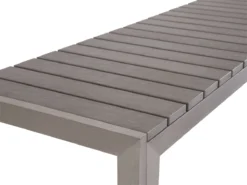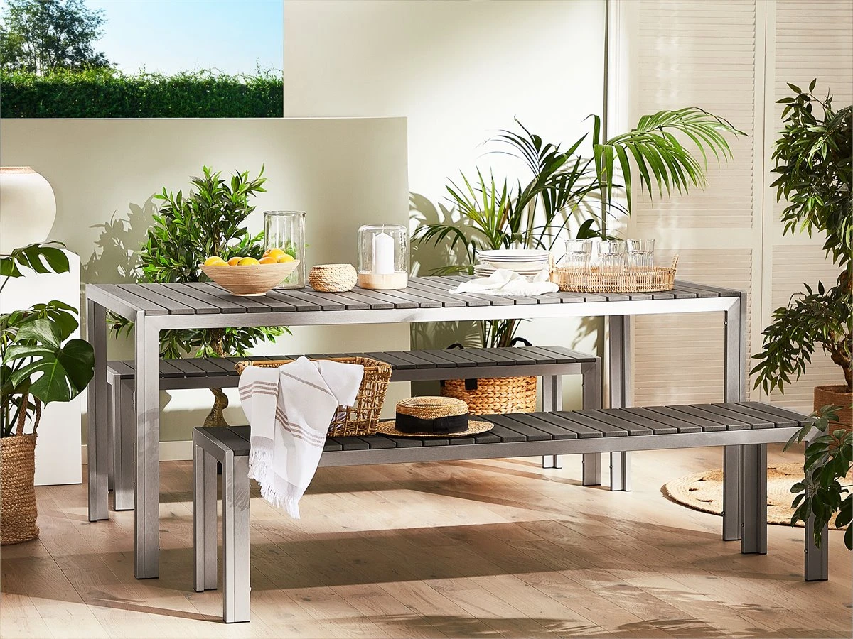 Conjunto de exterior Mesa y 2 Bancos. Un moderno juego de comedor al aire libre que hace que tu jardín o patio sea más elegante y práctico. Hecho de materiales resistentes, incluido un marco de aluminio cepillado, el conjunto es resistente y duradero. Los amplios asientos aseguran suficiente espacio para todos tus invitados y familiares. El diseño de este conjunto de muebles se ve bien combinado con cualquier decoración contemporánea o moderna. Detalles: Tipo de Producto: Conjunto de comedor Estilo: Moderno Color: Madera clara Tipo de material: Material sintético Material principal: Madera plástica Material adicional: Aluminio Material de la superficie: Material sintético Acabado: Revestimiento en polvo Dimensiones: Dimensiones del banco: 165x40x45 Altura del asiento: 45 cm Dimensiones de la mesa: 180x90x75 cm Peso: 56 kg Capacidad de peso de la mesa: 100 kg La oferta incluye: 1 x Mesa, 2 x Banco Ventajas: Asiento extremadamente cómodo, Perfecto para todo tipo de exterior, Resistencia UV, Muy fácil de conservar, Robusto marco resistente a la corrosión, Ideal para uso al aire libre, Resiste a todo tipo de clima Información de montaje: Requiere montaje parcial. 45-60 min. Información adicional: Evita colocar objetos de vidrio sobre la superficie del producto. Este material aumenta la temperatura de la luz solar, lo que puede causar sobrecalentamiento y daños al artículo. El producto viene con un libro de cuidados detallado para ayudarte a mantener tus muebles en las mejores condiciones durante muchos años. Consulta estos consejos para garantizar el mantenimiento adecuado de tus muebles nuevos – encontrarás las instrucciones de mantenimiento junto con el manual de montaje. Texto de resistencia: Gracias al acabado especial, la superficie del producto es resistente a la oxidación. Esto significa que se puede utilizar en exteriores. Cuando el producto no esté en uso, se recomienda cubrirlo con una cubierta o colocarlo en un lugar seco. Resistencia: Intemperie Consejos de mantenimiento: Madera plástica: 1.Manténgalo alejado de fuentes de calor, como parrilla o fuego, ya que las chispas pueden causar daños graves. No coloque utensilios calientes directamente sobre la superficie, 2.Limpiar con un limpiador a base de jabón suave y un paño suave, 3.El material es extremadamente resistente a la intemperie. Sin embargo, se recomienda utilizar una funda protectora para la temporada de invierno o, si es posible, guardar los muebles en un lugar fresco y seco. Aluminio: 1.Fuera de temporada, utilice una funda protectora o guarde los muebles en un lugar fresco y seco 2.Limpiar con agua jabonosa y detergentes suaves. Quitar el polvo con un paño suave.
