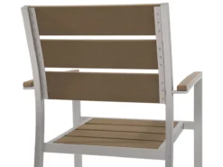 Conjunto de jardín en madera sintética marrón. El conjunto de jardín. La superficie del asiento junto a los amplios apoyabrazos, asegura una experiencia totalmente confortable. Su solida estructura de aluminio combina perfectamente con la parte superior, en poli madera de alta calidad. Los producto en madera sintética son una alternativa ecológica a los muebles tradicionales de madera. Fabricado a partir de materiales sintéticos reciclados, este juego conserva el aspecto y la sensación de la madera natural. El material es adecuado para el aire libre y soporta la intemperie. Color: marrón. Material del tablero: Poli madera de alta calidad. Estructura y patas: aluminio. Detalles: Tipo de Producto: Conjunto de comedor Estilo: Moderno Color: Madera clara Tipo de material: Material sintético Material principal: Madera plástica Material adicional: Aluminio Material de la superficie: Material sintético Acabado: Revestimiento en polvo Dimensiones: Dimensiones de la silla: 54x57x88 cm Altura del asiento: 41 cm Dimensiones de la mesa: 180x90x76 cm Peso: 65 kg Capacidad de peso de la silla: 150 kg Capacidad de peso de la mesa: 150 kg La oferta incluye: 1 x Mesa, 6 x Silla Ventajas: Perfecto para todo tipo de exterior, Diseño atemporal, Ideal para uso en interiores y exteriores, Muy fácil de conservar, Apilable, ahorra espacio Información de montaje: Requiere montaje parcial. 20-40 min. Información adicional: Evita colocar objetos de vidrio sobre la superficie del producto. Este material aumenta la temperatura de la luz solar, lo que puede causar sobrecalentamiento y daños al artículo. El producto viene con un libro de cuidados detallado para ayudarte a mantener tus muebles en las mejores condiciones durante muchos años. Consulta estos consejos para garantizar el mantenimiento adecuado de tus muebles nuevos – encontrarás las instrucciones de mantenimiento junto con el manual de montaje. Texto de resistencia: El producto es resistente al agua, lo que significa que no se dañará expuesto a la lluvia o en contacto con otros líquidos. Puede dejarlo al aire libre incluso durante fuertes lluvias o humedad. Durante la temporada de invierno es recomendable almacenar el producto en el interior o bajo una cubierta impermeable. Resistencia: Agua Consejos de mantenimiento: Aluminio: 1.Limpiar con agua jabonosa y detergentes suaves. Quitar el polvo con un paño suave 2.Fuera de temporada, utilice una funda protectora o guarde los muebles en un lugar fresco y seco. Madera plástica: 1.El material es extremadamente resistente a la intemperie. Sin embargo, se recomienda utilizar una funda protectora para la temporada de invierno o, si es posible, guardar los muebles en un lugar fresco y seco 2.Manténgalo alejado de fuentes de calor, como parrilla o fuego, ya que las chispas pueden causar daños graves. No coloque utensilios calientes directamente sobre la superficie, 3.Limpiar con un limpiador a base de jabón suave y un paño suave