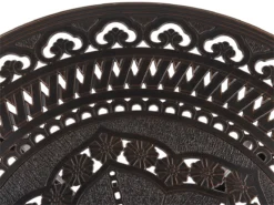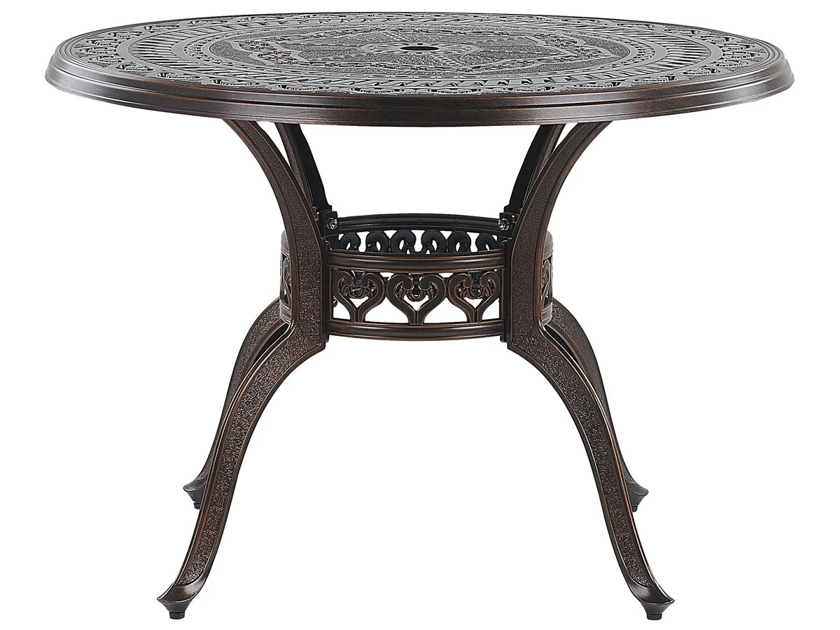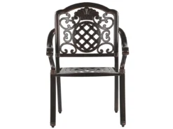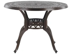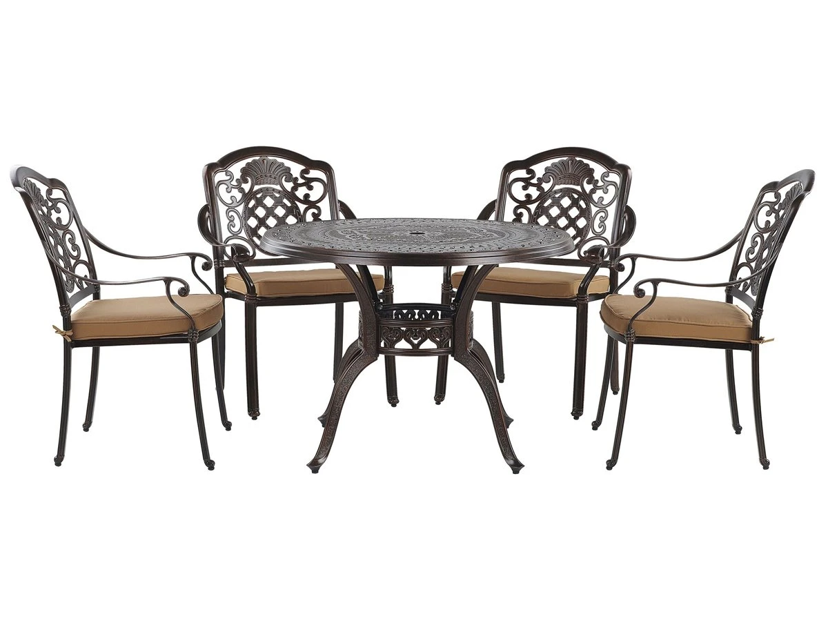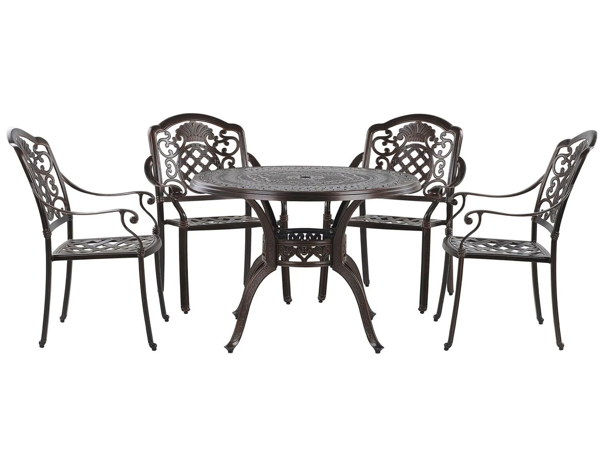 Conjunto de jardín para 4 personas estilo retro. Este juego de comedor al aire libre compuesto por una mesa y 4 sillas funcionará perfectamente tanto en un balcón como en un jardín. Inspirado en el estilo retro, el conjunto tiene detalles precisos que le dan un encanto increíble. La mesa redonda y las sillas están hechas de aluminio de alta calidad, que es duradero y estable. Los cojines acolchados gruesos garantizan la máxima comodidad al sentarse. Detalles: Tipo de Producto: Conjunto de comedor Estilo: Retro Color: Marrón Tonalidad: Marrón oscuro Tipo de material: Metal Material principal: Aluminio Material adicional: Poliéster Material de la superficie: Metal Composición del Material: 100% Poliéster Acabado: Pulido Densidad de espuma del asiento: 28 kg/m3 Dimensiones: Dimensiones de la silla: 64x69x93 cm Espesor del asiento: 5 cm Altura del asiento: 40 cm Dimensiones de la mesa: 102x102x72 cm Peso: 50 kg Capacidad de peso de la silla: 150 kg Capacidad de peso de la mesa: 150 kg La oferta incluye: 1 x Mesa, 4 x Silla, 4 x Cojín del asiento Ventajas: Tablero con agujero para sombrilla, Ancha superficie del asiento, Diseño tradicional con un toque moderno, Robusto marco resistente a la corrosión, Resistencia UV 4 (ISO 105-B05, Apilable para un almacenaje mejor, Fundas extraíbles Información de montaje: Requiere montaje completo. 20-40 min. Información adicional: El efecto desgastado o las manchas visibles son intencionales y no se consideran un defecto. Texto de resistencia: El producto es resistente al agua, lo que significa que no se dañará expuesto a la lluvia o en contacto con otros líquidos. Puede dejarlo al aire libre incluso durante fuertes lluvias o humedad. Durante la temporada de invierno es recomendable almacenar el producto en el interior o bajo una cubierta impermeable. Resistencia: Agua Consejos de mantenimiento: Aluminio: 1.Fuera de temporada, utilice una funda protectora o guarde los muebles en un lugar fresco y seco 2.Limpiar con agua jabonosa y detergentes suaves. Quitar el polvo con un paño suave. Poliéster: 1.No secar en secadora ni planchar 2.Lavar a mano únicamente, usar agua fría y un detergente suave 3.Cuando no esté en uso, manténgalo en un lugar limpio y seco para protegerlo de las condiciones atmosféricas.