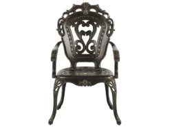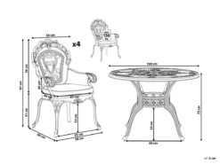 Conjunto de jardín estilo vintage. Mejora la decoración de tu espacio al aire libre con este juego de comedor de inspiración vintage. Ligero pero duradero gracias a la construcción de aluminio, el conjunto incluye una mesa redonda y cuatro sillas. Cuenta con hermosas líneas curvilíneas, patrones intrincados y acabado marrón que le dan un aspecto único y sofisticado. El juego viene con cuatro cojines de asiento rellenas de espuma ligera para mayor comodidad. Detalles: Tipo de Producto: Conjunto de comedor Estilo: Retro Color: Marrón Tonalidad: Marrón oscuro Tipo de material: Metal Material principal: Aluminio Material adicional: Poliéster Material de la superficie: Metal Composición del Material: 100% Poliéster Acabado: Pulido Densidad de espuma del asiento: 28 kg/m3 Dimensiones: Dimensiones de la silla: 58x97x69 cm Espesor del asiento: 5 cm Altura del asiento: 41 cm Dimensiones de la mesa: 100x72x100 cm Peso: 39 kg Capacidad de peso de la silla: 150 kg Capacidad de peso de la mesa: 150 kg La oferta incluye: 4 x Silla, 1 x Mesa, 4 x Cojín del asiento Ventajas: Tablero con agujero para sombrilla, Diseño elegante, Robusto marco resistente a la corrosión, Pieza estable y robusta, Resistencia UV 4 (ISO 105-B02, Ideal para uso al aire libre, Fundas extraíbles Información de montaje: Requiere montaje de las patas. 20-40 min. Información adicional: El efecto desgastado o las manchas visibles son intencionales y no se consideran un defecto. Texto de resistencia: El producto es resistente al agua, lo que significa que no se dañará expuesto a la lluvia o en contacto con otros líquidos. Puede dejarlo al aire libre incluso durante fuertes lluvias o humedad. Durante la temporada de invierno es recomendable almacenar el producto en el interior o bajo una cubierta impermeable. Resistencia: Agua Consejos de mantenimiento: Aluminio: 1.Limpiar con agua jabonosa y detergentes suaves. Quitar el polvo con un paño suave 2.Fuera de temporada, utilice una funda protectora o guarde los muebles en un lugar fresco y seco.