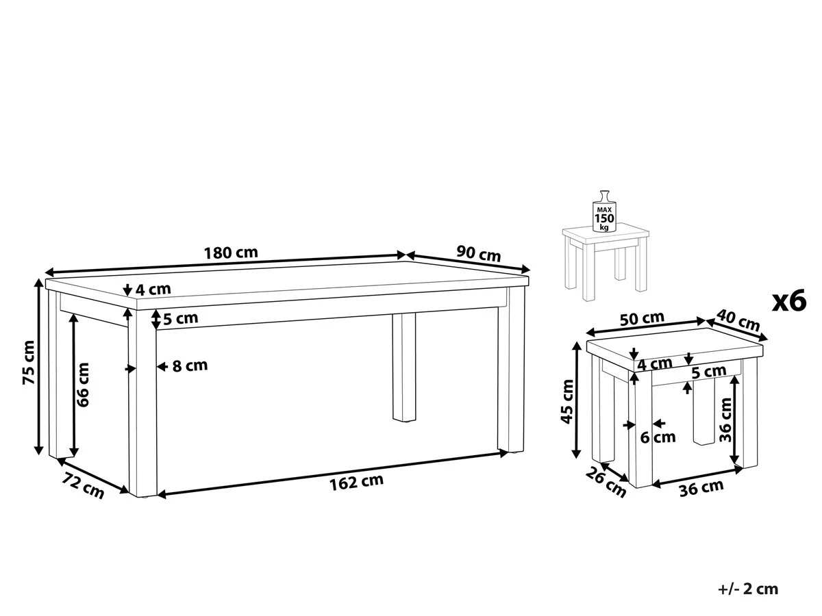 Conjunto de jardín mesa y 6 taburetes. Si te gustan el estilo industrial y las reuniones al aire libre con familia o amigos, este conjunto de jardín es perfecto para ti. El set consta de una mesa y 6 taburetes y cada pieza está constituida de cemento reforzado combinado con una base de madera. La madera de acacia en acabado natural garantiza durabilidad y ofrece un aspecto clásico, aprovechando su estética natural. Colócalo en un jardín o terraza y disfruta de este juego de comedor para 6 personas. Detalles: Tipo de Producto: Conjunto de comedor Estilo: Industrial Color: Gris Tipo de material: Cemento Material principal: Cemento reforzado con fibra Material adicional: Madera de acacia Material de la superficie: Cemento Acabado: Mate Dimensiones: Dimensiones de la silla: 50x40x45 cm Altura del asiento: 40 cm Dimensiones de la mesa: 180x90x76 cm Peso: 109 kg Capacidad de peso de la silla: 150 kg Capacidad de peso de la mesa: 60 kg La oferta incluye: 1 x Mesa, 6 x Taburete Ventajas: Ideal para grandes reuniones con amigos y familiares, Patas estables y resistentes, Colores elegantes y diseño original, Ideal para uso en interiores y exteriores, Fabricación sólida y precisa Información de montaje: Requiere montaje de las patas. 20-40 min. Información adicional: Dependiendo de la humedad del aire, los muebles de concreto pueden tener grietas, agujeros o cambiar de color. Es una característica natural del material y no afecta su calidad. El producto viene con un libro de cuidados detallado para ayudarte a mantener tus muebles en las mejores condiciones durante muchos años. Consulta estos consejos para garantizar el mantenimiento adecuado de tus muebles nuevos – encontrarás las instrucciones de mantenimiento junto con el manual de montaje. Texto de resistencia: El producto es resistente al viento, por lo que no debe volcarse ni perder estabilidad con ráfagas de viento. Resistencia: Agua ligera / humedad Consejos de mantenimiento: Cemento reforzado con fibra: 1.Durante el invierno utilice una funda protectora o guarde los muebles en el interior 2.Para evitar manchas, no utilice detergentes cremosos o detergentes con ácidos o aceites. Madera de acacia: 1.Durante el invierno o en condiciones climáticas adversas, utilice una funda protectora o guarde los muebles en el interior 2.Los muebles con acabado de aceite deben volverse a engrasar antes de ponerlos en uso y al menos una vez al año, especialmente en el clima húmedo 3.Limpiar con un limpiador suave y un paño suave en la dirección de la veta. Secar con un paño inmediatamente después de limpiar.