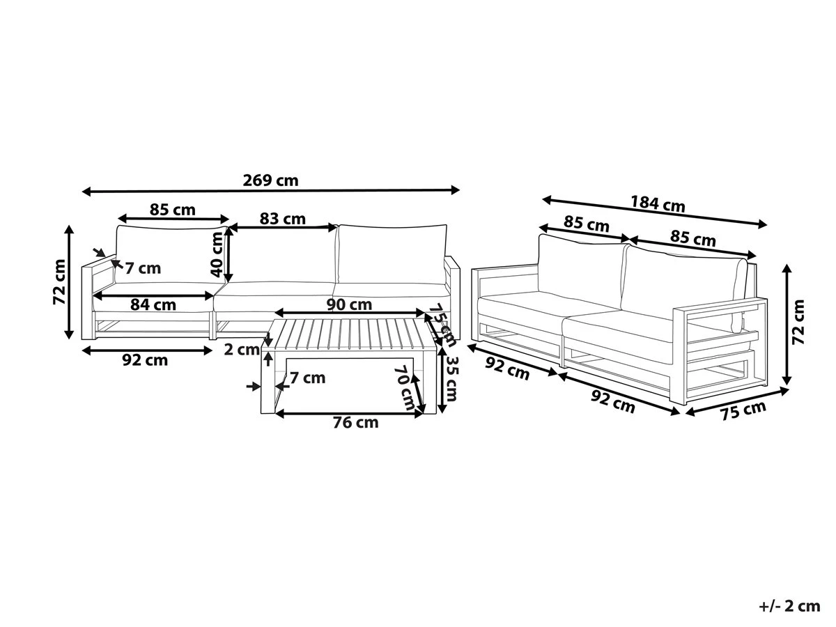 Juego de exterior. Añade comodidad a tu zona exterior con este conjunto de sala de estar para jardín. Está fabricado a partir de madera de acacia resistente y de alta calidad. Puedes disponer los distintos asientos de forma conjunta o por separado. Los cojines de asiento y el respaldo de acolchado grueso proporcionan la máxima comodidad. Detalles: Tipo de Producto: Conjunto de jardín Estilo: Moderno Color: Madera oscura Tonalidad: Gris pardo Tipo de material: Madera maciza Material principal: Madera de acacia Material adicional: Poliéster Material de la superficie: Madera maciza Composición del Material: 100% Poliéster Acabado: Aceitado Densidad de espuma del asiento: 20 kg/m3 Dimensiones: Dimensiones del sofá de 2 plazas: 184x75x72 Dimensiones del sofá de 3 plazas: 269x75x72 Dimensiones de la mesa de centro: 90x75x35 Espesor del asiento: 12 cm Altura del asiento: 32 cm Peso: 91 kg Capacidad de peso de la mesa: 60 kg Capacidad de peso por persona: 160 kg La oferta incluye: 1 x Mesa de centro, 1 x Sofá de 3 plazas, 1 x Sofá de 2 plazas, Cojines incluidos Ventajas: Varios módulos brindan versatilidad (rinconera a la izquierda o a la derecha, Brinda comodidad y relajación, Perfecto para todo tipo de exterior, Materiales de la más alta calidad, Resistencia UV 3 (ISO 105-B02, Fundas extraíbles Información de montaje: Requiere montaje completo. Más de 60 min. Información adicional: El producto viene con un libro de cuidados detallado para ayudarte a mantener tus muebles en las mejores condiciones durante muchos años. Consulta estos consejos para garantizar el mantenimiento adecuado de tus muebles nuevos – encontrarás las instrucciones de mantenimiento junto con el manual de montaje. Texto de resistencia: Los muebles resistentes a los rayos UV muestran una mayor resistencia a la decoloración. Sin embargo, recomendamos que el producto se guarde en el interior cuando no esté en uso. Esto asegurará la máxima durabilidad de los muebles. Resistencia: Rayos UV Consejos de mantenimiento: Madera de acacia: 1.Los muebles con acabado de aceite deben volverse a engrasar antes de ponerlos en uso y al menos una vez al año, especialmente en el clima húmedo 2.Limpiar con un limpiador suave y un paño suave en la dirección de la veta. Secar con un paño inmediatamente después de limpiar 3.Durante el invierno o en condiciones climáticas adversas, utilice una funda protectora o guarde los muebles en el interior. Poliéster: 1.Lavar a mano únicamente, usar agua fría y un detergente suave 2.Cuando no esté en uso, manténgalo en un lugar limpio y seco para protegerlo de las condiciones atmosféricas 3.No secar en secadora ni planchar.