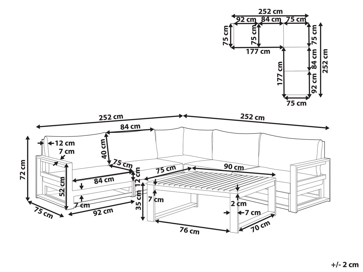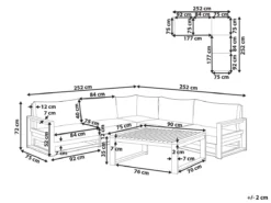 Juego de exterior. Añade comodidad a tu zona exterior con este conjunto de sala de estar para jardín. Está fabricado a partir de madera de acacia resistente y de alta calidad. Puedes disponer los distintos asientos de forma conjunta o por separado. Los cojines de asiento y el respaldo de acolchado grueso proporcionan la máxima comodidad. Detalles: Tipo de Producto: Conjunto longue Estilo: Moderno Color: Madera oscura Tonalidad: Gris pardo Tipo de material: Madera maciza Material principal: Madera de acacia Material adicional: Poliéster Material de la superficie: Madera maciza Composición del Material: 100% Poliéster Forma: Forma de L Acabado: Aceitado Orientación: Universal Densidad de espuma del asiento: 20 kg/m3 Dimensiones: Dimensiones de la mesa de centro: 90x75x35 Espesor del asiento: 12 cm Altura del asiento: 32 cm Dimensiones totales: 252x252x72 Peso: 88 kg Capacidad de peso de la mesa: 60 kg Capacidad de peso por persona: 160 kg La oferta incluye: 1 x Mesa de centro, 1 x Sofá esquinero, Cojines incluidos Ventajas: Varios módulos brindan versatilidad (rinconera a la izquierda o a la derecha, Brinda comodidad y relajación, Perfecto para todo tipo de exterior, Materiales de la más alta calidad, Resistencia UV 3 (ISO 105-B02, Fundas extraíbles Información de montaje: Requiere montaje completo. Más de 60 min. Información adicional: El producto viene con un libro de cuidados detallado para ayudarte a mantener tus muebles en las mejores condiciones durante muchos años. Consulta estos consejos para garantizar el mantenimiento adecuado de tus muebles nuevos – encontrarás las instrucciones de mantenimiento junto con el manual de montaje. Texto de resistencia: Los muebles resistentes a los rayos UV muestran una mayor resistencia a la decoloración. Sin embargo, recomendamos que el producto se guarde en el interior cuando no esté en uso. Esto asegurará la máxima durabilidad de los muebles. Resistencia: Rayos UV Consejos de mantenimiento: Madera de acacia: 1.Los muebles con acabado de aceite deben volverse a engrasar antes de ponerlos en uso y al menos una vez al año, especialmente en el clima húmedo 2.Limpiar con un limpiador suave y un paño suave en la dirección de la veta. Secar con un paño inmediatamente después de limpiar 3.Durante el invierno o en condiciones climáticas adversas, utilice una funda protectora o guarde los muebles en el interior. Poliéster: 1.No secar en secadora ni planchar 2.Lavar a mano únicamente, usar agua fría y un detergente suave 3.Cuando no esté en uso, manténgalo en un lugar limpio y seco para protegerlo de las condiciones atmosféricas.