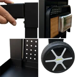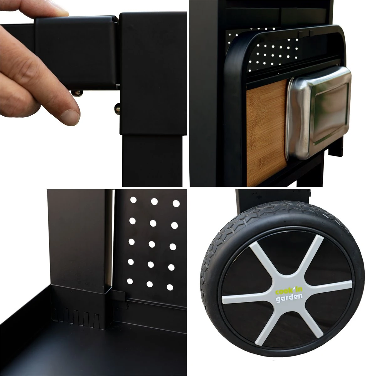 Elija un accesorio de jardín completo para ayudarle a preparar sus comidas de verano. Este carro de jardín es fácil de trasladar de la cocina a su terraza gracias a sus dos ruedas, lo que le permite llevar todo lo que necesita para hacer sus parrilladas de plancha. Dispone de dos placas perforadas, una de las cuales puede utilizarse como credenza para proteger la placa de cocción del viento. Esto significa que tiene una superficie de trabajo, una bandeja baja y un estante lateral, que se puede plegar para ahorrar espacio al guardar el carro. Este carro de plancha está equipado con accesorios como una tabla de cortar, una bandeja de especias, ganchos, etc.