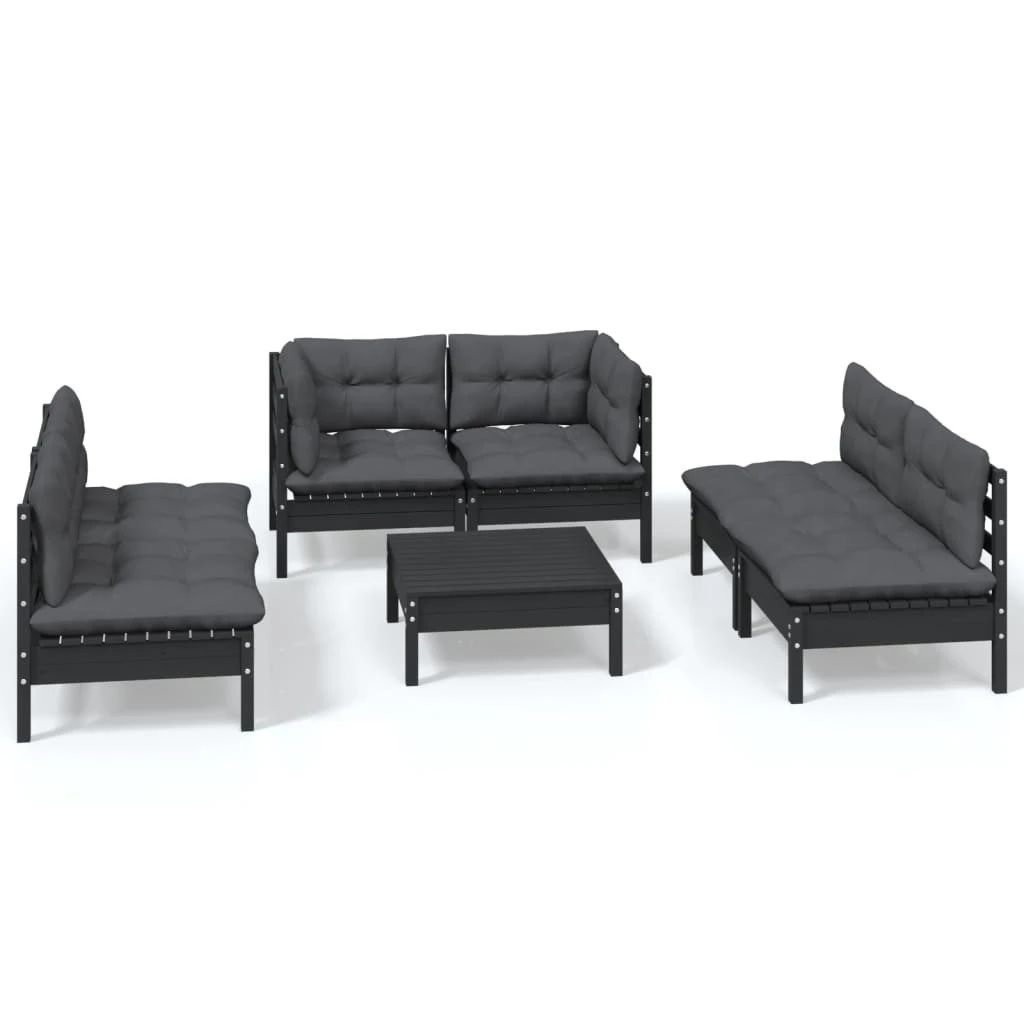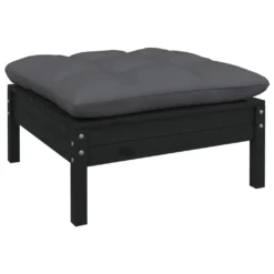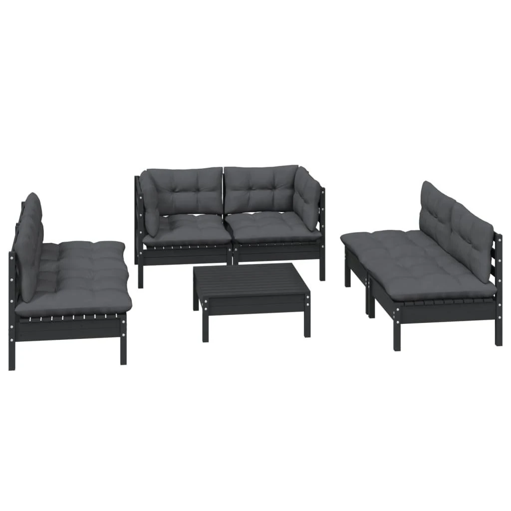 Este juego de muebles de jardín es una excelente opción para relajarte y disfrutar del buen tiempo, echar una siesta o charlar con tu familia o amigos. El conjunto de muebles de jardín está hecho de madera maciza de pino, lo que lo hace robusto y estable. ¡Puedes combinarlo con otros segmentos modulares para crear tus propias configuraciones de set de salón de jardín personal! Nota: Para prolongar la vida de tus muebles de exterior, te recomendamos que los protejas con una funda impermeable. Color: NegroColor de cojín: Gris antracita oscuroMaterial: Madera maciza de pino, tela (100% poliésterDimensiones del sofá de esquina: 63,5 x 63,5 x 62,5 cm (ancho x profundo x altoDimensiones del sofá central: 63,5 x 63,5 x 62,5 cm (ancho x profundo x altoDimensiones del reposapiés/mesa: 63,5 x 63,5 x 28,5 cm (ancho x profundo x altoDimensiones del cojín de asiento: 60 x 60 x 5 cm (largo x ancho x grosorDimensiones del cojín de respaldo: 60 x 32 x 5 cm (largo x ancho x grosorRequiere montaje: SíLa entrega contiene:2 x Sofás esquineros2 x Sofás centrales1 x Taburete/mesa7 x Cojines de asiento8 x Cojines de respaldo