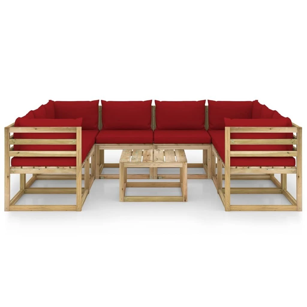Este juego de muebles para jardín está pensado para ser la opción ideal para relajarse y disfrutar del buen tiempo, echar una siesta o charlar con tu familia o amigos. Con un diseño de palés atemporal, el conjunto de sofás de madera añade un toque de encanto rústico a tu patio, jardín o sala de estar. Hecho de madera de pino impregnada, el juego de muebles de palés es duradero, resistente a la intemperie y respetuoso con el medio ambiente. Este set de sofás de exterior tiene una estructura maciza y requiere poco mantenimiento. Con cojines blandos y bien acolchados (no incluidos, el juego de sofás te brinda la máxima comodidad. Además, el diseño modular te permite colocar el conjunto de la forma que más te guste. Nota: Para prolongar la vida útil de los muebles de exterior, te recomendamos que los limpies con regularidad y no los dejes al aire libre sin protección innecesariamente.Limpiar: Usa una solución de jabón suaveAlmacenamiento: Si es posible, guarda el producto en un lugar fresco y seco en el interior. Si el producto se almacena al aire libre, protégelo con una funda impermeable. Limpia y seca el exceso de agua o nieve de las superficies planas después de una lluvia o nevada. Permite la ventilación para evitar daños relacionados con la humedad. Color del cojín: Rojo vino tintoMaterial: Madera de pino verde impregnadaMaterial del cojín: Tela (100% poliésterDimensiones del sofá esquinero: 64 x 64 x 70 cm (ancho x profundo x altoDimensiones del sofá central: 60 x 64 x 70 cm (ancho x profundo x altoDimensiones de la mesa: 60 x 60 x 36,5 cm (ancho x profundo x altoGrosor del cojín del asiento: 6 cmGrosor del cojín del respaldo/lateral: 13 cmRequiere montaje: SíLa entrega incluye:4 x Sofás de esquina4 x Sofás centrales1 x Mesa8 x Cojines de asiento12 x Cojines trasero/lateral