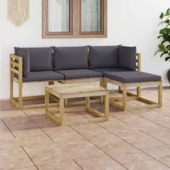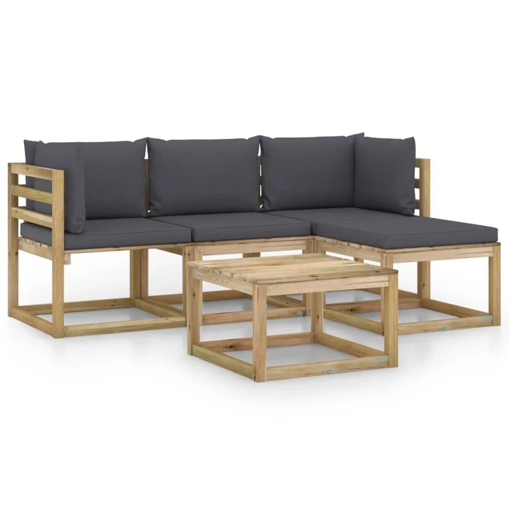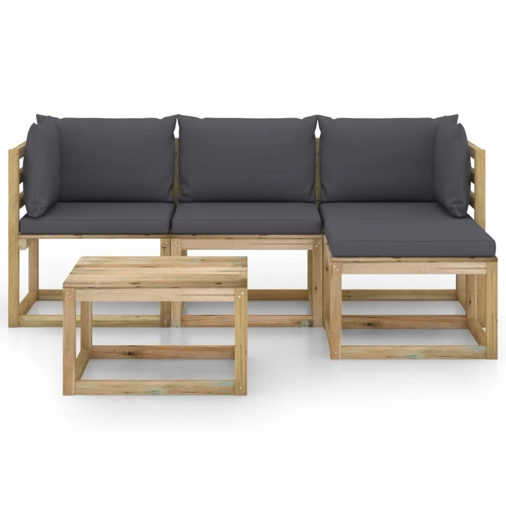 Este juego de muebles para jardín de madera es una opción ideal para que te relajes y disfrutes del buen tiempo, eches una siesta o charles con tu familia o tus amigos. Con un diseño de palés atemporal, este juego de muebles agrega un toque de encanto rústico a tu hogar. El juego de salón está hecho de madera de pino impregnada, lo que lo hace duradero, resistente a la intemperie y respetuoso con el medio ambiente. Este conjunto de muebles tiene una construcción maciza y requiere poco mantenimiento. Gracias a la tapicería 100% poliéster y al grueso acolchado, los cojines incluidos son suaves y cómodos. Nota: Para prolongar la vida útil de los muebles de exterior, te recomendamos que los limpies con regularidad y no los dejes al aire libre sin protección innecesariamente.Limpiar: Usa una solución de jabón suaveAlmacenamiento: Si es posible, guarda el producto en un lugar fresco y seco en el interior. Si el producto se almacena al aire libre, protégelo con una funda impermeable. Limpia y seca el exceso de agua o nieve de las superficies planas después de una lluvia o nevada. Permite la ventilación para evitar daños relacionados con la humedad. Color de cojín: Gris antracitaMaterial del sofá: Madera de pino, verde impregnadoMaterial del cojín: Tela (100% poliésterDimensiones del sofá esquinero: 64 x 64 x 70 cm (ancho x profundo x altoDimensiones del sofá central: 60 x 64 x 70 cm (ancho x profundo x altoDimensiones del reposapiés/mesa: 60 x 60 x 36,5 cm (largo x ancho x altoDimensiones del cojín de asiento: 60 x 60 x 6 cm (ancho x profundo x altoDimensiones de cojín de respaldo: 60 x 38 x 13 cm (ancho x profundo x altoDimensiones de cojín lateral: 55,5 x 38 x 13 cm (ancho x profundo x altoPeso de la tela: 120 g/m²Anchura de asiento: 60 cmProfundidad del asiento: 60 cmAltura del asiento desde el suelo: 36 cmRequiere montaje: SíLa entrega incluye:2 x Sofás de esquina1 x Sofá central1 x Reposapiés1 x Mesa4 x Cojines de asiento3 x Cojines de respaldo2 x Cojines laterales