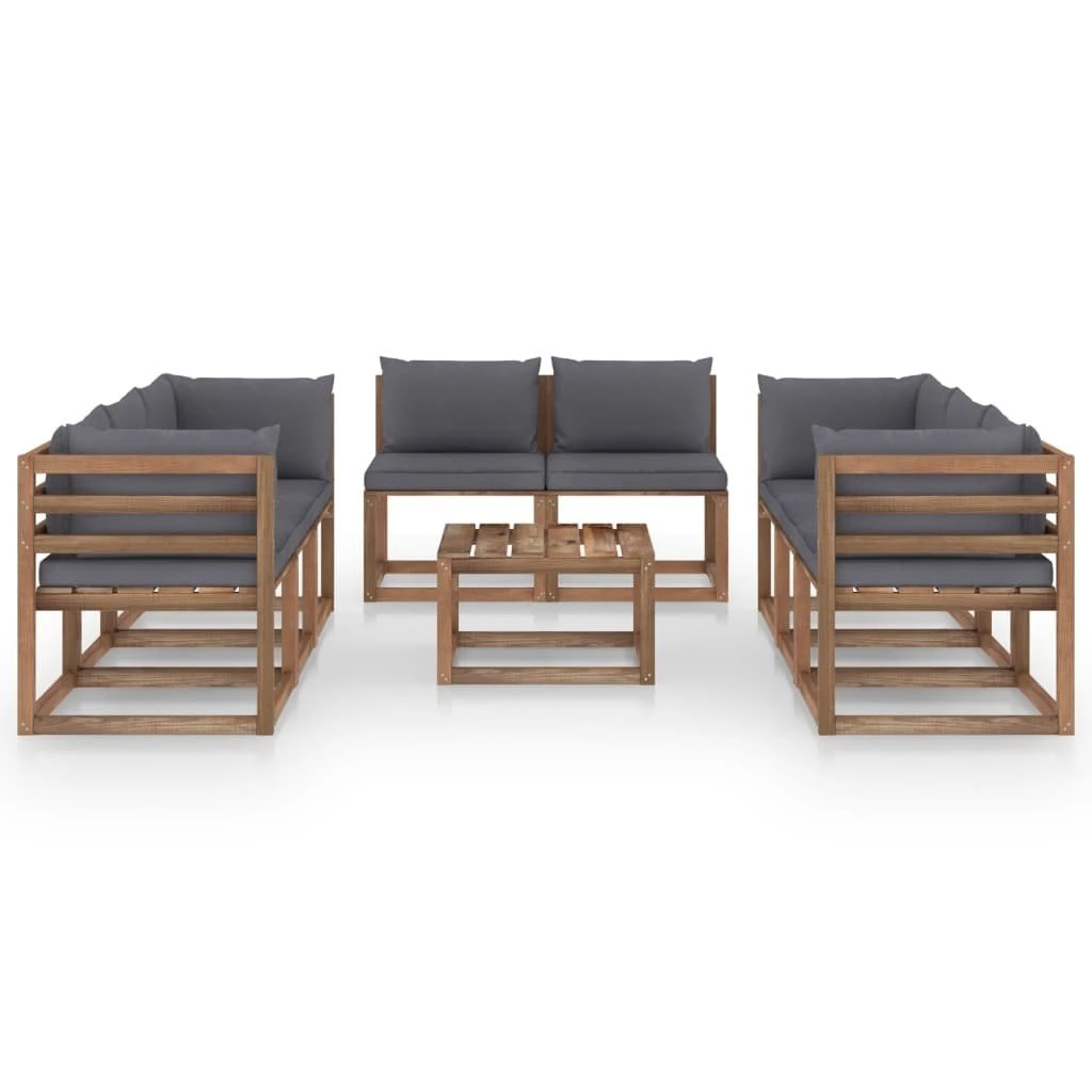 Este juego de muebles de jardín es una excelente opción para relajarte y disfrutar del buen tiempo, echar una siesta o charlar con tu familia o amigos. El conjunto de jardín está hecho de madera maciza de pino, lo que lo hace robusto y estable. ¡Puedes combinarlo con otros segmentos modulares para crear tus propias configuraciones de set de salón de jardín personal! Nota: Para prolongar la vida útil de los muebles de exterior, te recomendamos que los limpies con regularidad y no los dejes al aire libre sin protección innecesariamente.Limpieza: Usa una solución de jabón suaveAlmacenamiento: Si es posible, guarda el producto en un lugar fresco y seco en el interior. Si el producto se almacena al aire libre, protégelo con una funda impermeable. Limpia y seca el exceso de agua o nieve de las superficies planas después de una lluvia o nevada. Permite la ventilación para evitar daños relacionados con la humedad. Color de cojín: Gris antracitaMaterial: Madera de pino impregnada, tela (100% poliésterDimensiones de mesa: 60 x 60 x 36,5 cm (largo x ancho x altoDimensiones del sofá central: 60 x 64 x 70 cm (ancho x profundo x altoDimensiones del sofá esquinero: 64 x 64 x 70 cm (ancho x profundo x altoDimensiones del cojín de asiento: 60 x 60 x 6 cm (largo x ancho x grosorDimensiones de cojín de respaldo: 60 x 38 x 13 cm (largo x ancho x grosorDimensiones de cojín lateral: 55,5 x 38 x 13 cm (largo x ancho x grosorRequiere montaje: SíLa entrega incluye:1 x Mesa4 x Sofás centrales4 x Sofás de esquina8 x Cojines de asiento8 x Cojines de respaldo4 x Cojines laterales