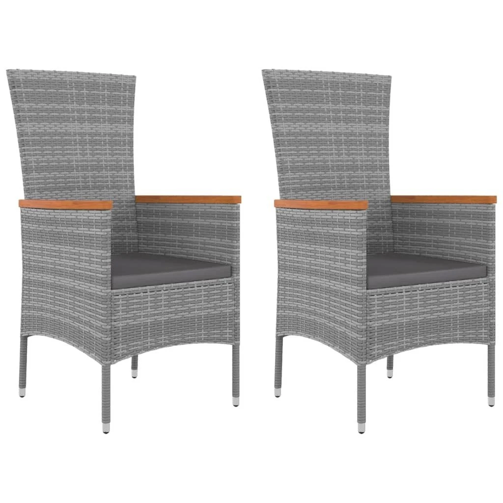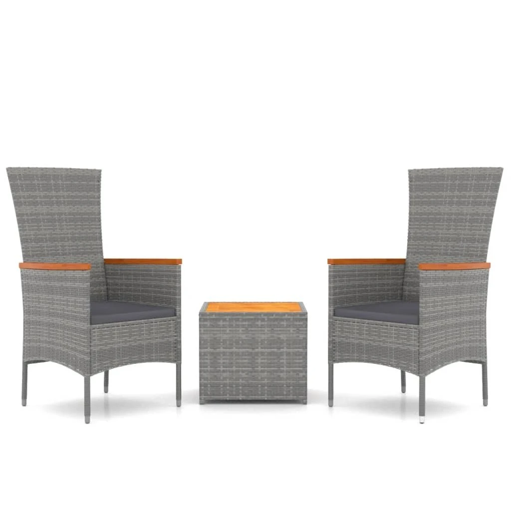 Este conjunto de muebles de exterior, con un diseño elegante y moderno, es una gran opción para relajarse en el jardín. Material duradero: El ratán PE, también conocido como ratán sintético, es resistente a la intemperie y fácil de limpiar. La parte exterior se mantiene hermosa durante mucho tiempo. Ofrece una gran calidad, comodidad y aspecto estético.Estructura estable: El acero es un material muy duro y fuerte. Ofrece solidez y estabilidad.Cómodo asiento: Con los cojines de asiento bien acolchados, las sillas resultan muy cómodas.Tablero práctico: La superficie de madera maciza de acacia es perfecta para colocar o exhibir tus cosas. Es bonita y fácil de limpiar. Nota:Para asegurarte de que tus muebles de exterior se mantengan hermosos, recomendamos protegerlos con una funda impermeable. Información útil:Para facilitar al máximo el montaje, cada producto se entrega con un manual. Silla de jardín:Color: GrisMaterial: Ratán PE, acero, madera maciza de acacia con acabado de aceiteDimensiones totales: 60 x 58 x 108 cm (ancho x profundo x altoDimensiones del asiento: 47 x 45 cm (ancho x profundoAltura del asiento desde el suelo: 44 cmAltura del reposabrazos desde el suelo: 66 cmMesa:Color: GrisMaterial: Ratán PE, acero con recubrimiento en polvo, madera maciza de acacia con acabado de aceiteDimensiones: 45 x 45 x 40 cm (ancho x profundo x altoCojín:Color: Gris oscuroMaterial de la funda del cojín de asiento: Tela (100% poliésterMaterial del relleno del cojín de asiento: EspumaGrosor del cojín del asiento: 4 cmLa entrega incluye:2 x Sillas de jardín1 x Mesa2 x Cojines de asiento