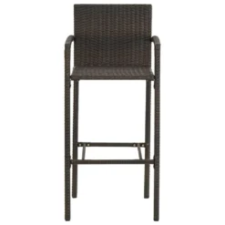 Este elegante juego de bar en el jardín te proporciona un momento agradable y cómodo con tu familia y amigos. La mesa de bar tiene una estructura de acero con recubrimiento en polvo, por lo que es estable y robusta. La superficie es ideal para colocar bebidas, comida o algunos elementos decorativos. Los taburetes tienen una construcción fuerte de estructura de acero, están hechos de ratán PE resistente a la intemperie, garantizan la estabilidad y son fáciles de mover. El reposapiés también aporta un plus de comodidad al taburete. Color: MarrónMaterial: Ratán PE, acero con recubrimiento en polvoDimensiones de la mesa: 60,5 x 60,5 x 110,5 cm (largo x ancho x altoDimensiones de la silla: 52 x 56 x 118 cm (ancho x profundo x altoDimensiones del asiento: 46 x 46 cm (ancho x profundoAltura del asiento desde el suelo: 80 cmAltura del reposapiés desde el suelo: 33 cmRequiere montaje: SíLa entrega incluye:1 x Mesa de bar4 x Taburetes de bar