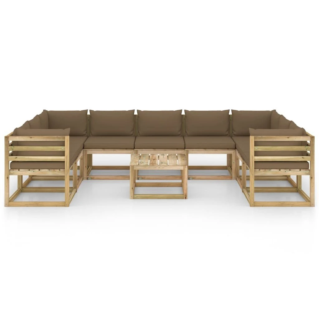 Este juego de muebles para jardín está pensado para ser la opción ideal para relajarse y disfrutar del buen tiempo, echar una siesta o charlar con tu familia o amigos. Con un diseño de palés atemporal, el conjunto de sofás de madera añade un toque de encanto rústico a tu patio, jardín o sala de estar. Hecho de madera de pino impregnada, el juego de muebles de palés es duradero, resistente a la intemperie y respetuoso con el medio ambiente. Este set de sofás de exterior tiene una estructura maciza y requiere poco mantenimiento. Con cojines blandos y bien acolchados (no incluidos, el juego de sofás te brinda la máxima comodidad. Además, el diseño modular te permite colocar el conjunto de la forma que más te guste. Nota: Para prolongar la vida útil de los muebles de exterior, te recomendamos que los limpies con regularidad y no los dejes al aire libre sin protección innecesariamente.Limpiar: Usa una solución de jabón suaveAlmacenamiento: Si es posible, guarda el producto en un lugar fresco y seco en el interior. Si el producto se almacena al aire libre, protégelo con una funda impermeable. Limpia y seca el exceso de agua o nieve de las superficies planas después de una lluvia o nevada. Permite la ventilación para evitar daños relacionados con la humedad. Color de cojín: Gris taupeMaterial: Madera de pino verde impregnadaMaterial del cojín: Tela (100% poliésterDimensiones del sofá esquinero: 64 x 64 x 70 cm (ancho x profundo x altoDimensiones del sofá central: 60 x 64 x 70 cm (ancho x profundo x altoDimensiones de la mesa: 60 x 60 x 36,5 cm (ancho x profundo x altoGrosor del cojín del asiento: 6 cmGrosor del cojín del respaldo/lateral: 13 cmRequiere montaje: SíLa entrega incluye:4 x Sofás de esquina5 x Sofás centrales1 x Mesa9 x Cojines de asiento13 x Cojines traseros/laterales