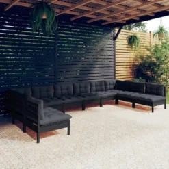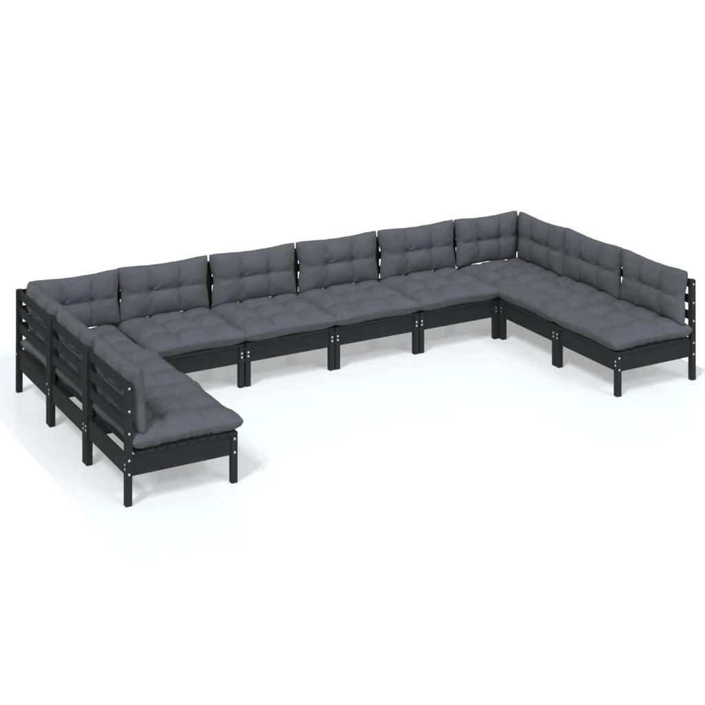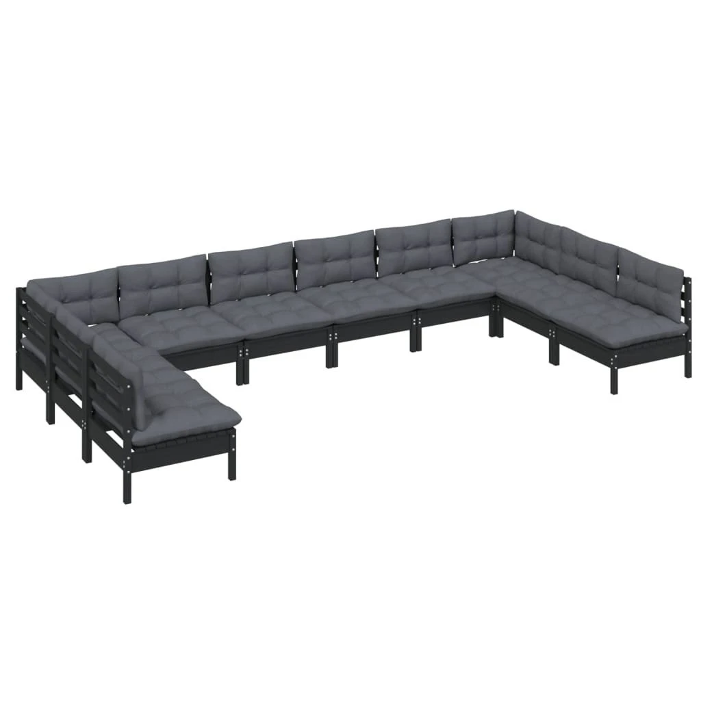 Este juego de muebles de jardín es una excelente opción para relajarte y disfrutar del buen tiempo, echar una siesta o charlar con tu familia o amigos. El conjunto de muebles de jardín está hecho de madera maciza de pino, lo que lo hace robusto y estable. ¡Puedes combinarlo con otros segmentos modulares para crear tus propias configuraciones de set de salón de jardín personal! Nota: Para prolongar la vida de tus muebles de exterior, te recomendamos que los protejas con una funda impermeable. Color: NegroColor de cojín: Gris antracita oscuroMaterial: Madera maciza de pino, tela (100% poliésterDimensiones del sofá de esquina: 63,5 x 63,5 x 62,5 cm (ancho x profundo x altoDimensiones del sofá central: 63,5 x 63,5 x 62,5 cm (ancho x profundo x altoDimensiones del cojín de asiento: 60 x 60 x 5 cm (largo x ancho x grosorDimensiones del cojín de respaldo: 60 x 32 x 5 cm (largo x ancho x grosorRequiere montaje: SíLa entrega contiene:2 x Sofás esquineros8 x Sofás centrales10 x Cojines de asiento12 x Cojines de respaldo