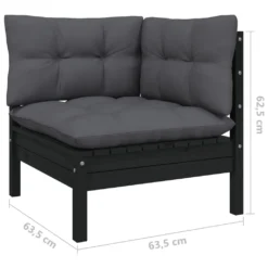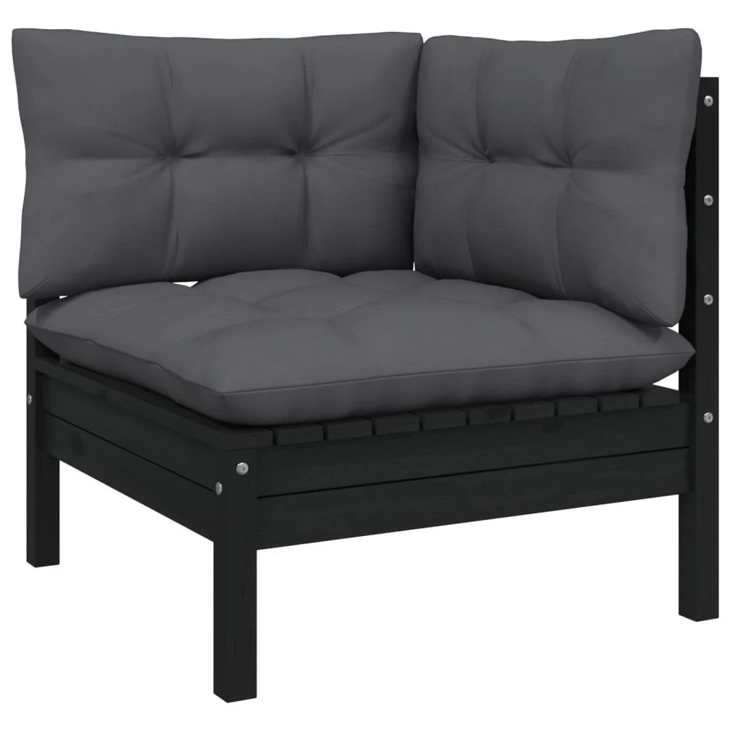 Este juego de muebles de jardín de madera es una excelente opción para relajarte y disfrutar del buen tiempo, echar una siesta o charlar con tu familia o amigos. El conjunto de muebles de jardín está hecho de madera maciza de pino, lo que lo hace robusto y estable. ¡Puedes combinarlo con otros segmentos modulares para crear tus propias configuraciones de set de salón de jardín personal! Nota: Para prolongar la vida útil de los muebles de exterior, te recomendamos que los limpies con regularidad y no los dejes al aire libre sin protección innecesariamente.Limpia: Usa una solución de jabón suaveAlmacenamiento: Si es posible, guárdalos en un lugar fresco y seco en el interior. Si el producto se almacena al aire libre, protégelo con una funda impermeable. Limpia y seca el exceso de agua o nieve de las superficies planas después de una lluvia o nevada. Permite la ventilación para evitar daños relacionados con la humedad. Color: NegroColor de cojín: Gris antracitaMaterial: Madera maciza de pino, tela (100% poliésterDimensiones del sofá de esquina/medio: 63,5 x 63,5 x 62,5 cm (ancho x profundo x altoDimensiones del reposapiés/mesa: 63,5 x 63,5 x 28,5 cm (ancho x profundo x altoDimensiones del cojín de asiento: 60 x 60 x 5 cm (largo x ancho x grosorDimensiones del cojín de respaldo/lateral: 60 x 32 x 5 cm (largo x ancho x grosorRequiere montaje: SíLa entrega incluye:4 x Sofás de esquina7 x Sofás centrales2 x Reposapiés/mesa13 x Cojines de asiento15 x Cojines traseros/laterales