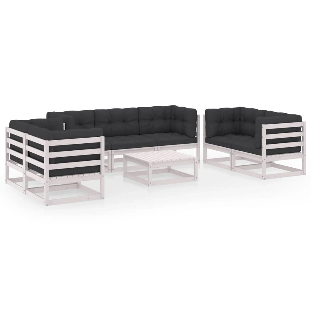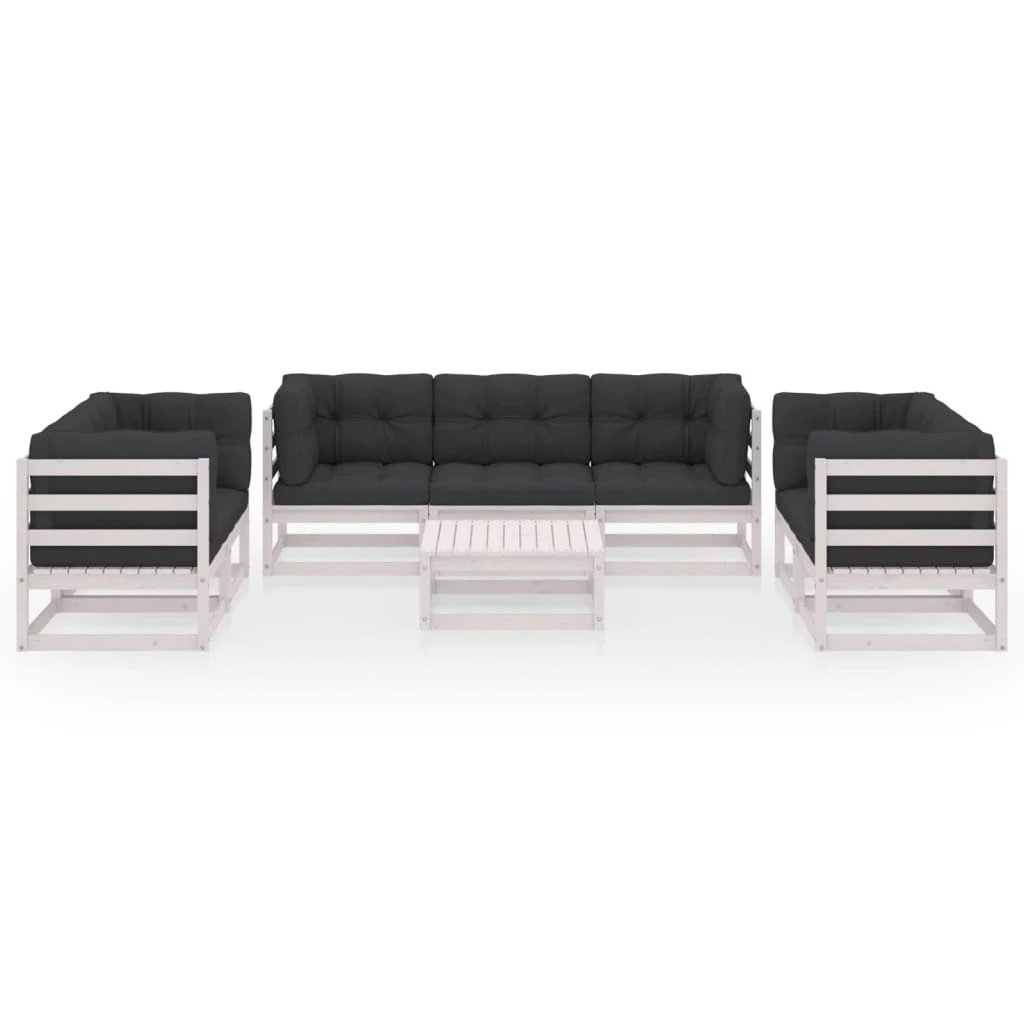 Este juego de muebles de jardín es una excelente opción para relajarte y disfrutar del buen tiempo, echar una siesta o charlar con tu familia o amigos. El conjunto de jardín está hecho de madera maciza de pino, lo que lo hace robusto y estable. ¡Puedes combinarlo con otros segmentos modulares para crear tus propias configuraciones de set de salón de jardín personal! Nota: Para prolongar la vida de tus muebles de exterior, te recomendamos que los protejas con una funda impermeable. Color: BlancoColor de cojín: Gris antracita oscuroMaterial: Madera maciza de pino, tela (100% poliésterDimensiones del sofá medio/esquinero: 70 x 70 x 67 cm (ancho x profundo x altoDimensiones: 70 x 70 x 30 cm (ancho x profundo x altoDimensiones del cojín del asiento: 70 x 70 x 8 cm (largo x ancho x grosorDimensiones del cojín de respaldo/lateral: 70 x 40 x 8 cm (largo x ancho x grosorRequiere montaje: SíLa entrega contiene:1 x Sofá central6 x Sofás esquineros1 x Mesa7 x Cojines de asiento13 x Cojines traseros/laterales