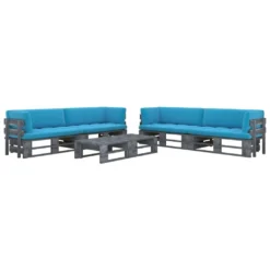 Este juego de muebles de palés de madera está pensado para ser la opción ideal para relajarse y disfrutar del buen tiempo, echar una siesta o charlar con tu familia o amigos. Con un diseño de palets atemporal, el conjunto de sofás de jardín añade un toque de encanto rústico a tu patio, jardín o sala de estar. Hecho de madera de pino impregnada, el conjunto de muebles de exterior es duradero, resistente a la intemperie y respetuoso con el medio ambiente. Este juego de salón de jardín tiene una construcción maciza y requiere poco mantenimiento. Junto con el cojín incluido, este juego de sofás de madera proporciona la máxima comodidad para ti y tus invitados. Nota: Para prolongar la vida útil de los muebles de exterior, te recomendamos que los limpies con regularidad y no los dejes al aire libre sin protección innecesariamente.Limpieza: Usa una solución de jabón suave.Almacenamiento: Si es posible, guarda el producto en un lugar fresco y seco en el interior. Si el producto se almacena al aire libre, protégelo con una funda impermeable. Limpia y seca el exceso de agua o nieve de las superficies planas después de una lluvia o nevada. Permite la ventilación para evitar daños relacionados con la humedad. Color del cojín: AzulMaterial: Madera de pino impregnada de grisMaterial del cojín: Tela (100% poliésterDimensiones de mesa: 60 x 60 x 25 cm (ancho x profundo x altoDimensiones del sofá de la esquina: 110 x 65 x 55 cm (ancho x profundo x altoAltura del asiento desde el suelo: 25 cmGrosor del cojín: 10 cmEl reposabrazos se puede montar tanto en el lado izquierdo como en el derechoAdecuado tanto para el interior como el exteriorRequiere montaje: SíLa entrega incluye:2 x Mesas4 x Sofás de esquina4 x Cojines de asiento4 x Cojines de respaldo4 x Cojines laterales