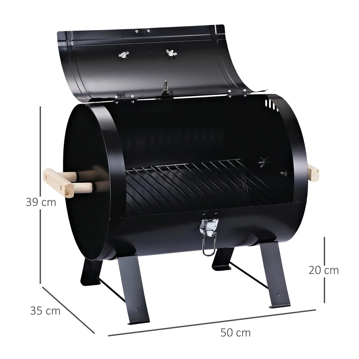 - – BARBACOA DE CARBÓN: Barbacoa de tamaño reducido y compacto ideal para usar sobre una mesa o superficie completamente plana al aire libre, como fiestas, campamentos, picnics y más – ASAS DE MADERA: Cuenta con 3 asas de madera, 2 en los laterales y otra en la tapa, para evitar quemaduras en las manos durante su uso, manejo o al transportarlas – PATAS Y CIERRE DE SEGURIDAD: Esta barbacoa está diseñada para colocarse sobre una mes o superficie y cuenta con 4 patas estables para ello. Tiene una tapa con cierre, para mayor seguridad al transportarla – TERMÓMETRO Y VENTILACIONES: Hecha de metal con tratamiento de electroforesis para garantizar su resistencia a altas temperaturas, cuenta con ventilaciones laterales para una mejor circulación del aire y un termómetro en la tapa para controlar la temperatura – MEDIDAS TOTALES: 50x35x39 cm (LxANxAL; Medidas del cuerpo principal: Ø40×30 cm (DiámxAL; Medidas de la parrilla: 29×19 cm (LxAN